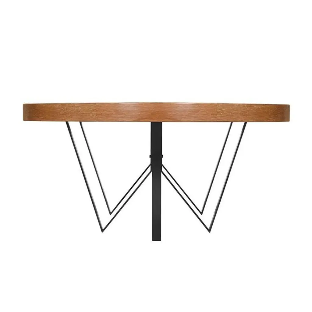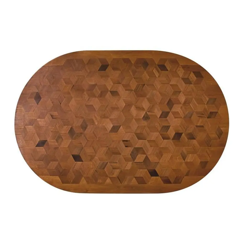 Inspired by the work of Escher, with Maurits we want to prove that a table doesn’t have to be antique to be an impressive testimony of craftsmanship. The marquetry table top in reclaimed Oak contains 381 rhombi cut from old Italian wine barrels. The brass legs compose a delicate inverse coronation. Handmade by master craftsmen in Tuscany, Italy.Standard base materials: black powder-coated iron and brass.Standard sizes:diameter 160 cm / 5'3" (suits 8 people)width 160 cm / 5'3" - length240 cm / 7'11" (suits 10 people)295 cm / 9'8" (suits 12 people)350 cm / 11'5" (suits 14 people)height 78 cm / 30.7"top thickness 10 cm / 3.9"This listing is for the oval version with black powder-coated iron legs, for the round version with iron or brass legs please see the dedicated listings.About Fred&Juul:Fred&Juul renew traditions by making customs and techniques reappear from the past while applying fine Italian craftsmanship to contemporary design. Founded by Italian-Dutch architects’ duo Federico Minarelli and Julie Janssen, the brand explores the possibilities of producing designs that are versatile and elegant while being exclusively handcrafted by local artisans from traditional materials like brass and solid wood. Fred&Juul’s design philosophy is aimed at sustainability and contrasting the throw-away society by creating pieces that will last, both for their exceptional quality and for their timeless appearance.Every piece is manufactured in small specialized workshops scattered around Tuscany. The designers manage the entire production process and have a direct relationship with the craftsmen and women, who are involved in the design process from the early stages. The result is contemporary collection that conjures up the refined artistry of centuries old craftsmanship.