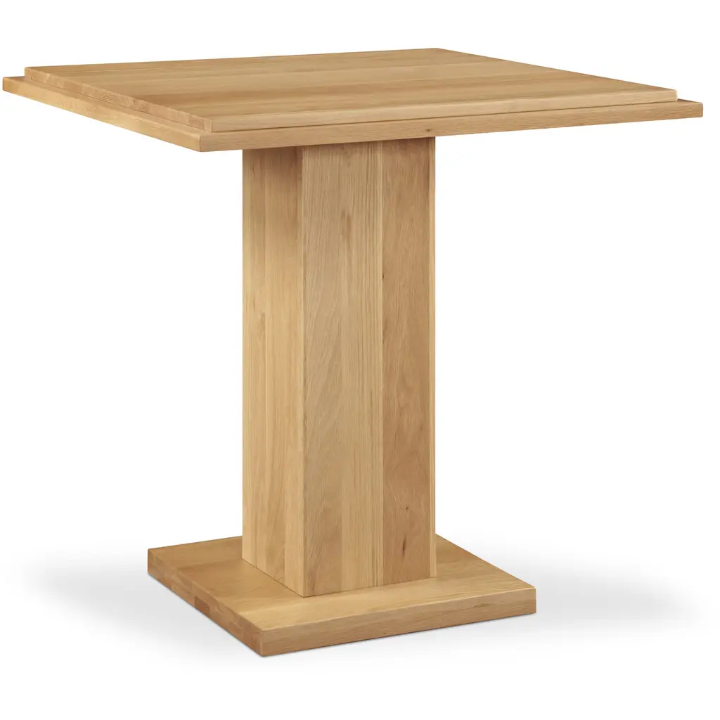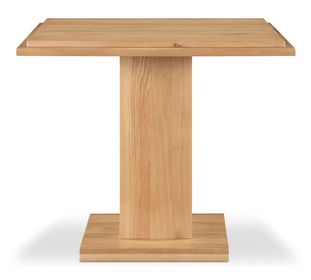 The May counter table's unique double square top and rectangular post leg create an intriguing visual harmony. Crafted from solid oak, the table exudes warmth and natural beauty. Subtle curves and angled edges offer ergonomic comfort, inviting lingering moments, effortlessly transitioning from cafe table to entryway accent.