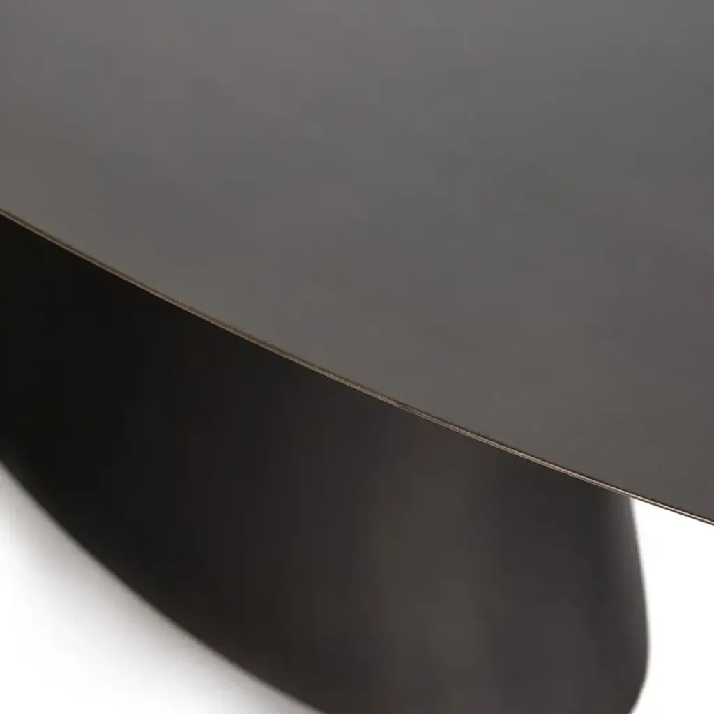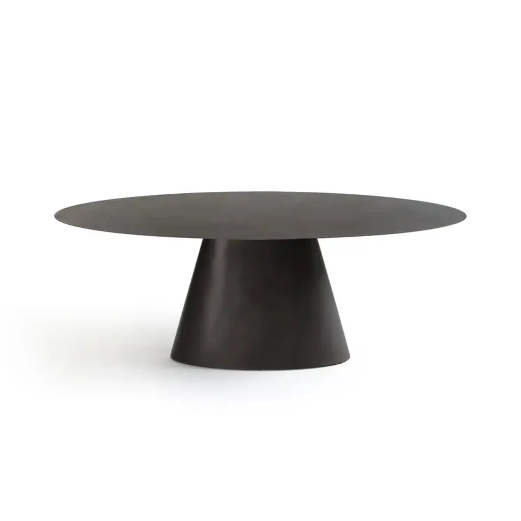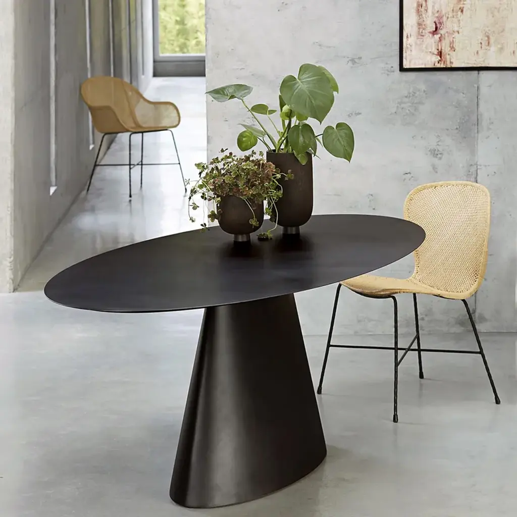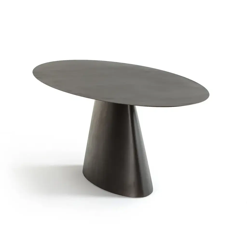 The Mayra table is characterised by its sublime ovoid top and its single conical central leg. the elliptical table features a gunmetal finish with a used effect.2 cm thick MDF top covered with 3 mm sheet metalConical central metal baseGunmetal effect finish, epoxy paintFor 6 place settings