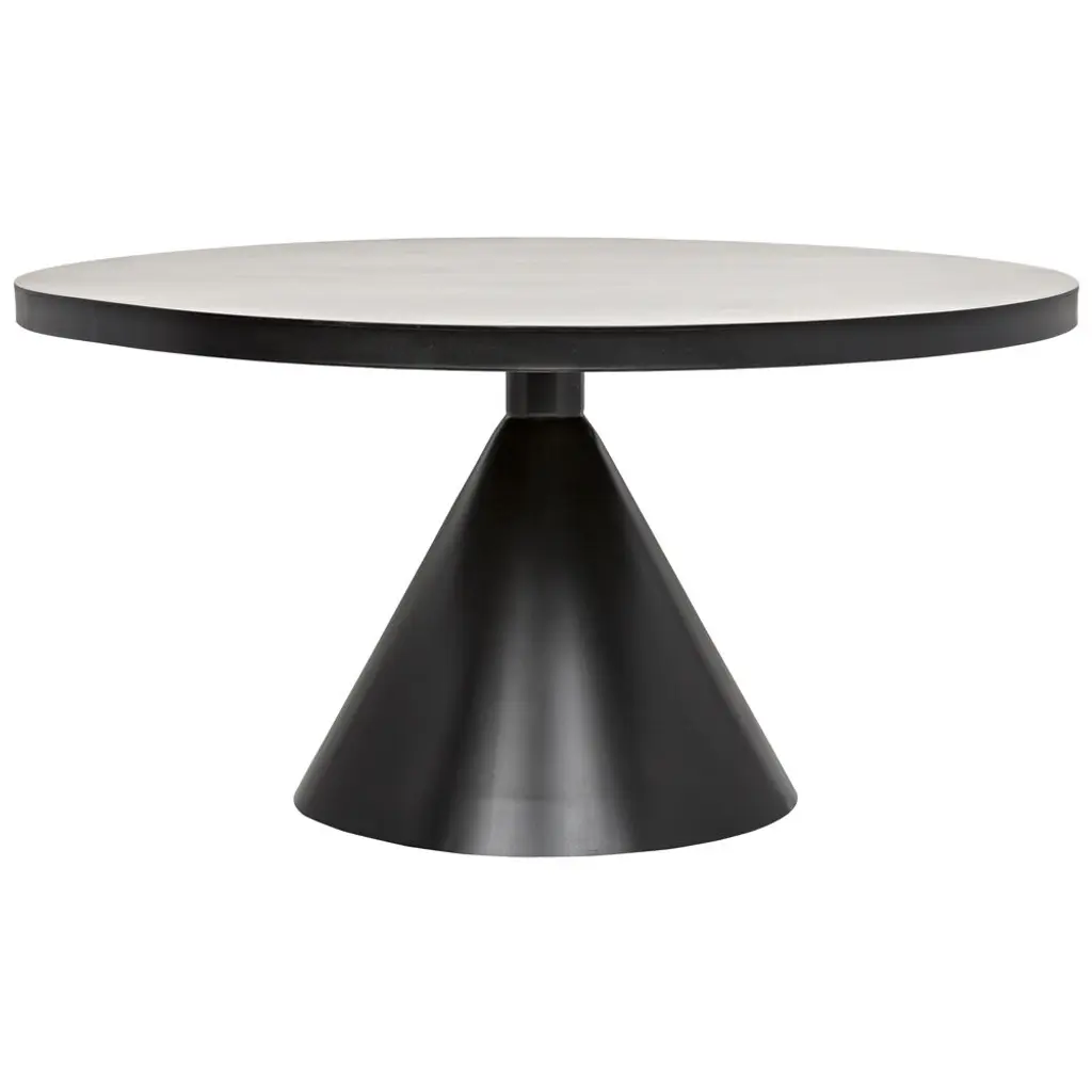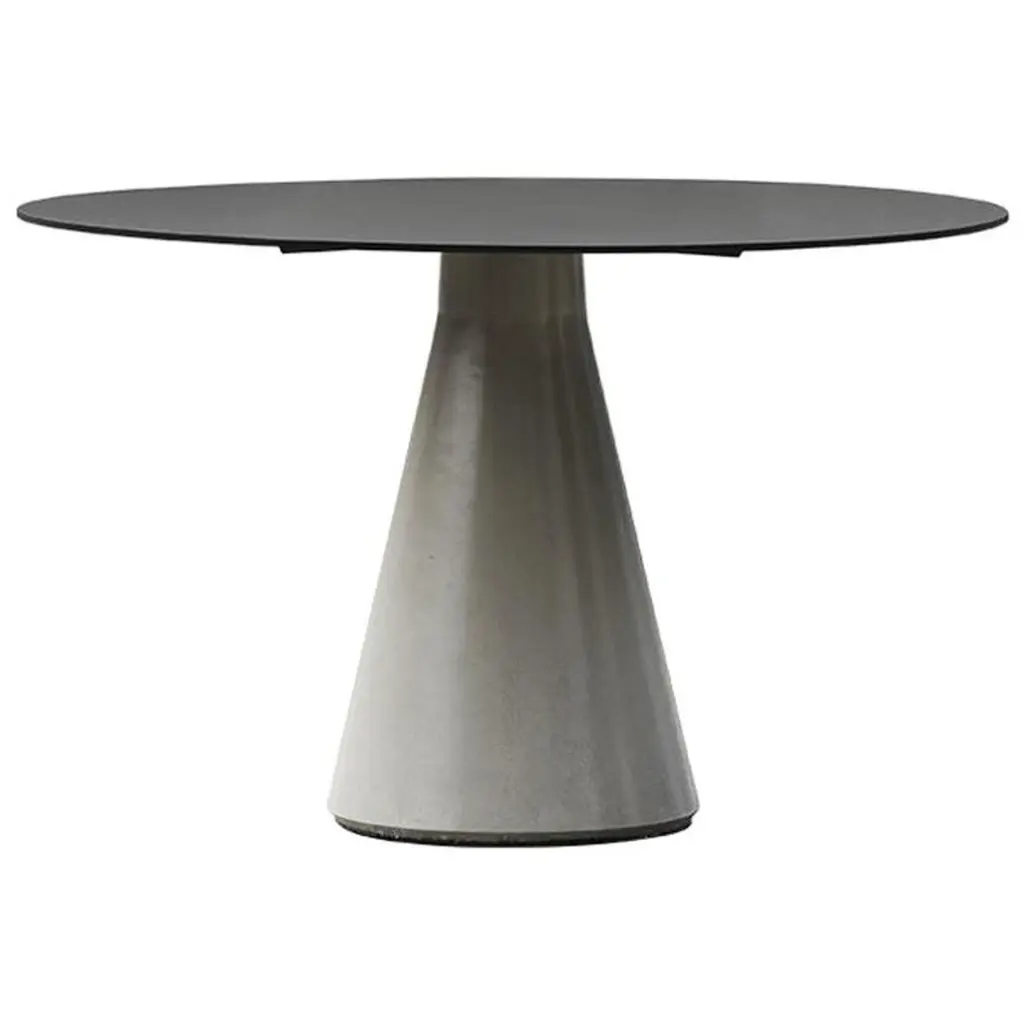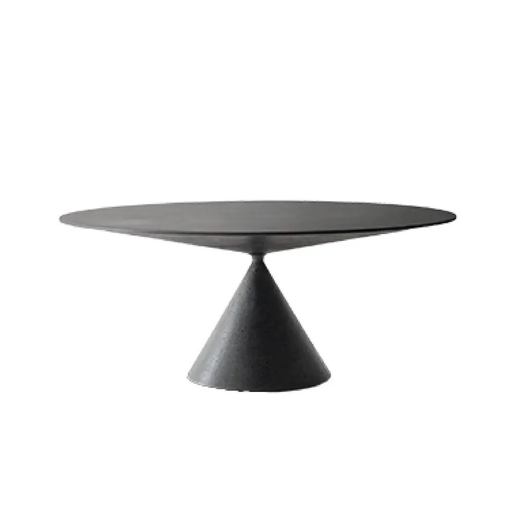 The Mayra table is characterised by the originality of its conical central base and its used-effect metal finish.2.5 cm thick MDF top covered with 3 mm sheet metalCentral metal baseGunmetal effect finish, epoxy paintFor 6 place settings