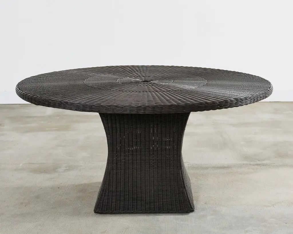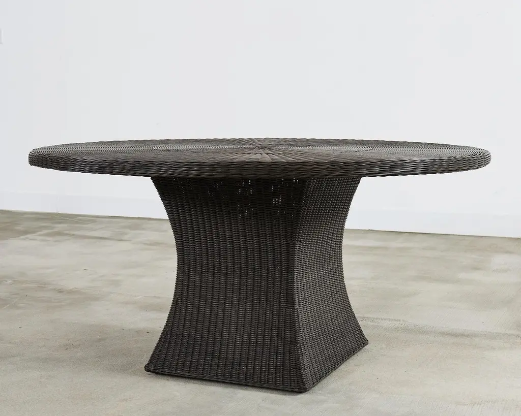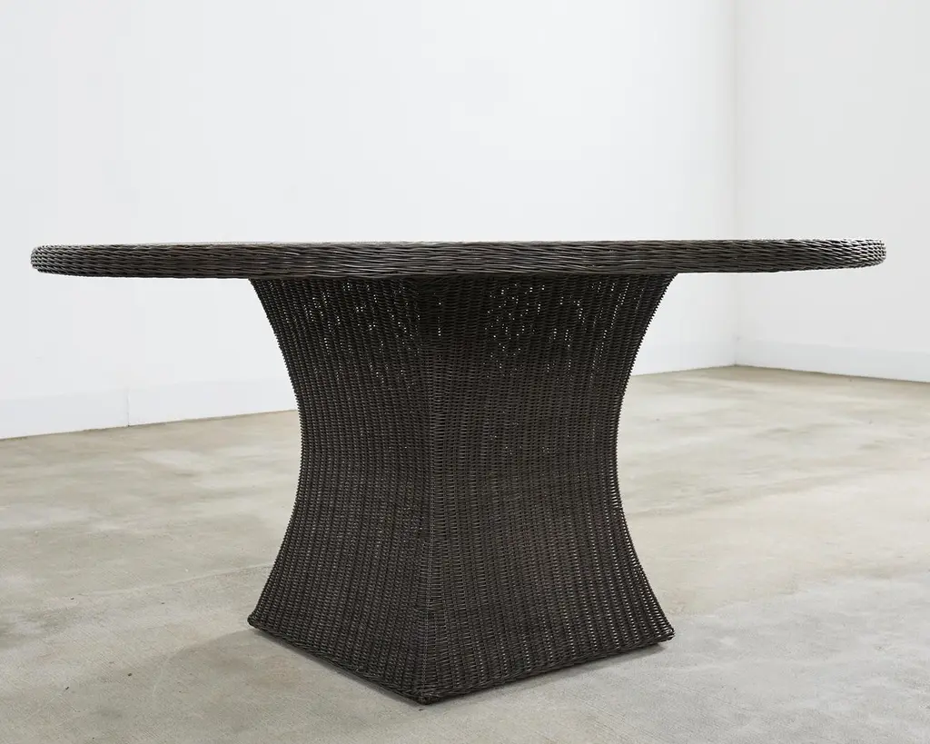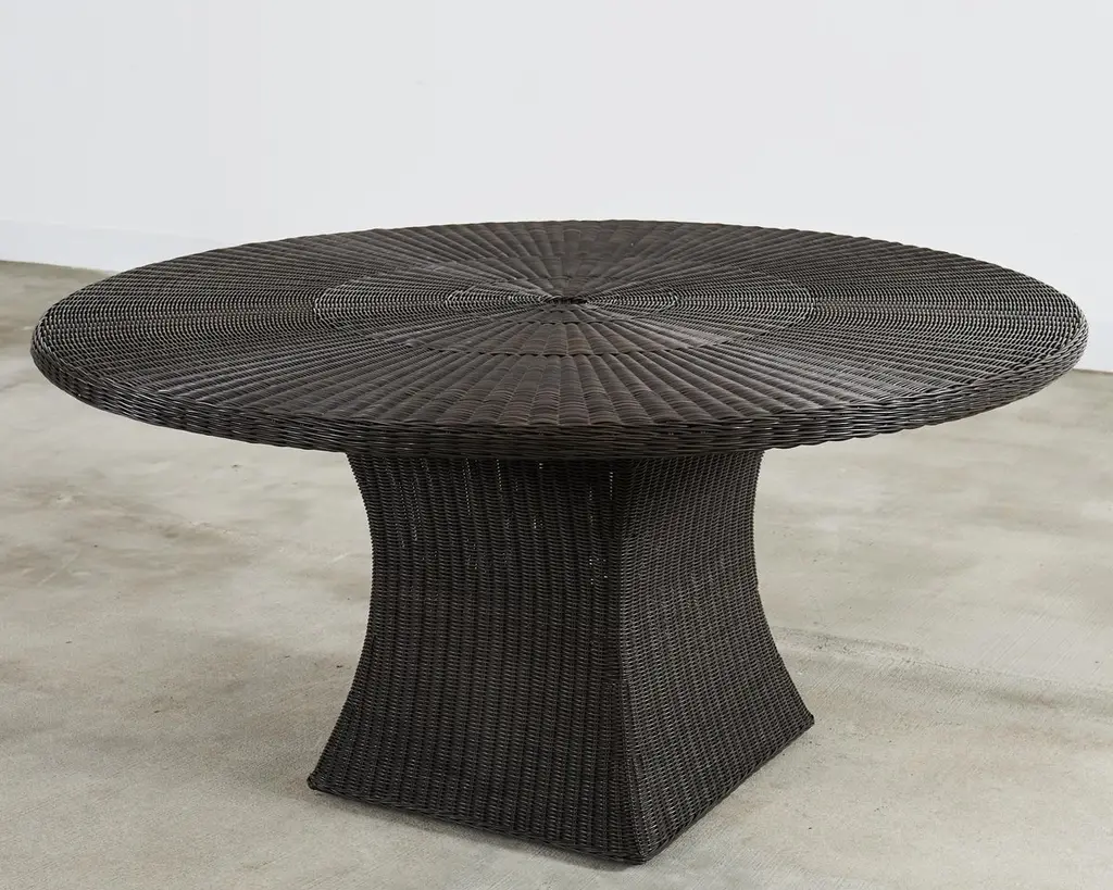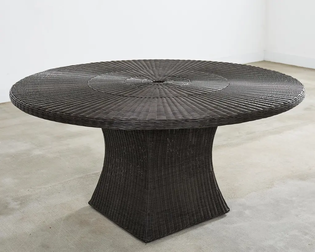 Amazing woven resin wicker patio and garden dining table designed by Thomas Pheasant for McGuire. The large round table has a 1.5 inch thick top supported by a square base with a subtle hour glass form. The table features a strong, steel frame covered with tight concentric wicker circles finished with a distinctive espresso dark tone. The center of the table has an umbrella hole and cap. Heavy and sturdy with excellent joinery and craftsmanship. The table disassembles into 2 pieces for storage. McGuire label on bottom and on steel umbrella cap. Price is for 1 table, there are 2 available.