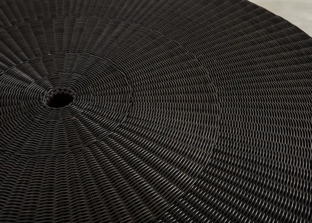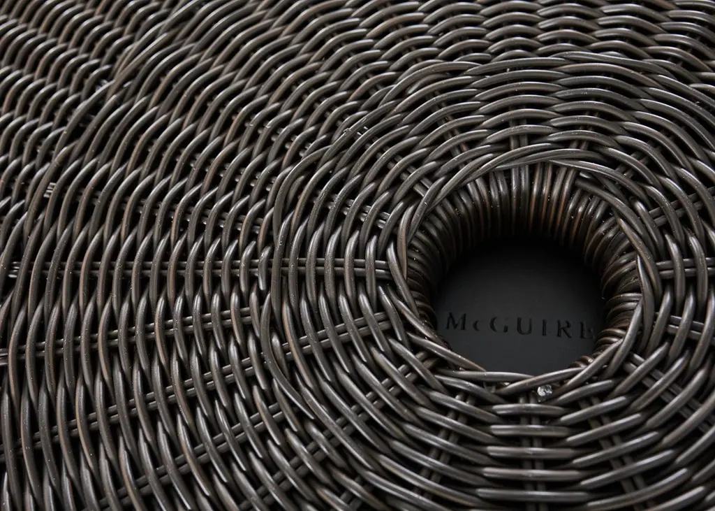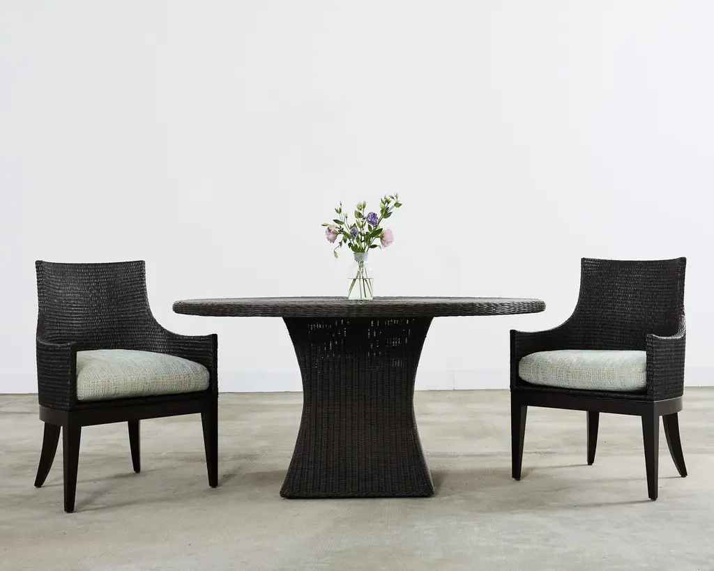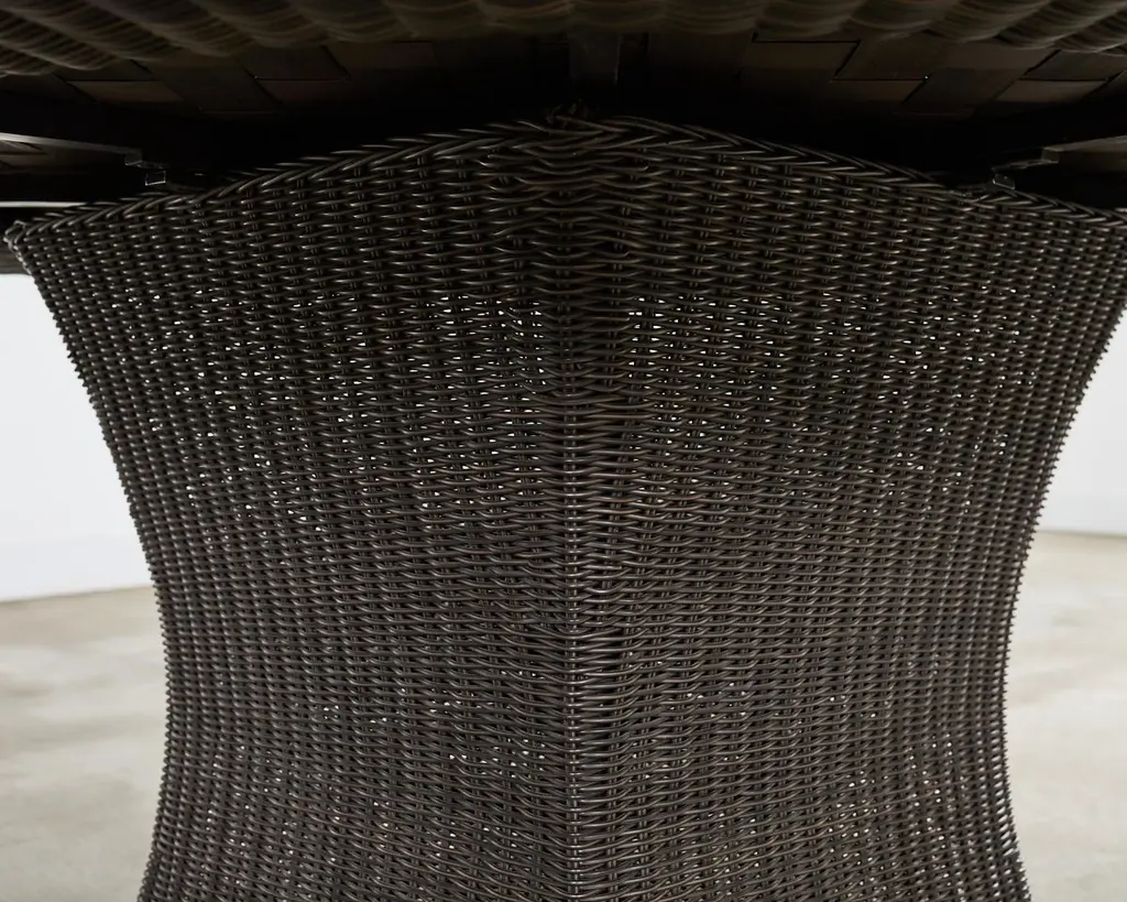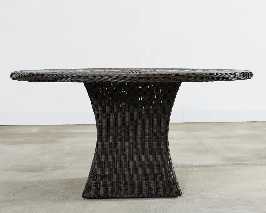 Amazing woven resin wicker patio and garden dining table designed by Thomas Pheasant for McGuire. The large round table has a 1.5 inch thick top supported by a square base with a subtle hour glass form. The table features a strong, steel frame covered with tight concentric wicker circles finished with a distinctive espresso dark tone. The center of the table has an umbrella hole and cap. Heavy and sturdy with excellent joinery and craftsmanship. The table disassembles into 2 pieces for storage. McGuire label on bottom and on steel umbrella cap. Price is for 1 table, there are 2 available.