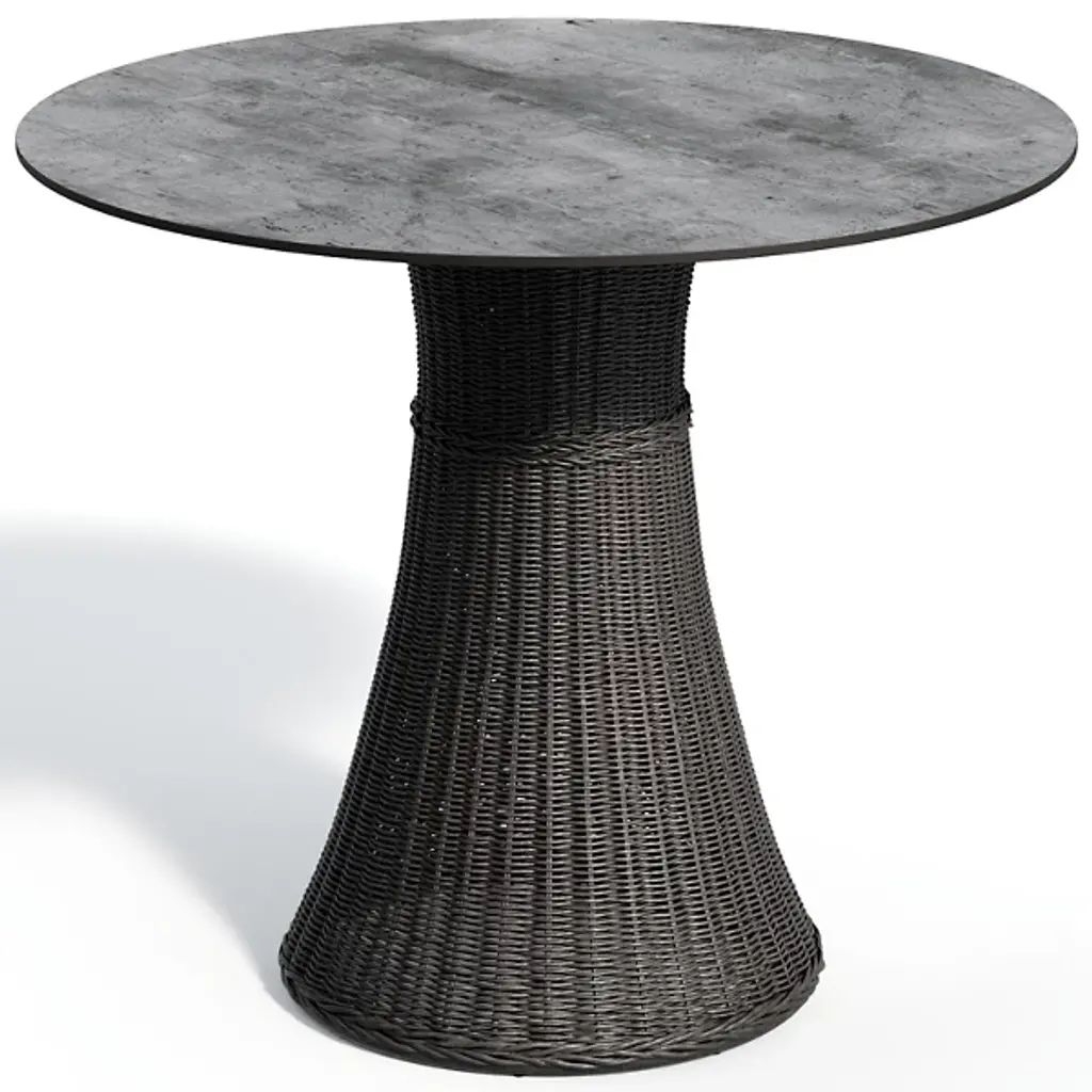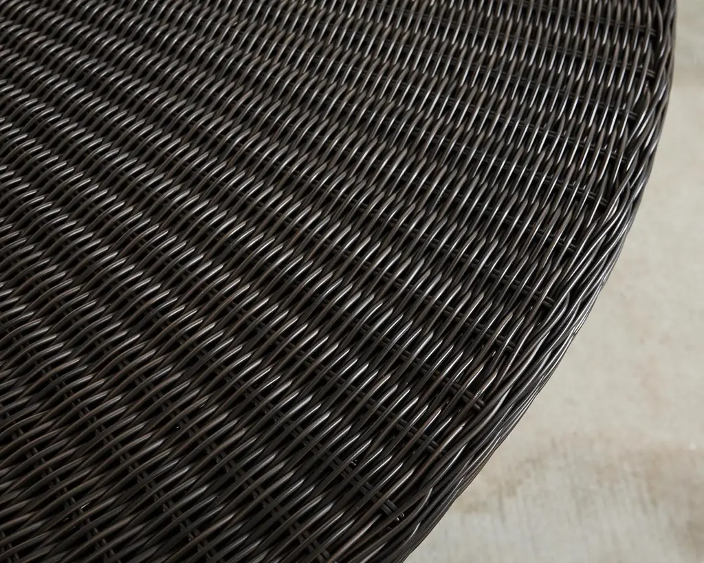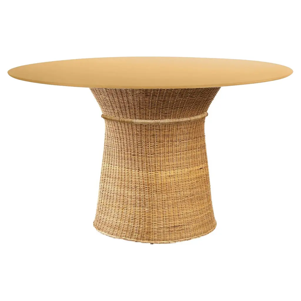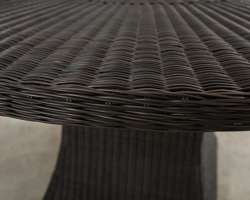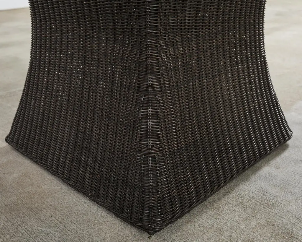 Amazing woven resin wicker patio and garden dining table designed by Thomas Pheasant for McGuire. The large round table has a 1.5 inch thick top supported by a square base with a subtle hour glass form. The table features a strong, steel frame covered with tight concentric wicker circles finished with a distinctive espresso dark tone. The center of the table has an umbrella hole and cap. Heavy and sturdy with excellent joinery and craftsmanship. The table disassembles into 2 pieces for storage. McGuire label on bottom and on steel umbrella cap. Price is for 1 table, there are 2 available.
