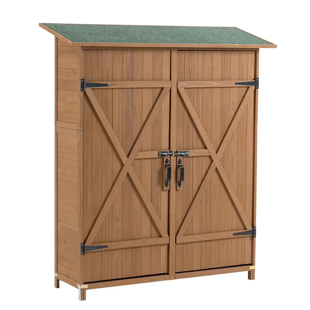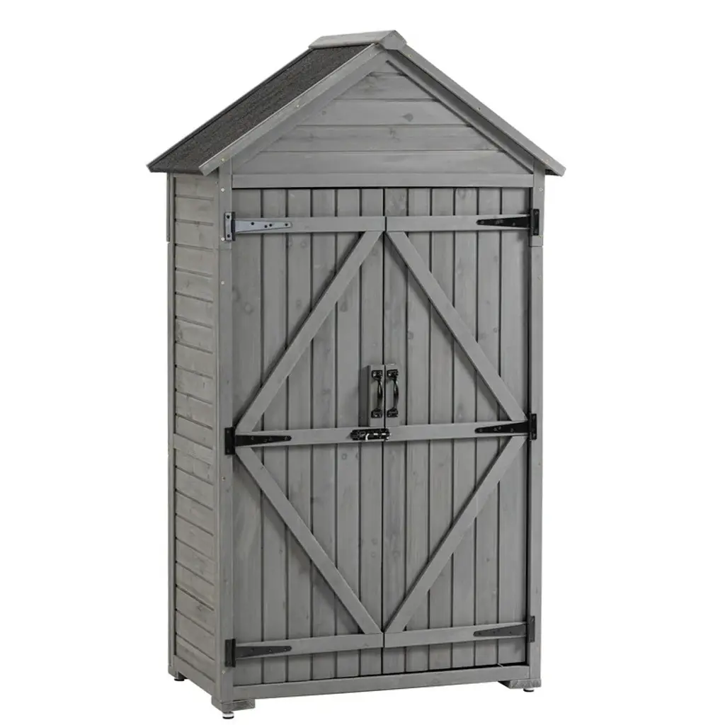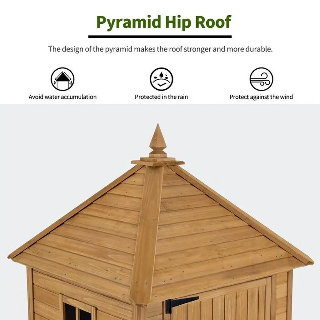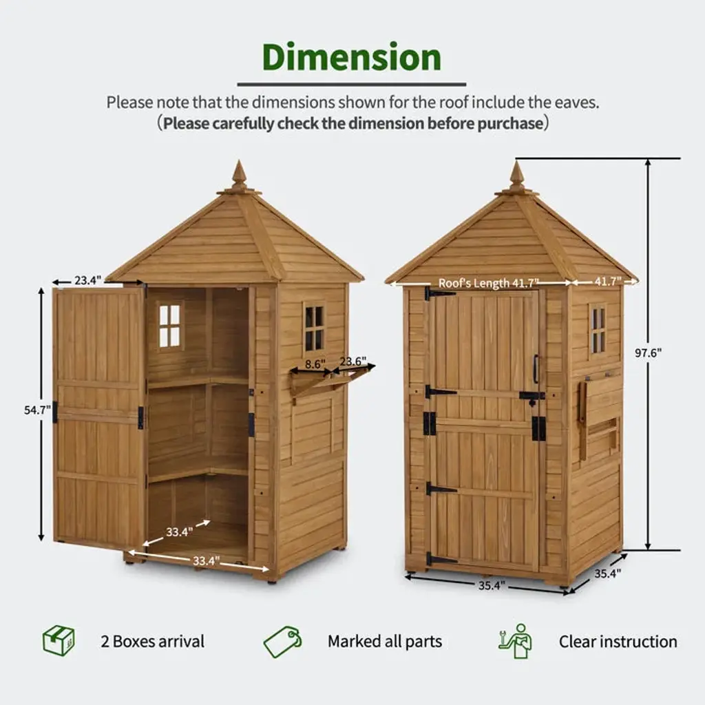 The wood outdoor storage cabinet shed can store most of your tools, such as watering can, water pipes, spades, pots, etc. Ending the messy garden life and tired back and forth. Own this MCombo outside wooden garden cabinet, enjoy a relaxing outdoor life!Key Features: Pyramid Hip Roof: 4 sides sloping roofs are made of solid wood pieced together. The unique design of the backyard shed roof effectively prevents the accumulation of water and snow.3 Sided Storage Shelves: This wooden shed has 6 shelves, both of the middle shelves can be folded, whether small tools or large tools can be stored, they can meet a variety of storage needs.2 Foldable Tables: There are 2 small folding tables on the outdoor storage cabinet that can be used very flexibly for storing flowerpots, seeds, tools etc.4 Metal Brackets & 2 Anti-falling Devices: Our tall outside cabinet is equipped with 4 reinforced metal ground brackets and 2 anti-fall devices for enhanced stability and safety.Fir Solid Wood: The tool shed is made of high-quality pure fir wood, and the exterior has been polished to express a rustic style. Natural Color blends easily with other décor and natural settings.Buyer ReadingRequire assemblyPackage quantity: 2Please carefully check the dimension before purchase.Item SpecificationsItem name: Outdoor Storage CabinetType: 6056-2645Material: Fir WoodOverall Dimension: 35.4" x 35.4" x 97.6"How to solve any issue of the product?Please feel free to contact us, we will reply to you within 24 hours.Our customer support doesn't end with your purchase!