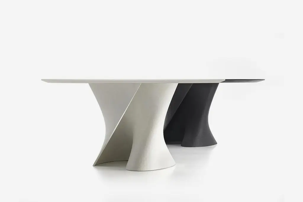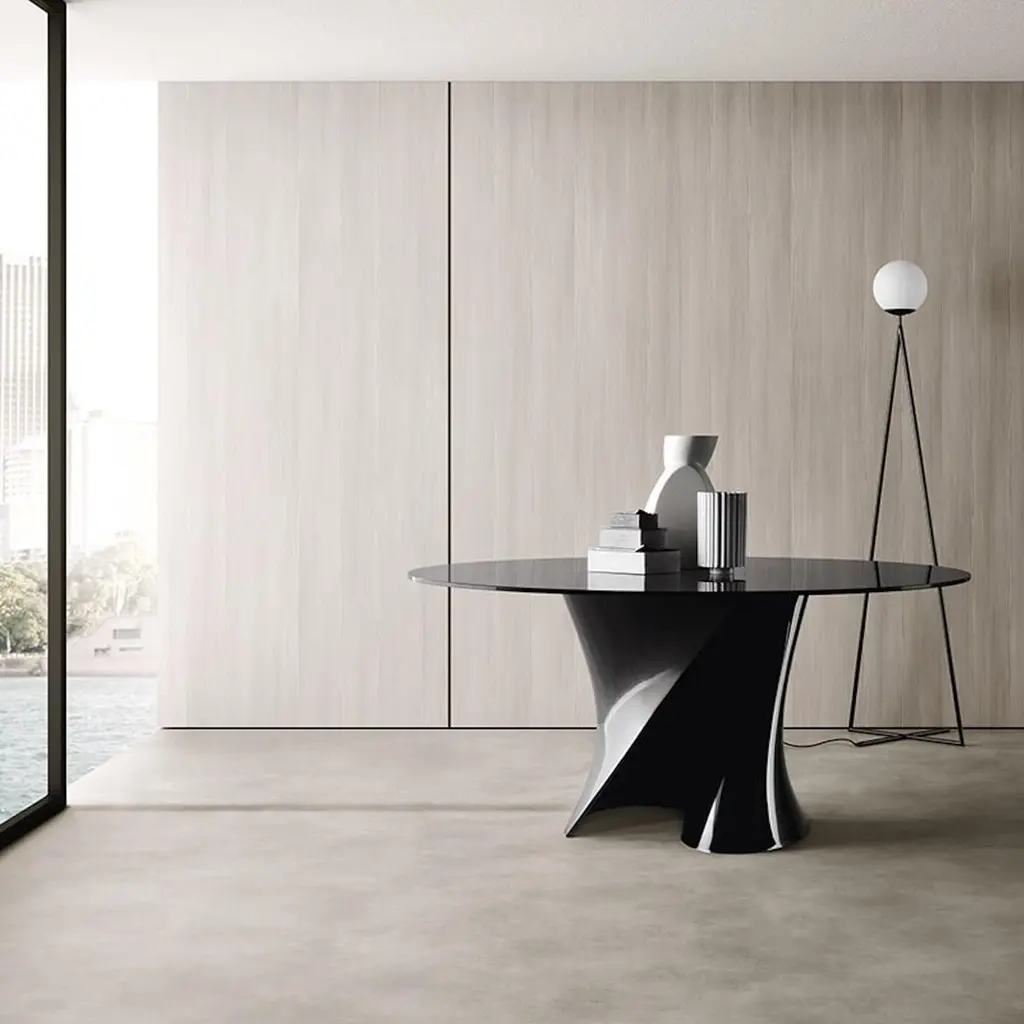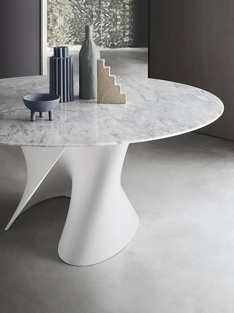 OVAL OR ROUND.Glass or MarbleA sound that reminds a shape, a name that speaks for itself: S Table, in which the liquid consonant perfectly tells about the twisted S-shaped stand of this table designed by Xavier Lust. The creations of award-winning designer actually stand out for the visible tension he gives to his objects, featuring curves inspired by the (de)formation process of metallic surfaces that identifies his whole creative path.The stand, moulded either in Ceramilux or in Cristalplant, technologically advanced, hypoallergenic and non-toxic material, can be crowned by different types of top – in crystal, in wood fiber, marble, in reconstructed stone or in Cristalplant – to further customise an already unique object.This design table’s communication strength is remarkable, in any kind of space.BASESCRISTALPLANT® BASEIt is a unique highlyadvanced composite material made up of a high percentage of natural minerals (ATH derived from bauxite) and a small percentage of extremely pure polyester and acrylic polymers; thus it is an inert hypoallergenic and non-toxic material. CRISTALPLANT® is a 100% made-in-Italy solid surface and is 100% recyclable.CERAMILUX® BASEIt is a material composed of natural minerals (calcium carbonates and aluminium trihydrates) and polyester resin. The gelcoat film coating the surface of the material is made of a highly-resistant acrylate polyester.RECONSTRUCTED STONE It is obtained from a blend of mineral powders that have been micronized and mixed with liquid acrylic and water-based products, giving it a material essence. The finishes are applied manually with a palette knife over theentire surface of the table, creating a one-of-a-kind texture that characterises each and every product, both to the eye and to the touch. Finishes: Reconstructed stone white calce and black slate.TOP/STAND COMBINATIONSTOPS FOR WHITE STAND:• Clear or extra clear glass, 15 mm thickness;• Clear or extra clear tempered glass, 15 mm thickness;• Matt lacquered white MD wood finish, thickness 30mm;• Matt white Cristalplant®;• Matt or gloss Namibia white marble, matt or gloss Carrara white marble and matt or gloss Bardiglio medium grey marble. Thickness 20 mm and top support 16mm;• Reconstructed stone white calce.TOPS FOR BLACK STAND:• Tempered smoked grey glass, 12 mm thickness;• Sahara matt black marble, thickness 20 mm and top support 16mm;• Reconstructed stone black slate.