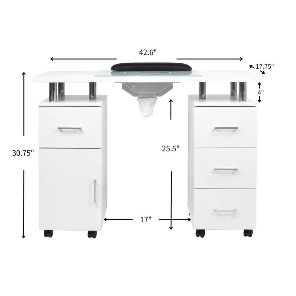 Features:1. A professional Nail Table2. Holds 4 removable easy-clean drawers3. Good-looking and practicalSpecifications:1. Material: 25Mm Density Board, Other 15Mm Particleboard, Drawer Bottom 5mm2. Weight: 73.85lbs / 33.5kg3. Product Size: (43 x 17.7 x 31.5)" (L x W x H)4. Desktop: (43 x 17.7)" (L x W)5. Cabinets On Both Sides: (11.81 x 15.75)" / (30 x 40)cm(L x W)6. PVC Wheels: 87. With Brakes: 4Package Includes:1 x Nail Table
