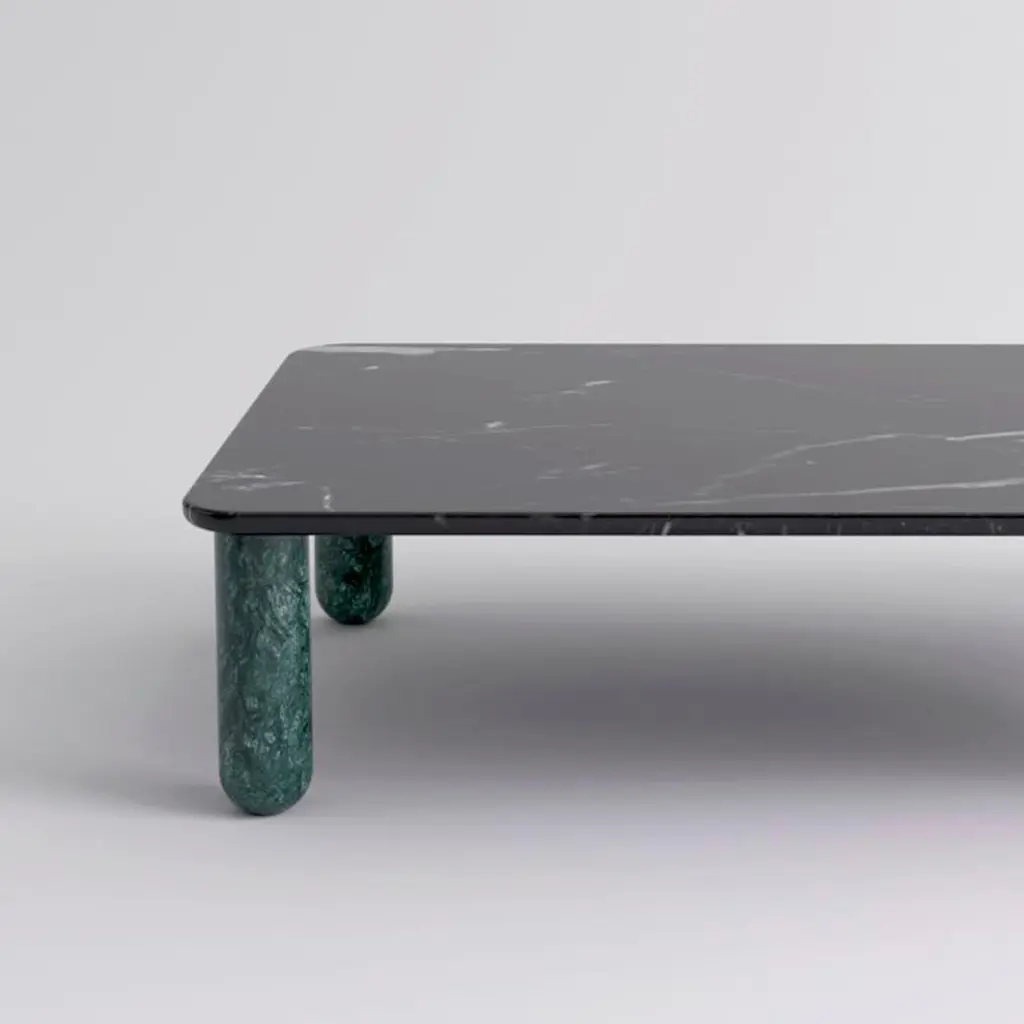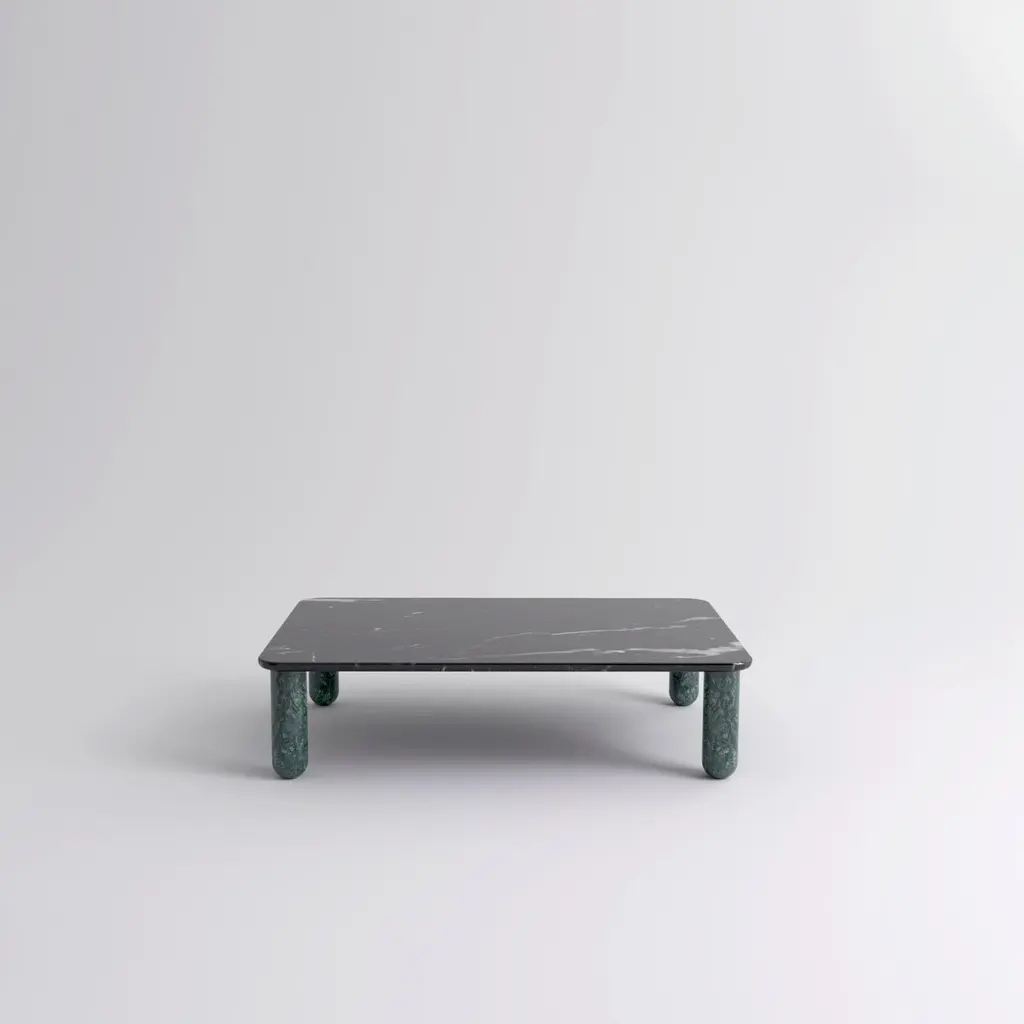 Medium black and green marble "Sunday" coffee table, Jean-Baptiste Souletie.Dimensions: 100 W x 150 D x 35 H cmMaterials: Indian green marble legs, black Marquina marble top.Available in 4 sizes: D 150, W 50 / D 200, W 50 / D 150, W 100 / D 200, W 100.Available in 5 top materials: walnut / black stained wood / Pele de Tigre marble / black Marquina marble / Indian green marble.Available in 3 leg materials: Pele de Tigre marble / black Marquina marble / Indian green marble.Sunday is a family of coffee tables and low consoles with a simple and clean design vocabulary. The combination of heavy marble legs with the thin solid wood or marble top creates an interesting contrast while the rounded edges and generous proportions provide a comforting feeling.Jean-Baptiste Souletie is the co-founder of the furniture editor La Chance with Louise Breguet. He studied in India, worked for a merchant bank in London (where he designed their new offices), before working for an investment fund (where he redevised the graphic chart), and in the strategic department of a luxury goods company in Paris. He returned to his first loves, architecture and furniture, when he founded La Chance in 2012.
