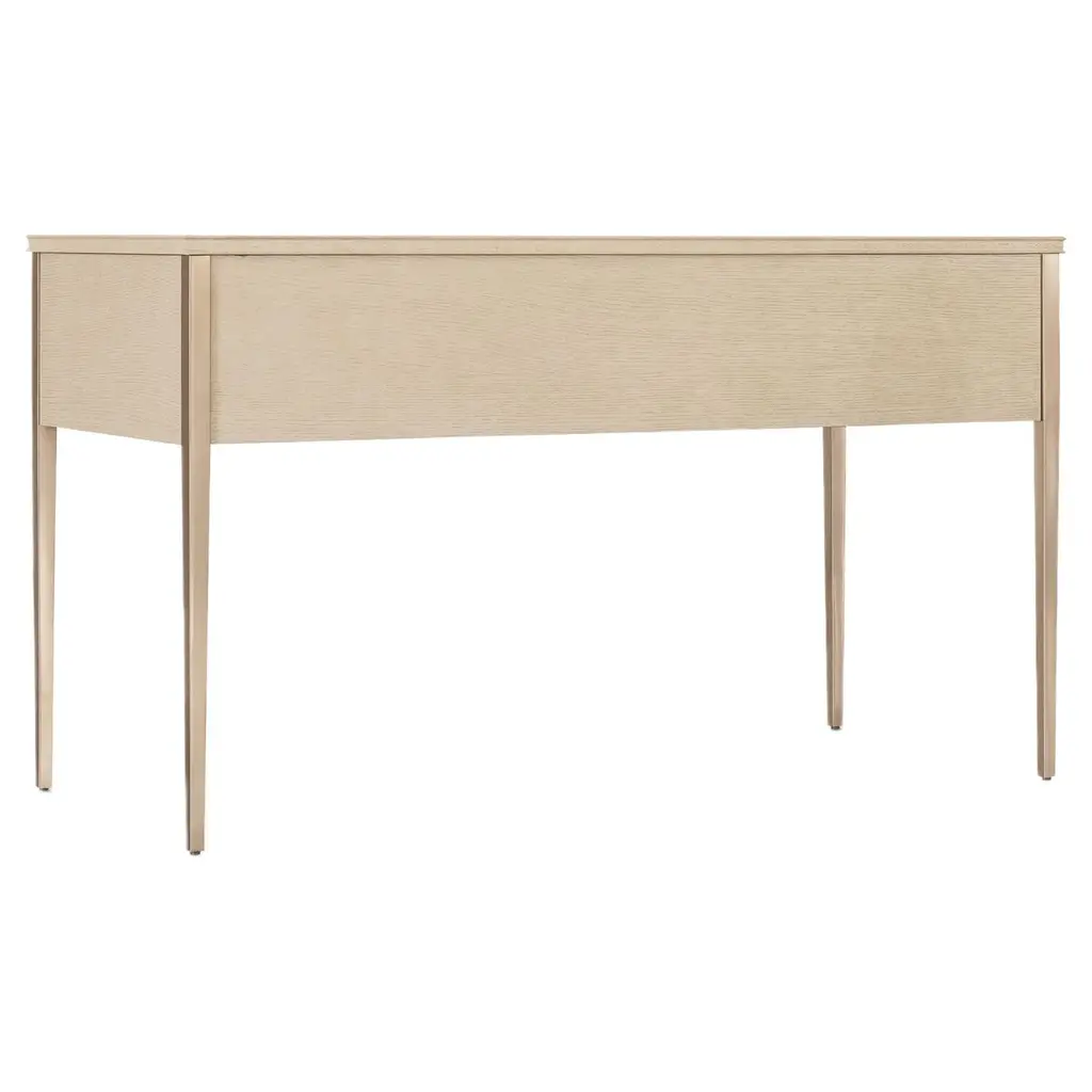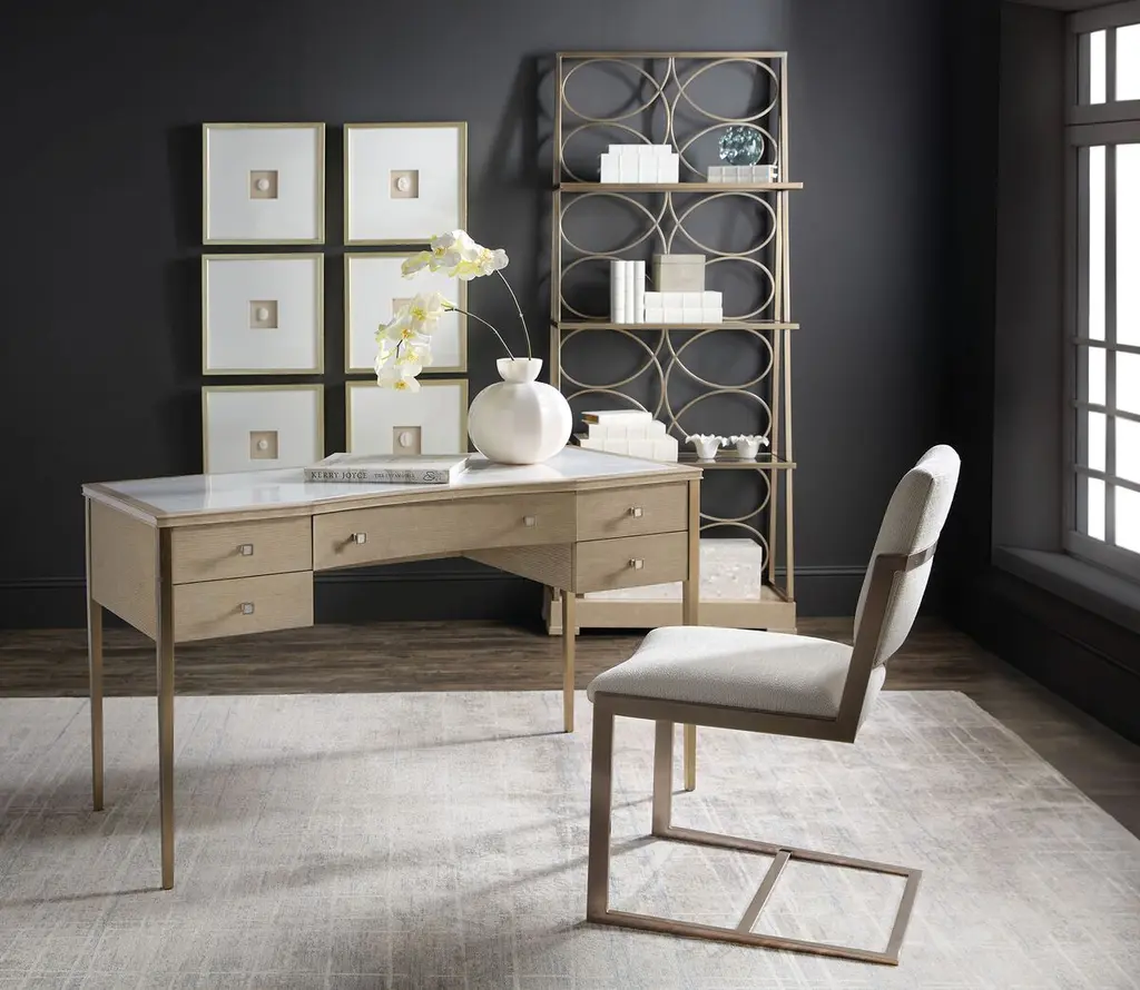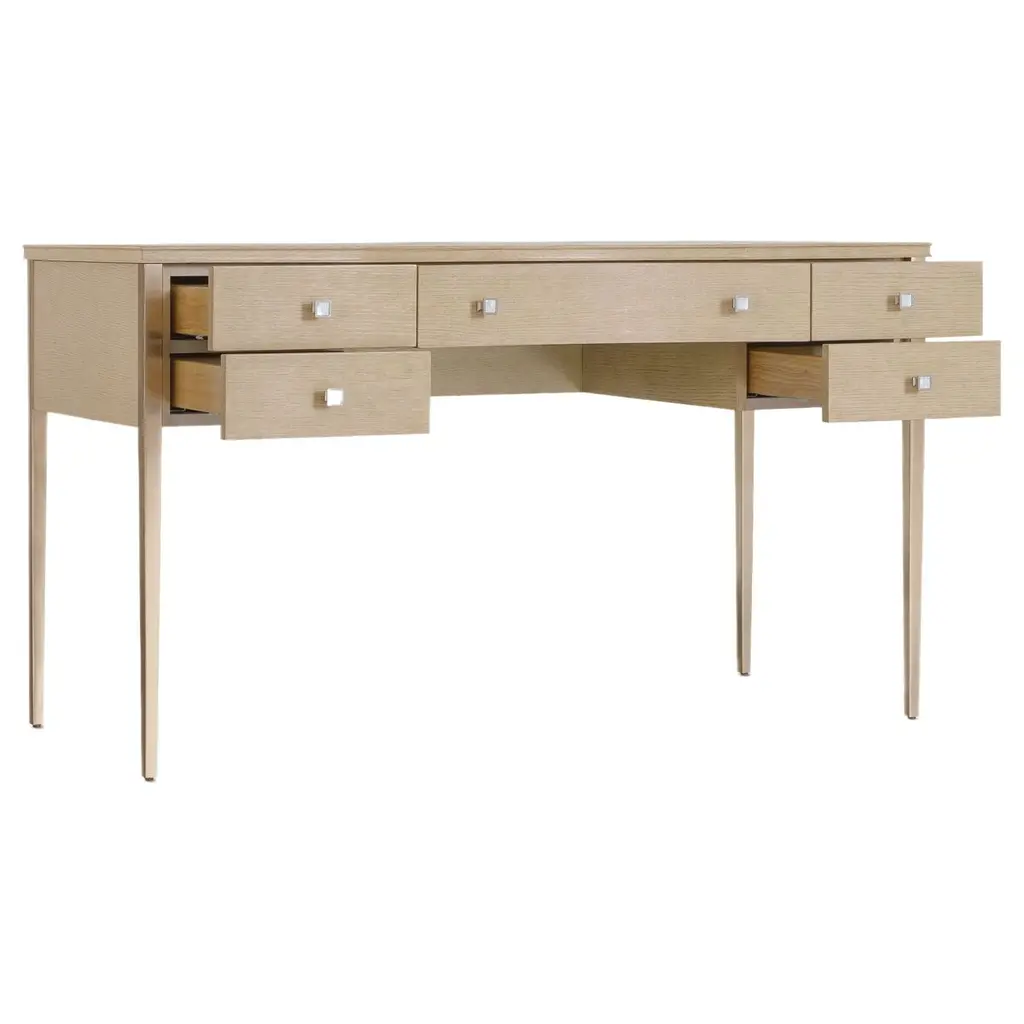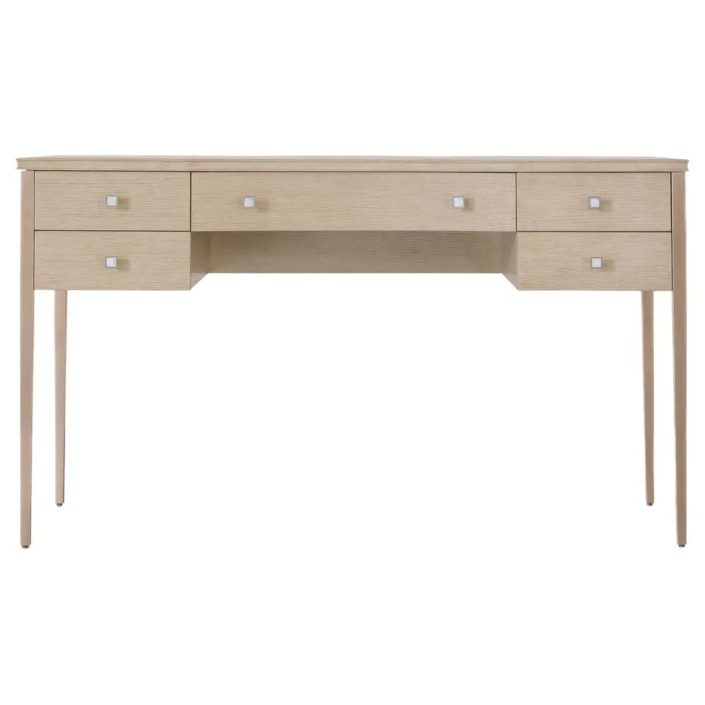 Elevate your bedroom with the sophisticated Flourish Dressing Table from the Melange collection. This transitional vanity table offers a stunning stone inset top with a natural blend of tones. With five self-closing drawers, including a concave-shaped center drawer, it provides ample storage for your essentials. The thin tapered legs add a touch of elegance, making this dressing table a perfect blend of functionality and style.