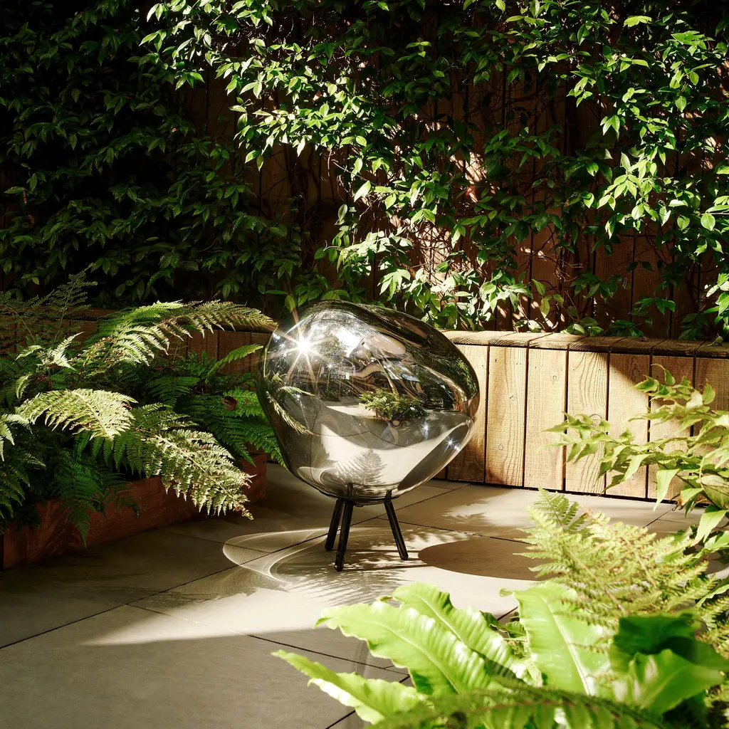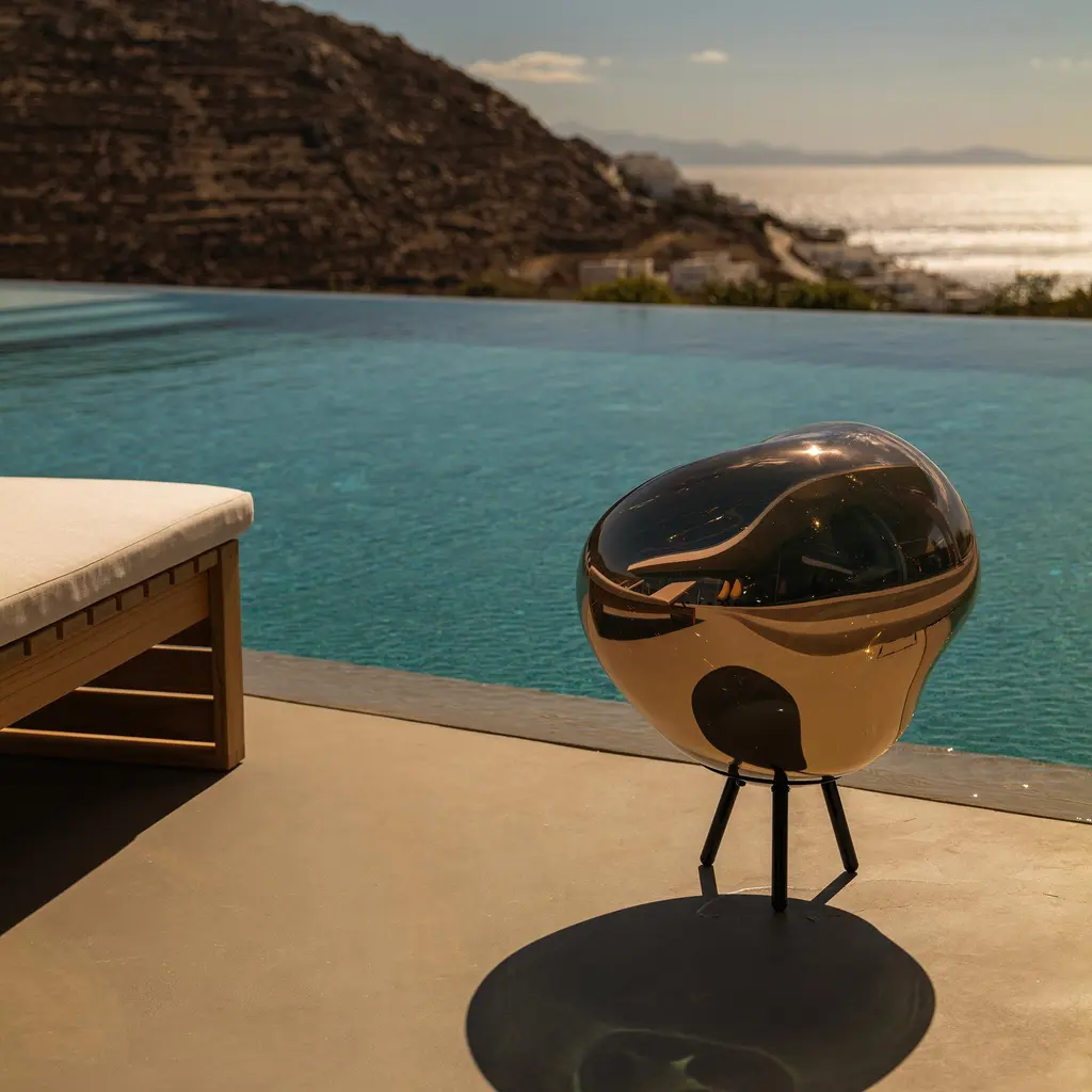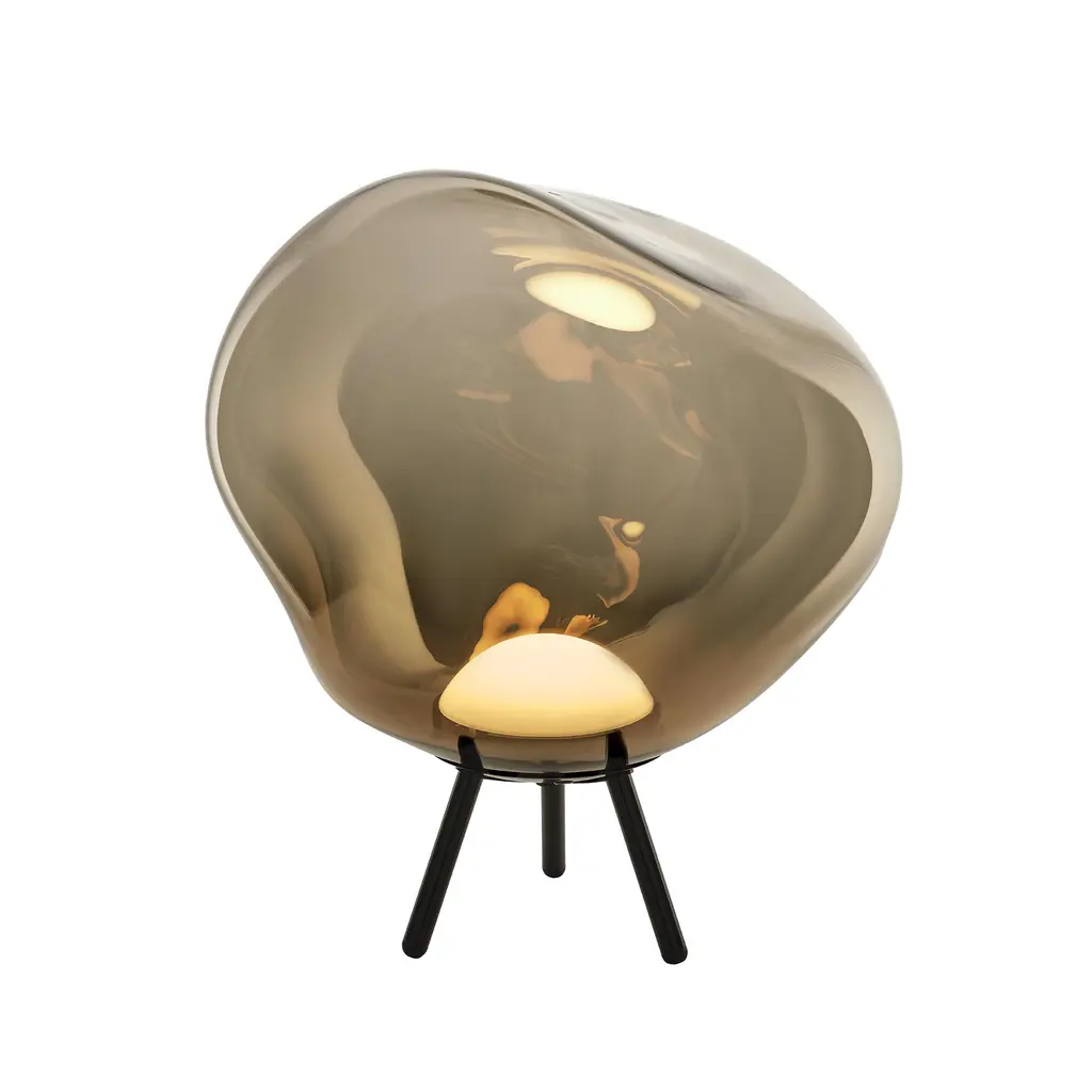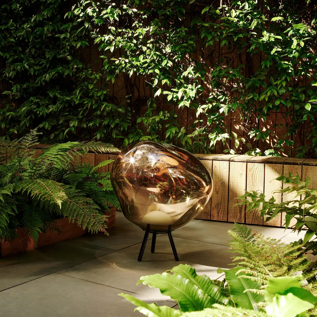 Carry it to the garden; at dusk it glows like liquid glass. Designed by Tom Dixon and made in Germany, the Melt Large Portable turns the famous distorted orb into a cordless lamp. By day the shell reads as a mirror; switch it on and the globe goes semi-transparent, revealing those swirling “melt” patterns that shift as you move. Built for inside and out, it runs on a rechargeable battery for up to 8 hours. A three-step touch dimmer sets the mood. Rubber pads steady the tripod; the hanging strap makes quick work of a branch or pergola beam. Charging is via a 1.5 m waterproof USB-C cable, so topping up on the terrace is easy. Bring it back in when the night’s over. At 22″ H × 20″ W × 10″ D (57 × 50 × 25 cm) and about 6.4 lb (2.9 kg), it’s substantial yet carryable. Choose Copper, Chrome, Gold, or Smoke—the effect stays hypnotic, the tone is yours.