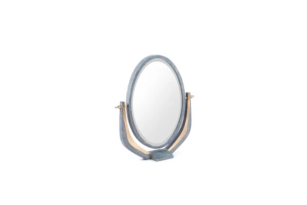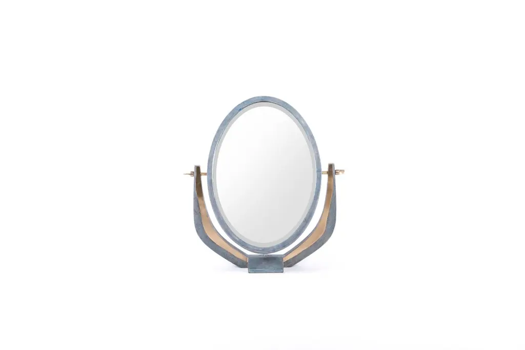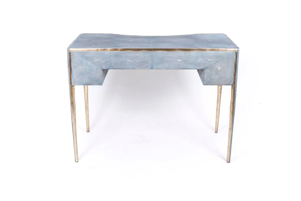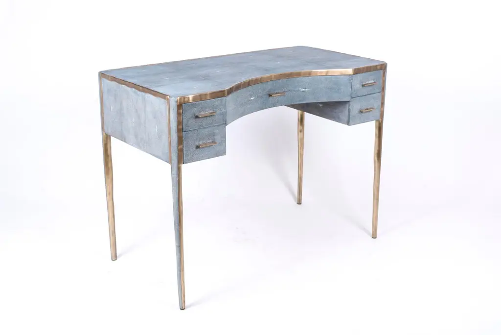 The Paris based label has distinguished themselves since their launch, with their iconic use of shagreen mixed with brass and other exotic materials. All furniture is handcrafted by skilled artisans, ultimately making each piece unique, designed in Paris and produced in the Philippines.The melting vanity table's simple but elegant design, makes for an adaptable elegant piece of furniture. The blue shagreen inlaid surface is framed with an irregular surface bronze-patina brass that creates the "melting" effect against the shagreen inlay. This desk includes 5 drawers total with a discreet thin metal handle. Mirror included, chair sold separately. Custom color or sizing available on request.The finish of the shagreen is authentic as it is hand-dyed and the designer calls the finish look: "denim blue shagreen."The dimensions of this piece are 100 x 50 x 75 cm, 39" x 19.75" x 29.5"All R & Y Augousti pieces are handmade by artisans, ultimately making each piece unique.Wipe clean with soft dry cloth.Acclaimed design duo Ria & Yiouri Augousti have established themselves since the 1990s as pioneers of modern-vintage style through their luxurious Art Deco inspired collections.The Paris based label has distinguished themselves since their launch, with their iconic use of shagreen mixed with brass and other exotic materials. All furniture is handcrafted by skilled artisans, ultimately making each piece unique. All shagreen-covered items should be kept out of direct sunlight, color variants may occur on the stingray and other exotic finishes, but this showcases the Parisian label's commitment to creating authentic luxurious products using natural components.