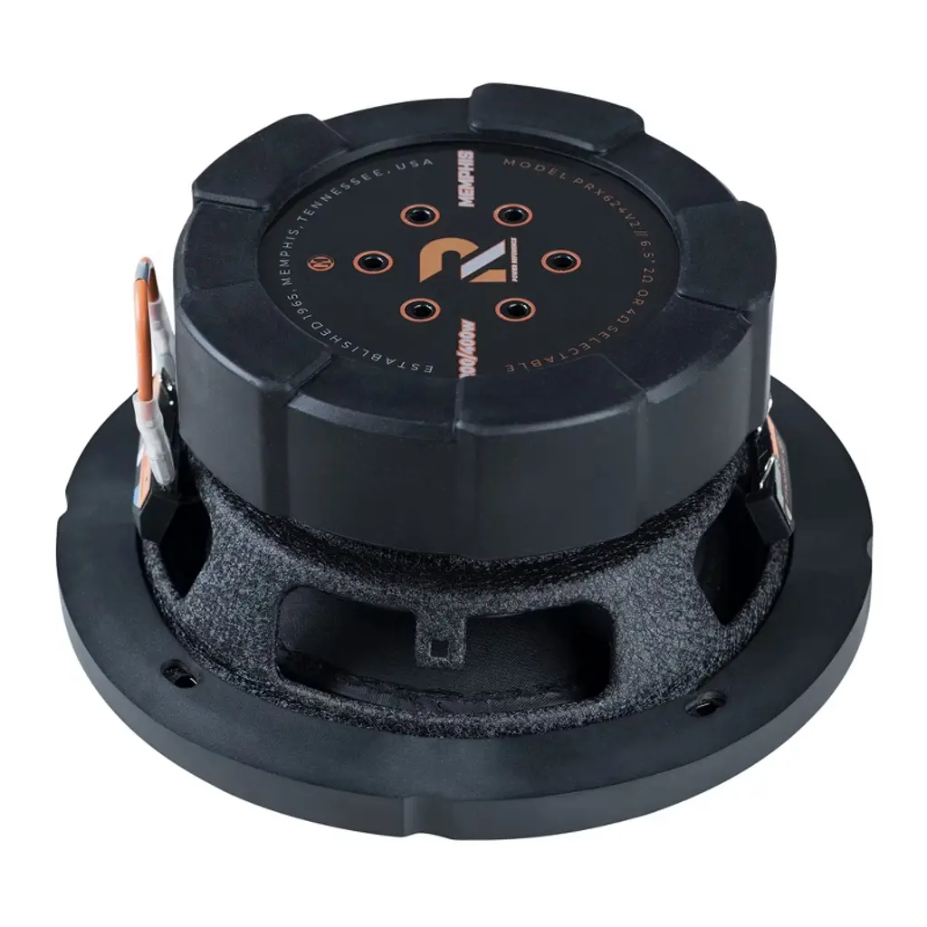 The Memphis Audio PRX624 is a 6.5" subwoofer from the Power Reference series, engineered for reliable bass performance in a compact size. It features FLEX Selectable Impedance Technology, allowing configuration at 2Ω or 4Ω for flexible system design. DVVC Direct Voice Coil Cooling technology enhances heat dissipation, supporting consistent performance under load. A black polypropylene cone with double-stitched butyl rubber surround provides strength and controlled excursion. Reinforced spider shoulder and improved suspension and coil design contribute to durability and bass accuracy. The PRX624 also uses woven tinsel leads, a high-temperature TIL voice coil former, and a stamped steel frame for added reliability. Features • FLEX Selectable Impedance Technology (2Ω or 4Ω) • DVVC Direct Voice Coil Cooling • Black polypropylene cone • Double-stitched butyl rubber surround • Reinforced spider shoulder • Improved suspension and coil design • Woven tinsel leads • High-temperature TIL voice coil former • Stamped steel frame Specifications • Model: PRX624 • Size: 6.5" (165 mm) • RMS Power: 150W • Peak Power: 300W • Selectable Voice Coil: 2Ω or 4Ω • Sensitivity: 82 dB @ 2Ω / 82 dB @ 4Ω • Magnet Size: 41 oz • Mounting Depth: 3" (76 mm) • Cutout Diameter: 5.67" (144 mm) • Voice Coil Diameter: 1.5" (38 mm)