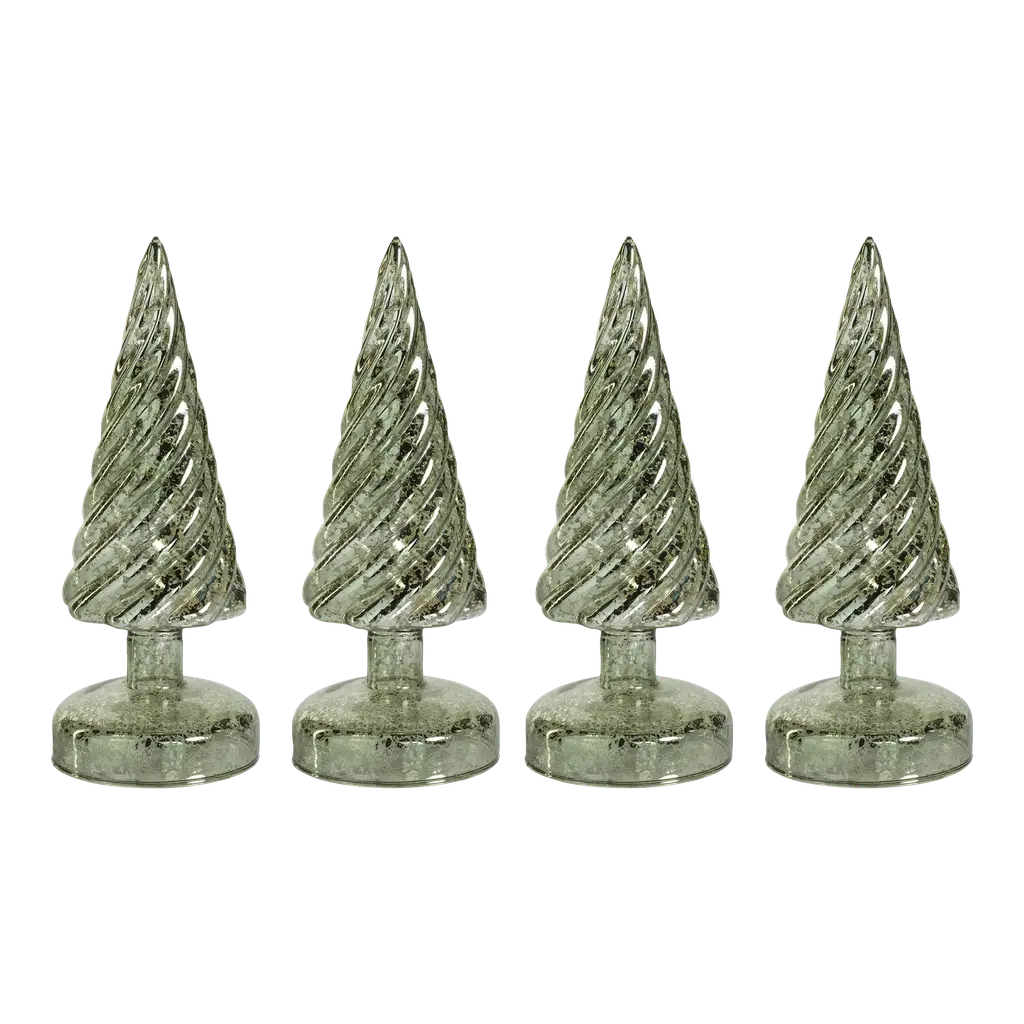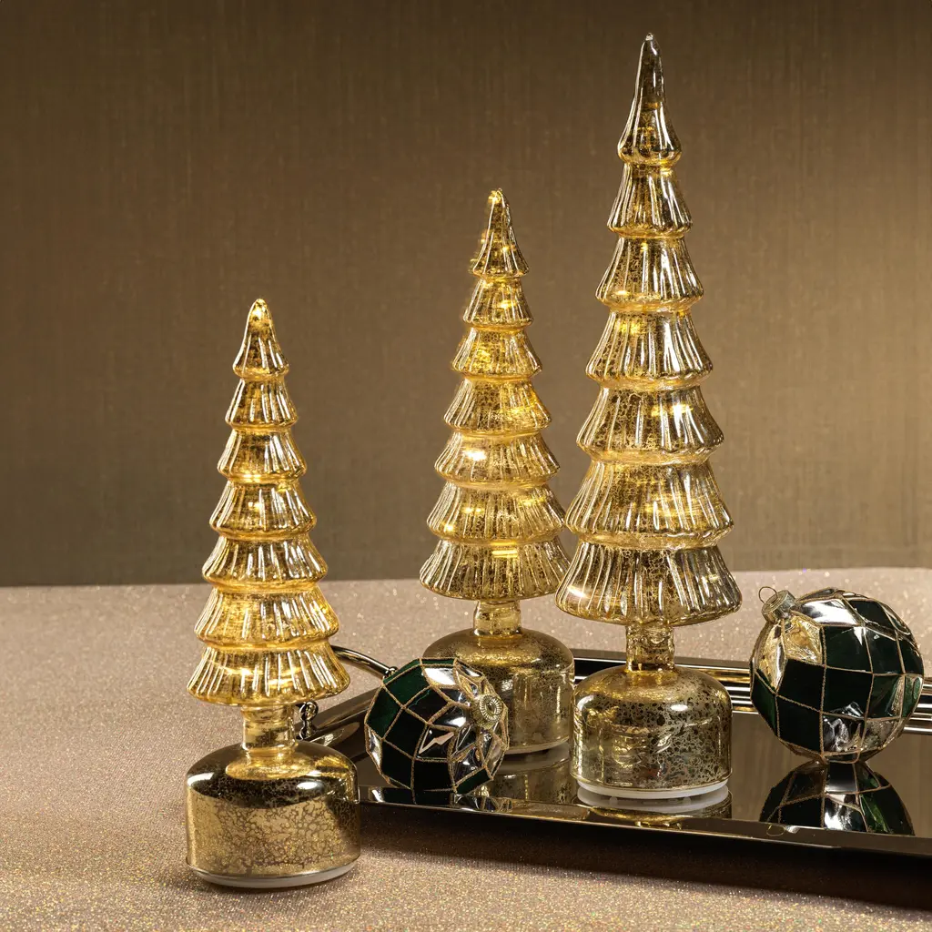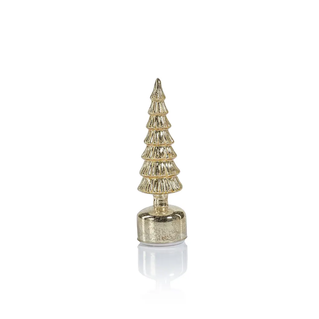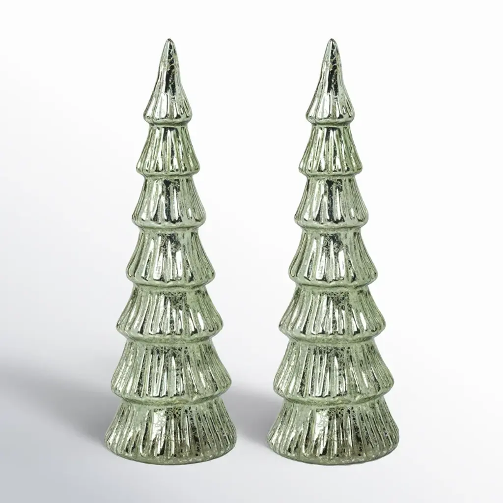 Add a touch of festive charm to your decor with the Merrigan Rotating LED Holiday Tabletop Tree. Resembling speckle glass, this delightful figurine rotates to showcase its elegant design. Featuring LED holiday lighting, it beautifully illuminates any space. The pine pencil Christmas tree sits atop a sturdy round base, making it a perfect centerpiece for your holiday celebrations. Battery operated LED tabletop tree. Rotating decorative glass tree. The round base ensures stability. Requires (3) AA batteries, not included A perfect accent to your holiday home decorations.