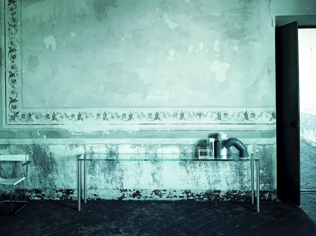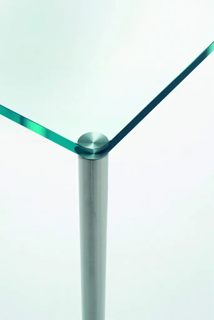 Metal is a series of high, low tables and consoles with top in mm 19 thick transparent and transparent extralight tempered glass.The cylindrical feet diameter Ø 50 mm are in brushed aluminum anodized inox, bronze or black and are fixed to plates glued to the top.FINISHES:- Transparent glass- Transparent extralight glassAVAILABLE CUSTOM MADE