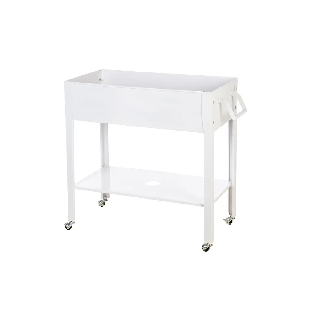 This convenient Metal Grow Table with Handle can be moved into the sun or shade for your planting needs. Thanks to the wheels on its legs, you can simply roll it where you like. Helpful for growing seedlings and more, this grow table features a drainage hole so you can water plants directly in the basin. Steel grow table is outdoor-safe for long-lasting use. The all-white design makes this table sleek and modern, and will contrast your greenery nicely. Bottom shelf can store any accessories, like soil, tools and more. Assembly required.