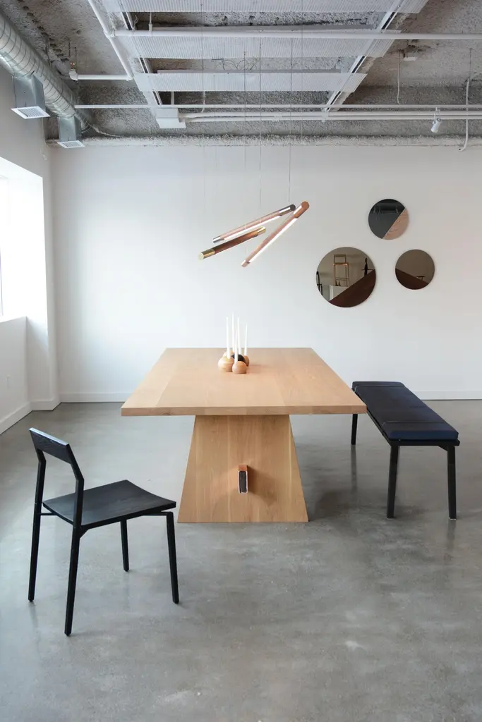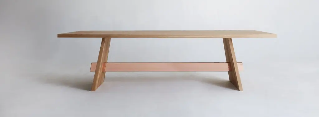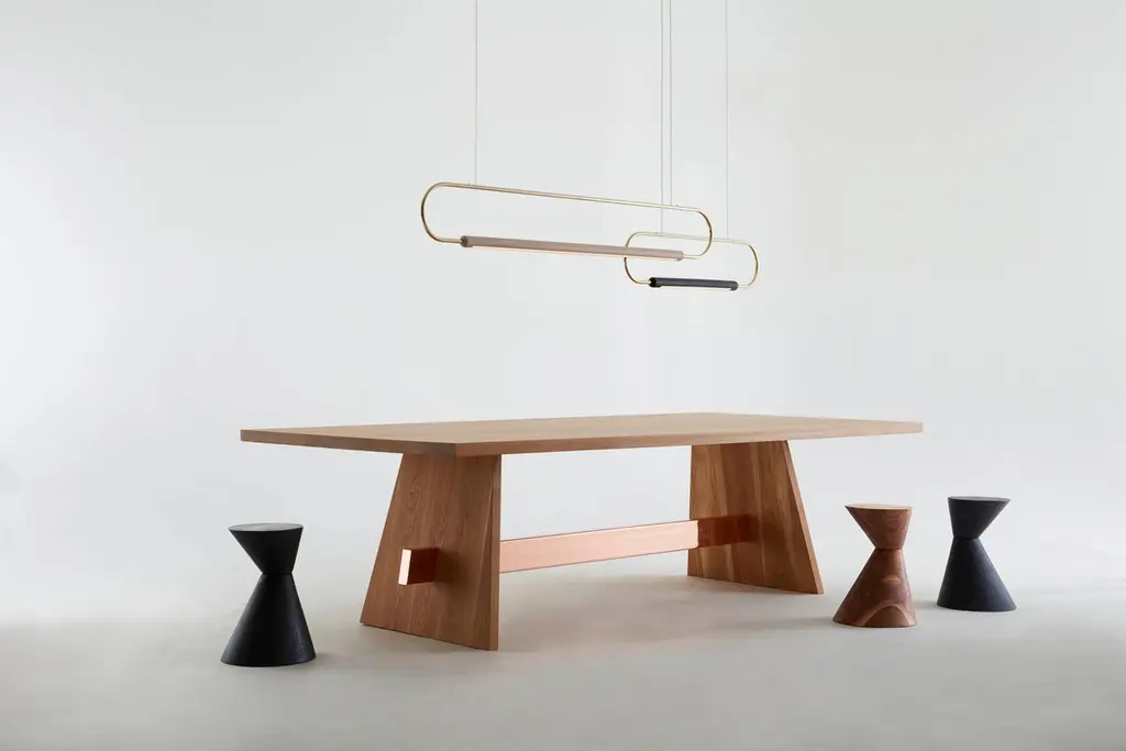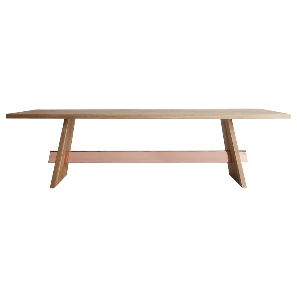Metal plated walnut large isthmus dining table by Hollis & MorrisDimensions: 102" x 42" x H 29.5"Materials: Solid wood. Cold rolled steel. Hardwax oil, powder-coated metal. Metal plated finish. Also available in natural oak, black oak, and white oak. And, white or black powder-coated finish. Metal plated finish upon request.An isthmus is a narrow strip of land with sea on either side, natural-occurring geography with a powerful visual presence. Isthmus abstracts this resonant form into a solid wood table that adds prominence and poetry to the room. A molten-looking metal trestle bolsters the full-width legs — classic wood joinery reimagined in metal.Based out of Toronto, Hollis & Morris takes its name from an intersection in Halifax where the company started as a series of garage explorations in design. A steadfast commitment to function with a distinctive approach to design. Hollis & Morris creates handmade furniture and lighting which carefully balances modern and honest designs. Versatile, well crafted, and timeless. Pieces by Hollis & Morris easily complement residential, commercial, and hospitality spaces. Driven by respect towards natural and honest processes, trademark integrations of solid wood and metal celebrate the inherent strengths of each material, resulting in thoughtful, quality pieces made to last with you throughout the years.