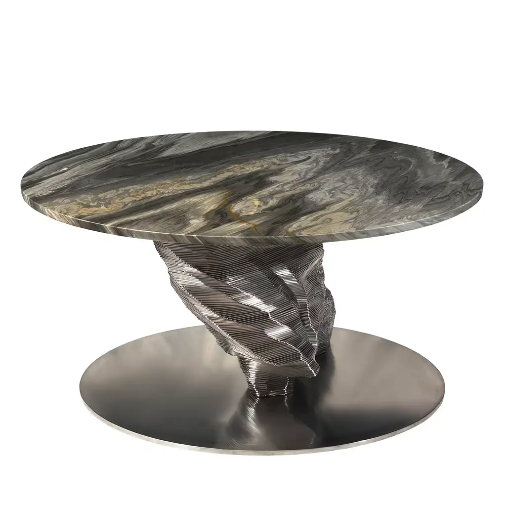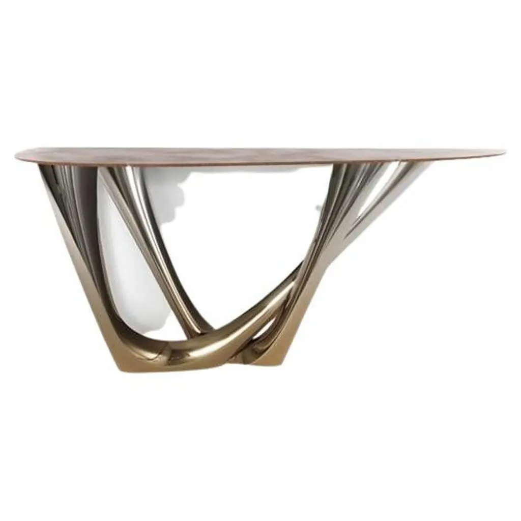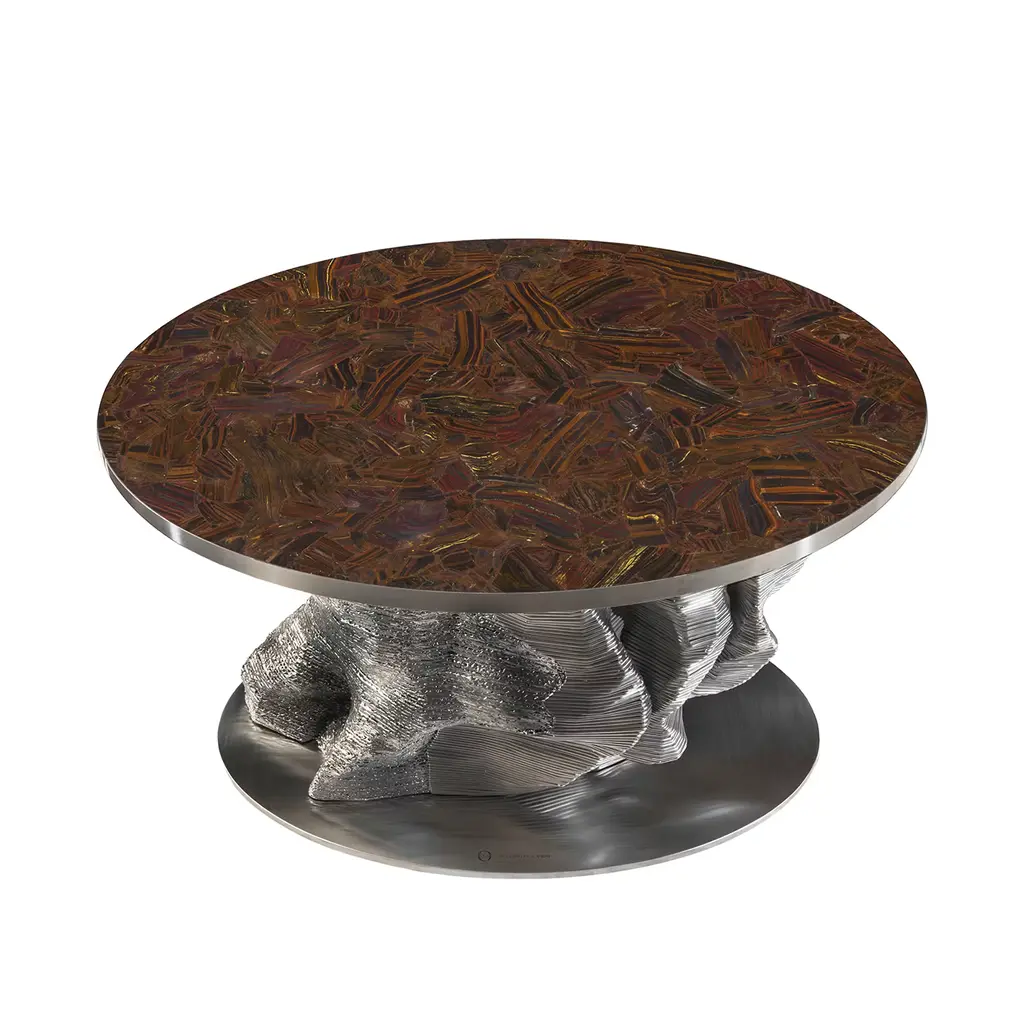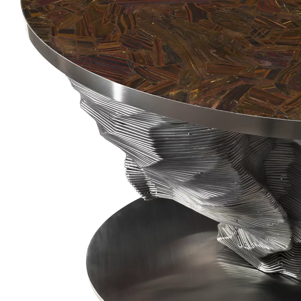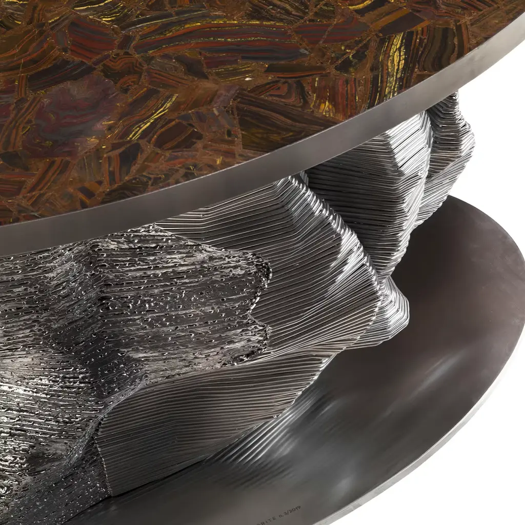 A refined and stylish top in Red Tiger Iron Gemstone is elegantly juxtaposed to a singular base deftly handmade and sculpted from a steel block in a striking, abstract shape. Part of an extraordinary numbered series of customizable designs created by Giò Pozzi, this magnificent table will infuse a contemporary interior with charming sculptural allure. Unique steel processing technique: bent, hand-welded and polished. Please ask the Concierge for customization options.