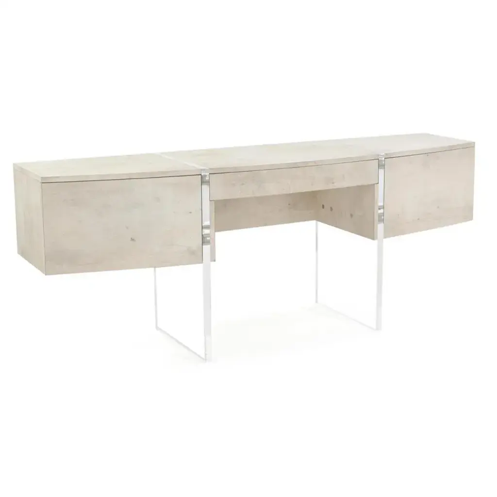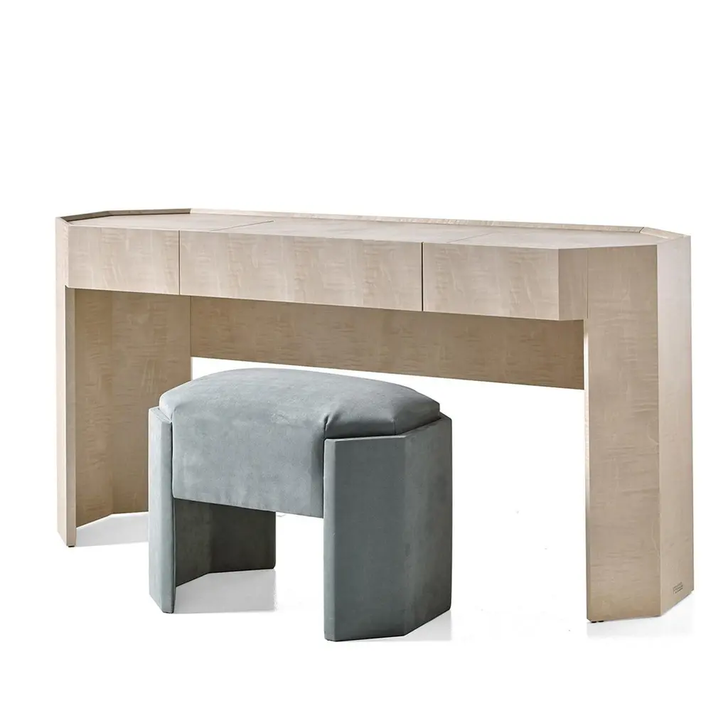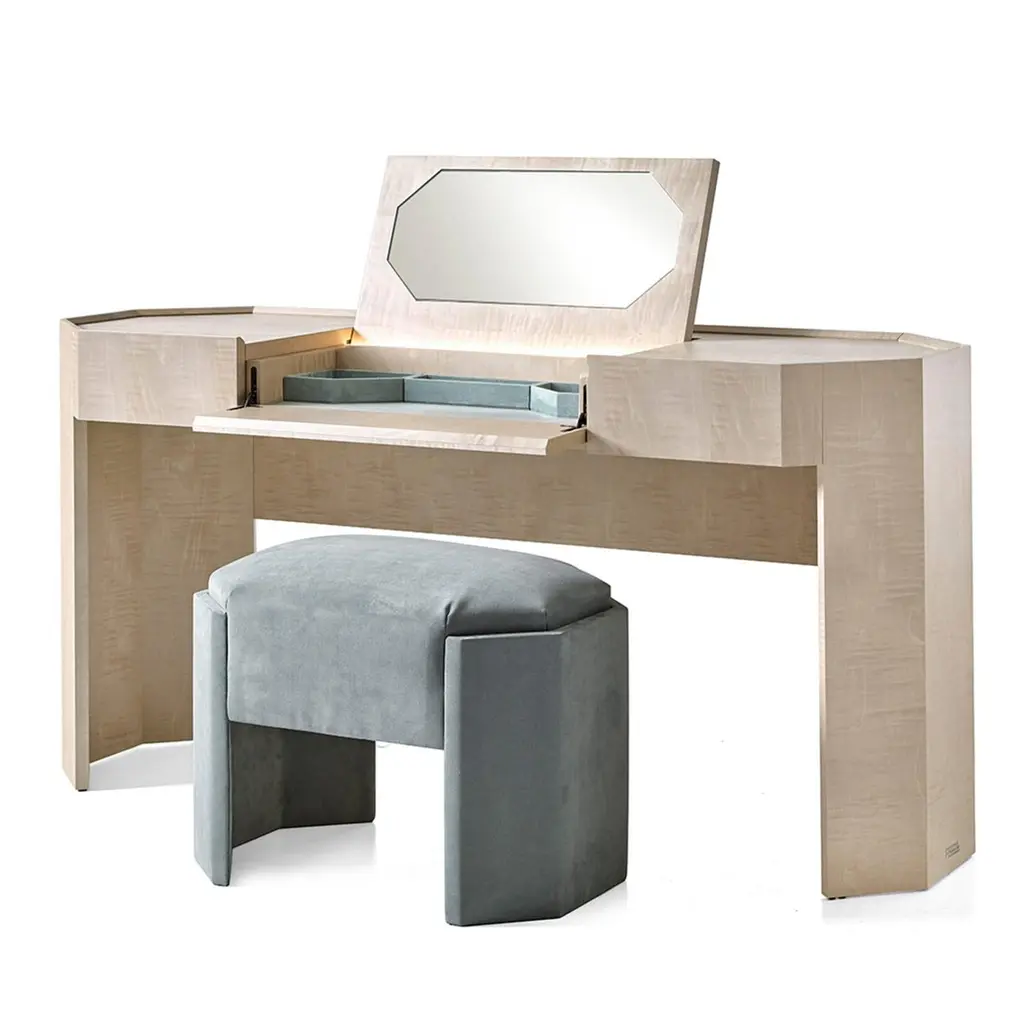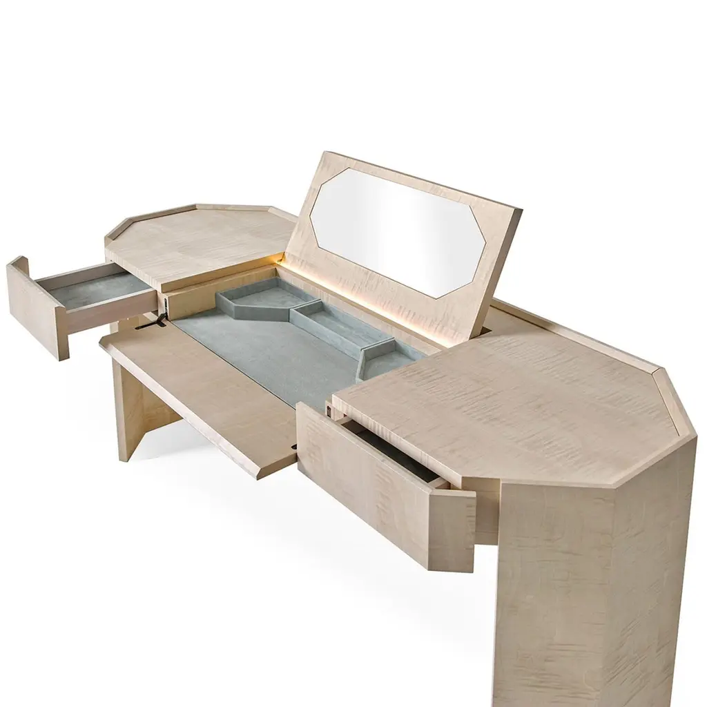 Vanity table with a particular octagon shape composed of two drawers and an openable storage compartment. Covered in fine wood veneer with a matt Fox finish. Internal led lights supplied as optional.