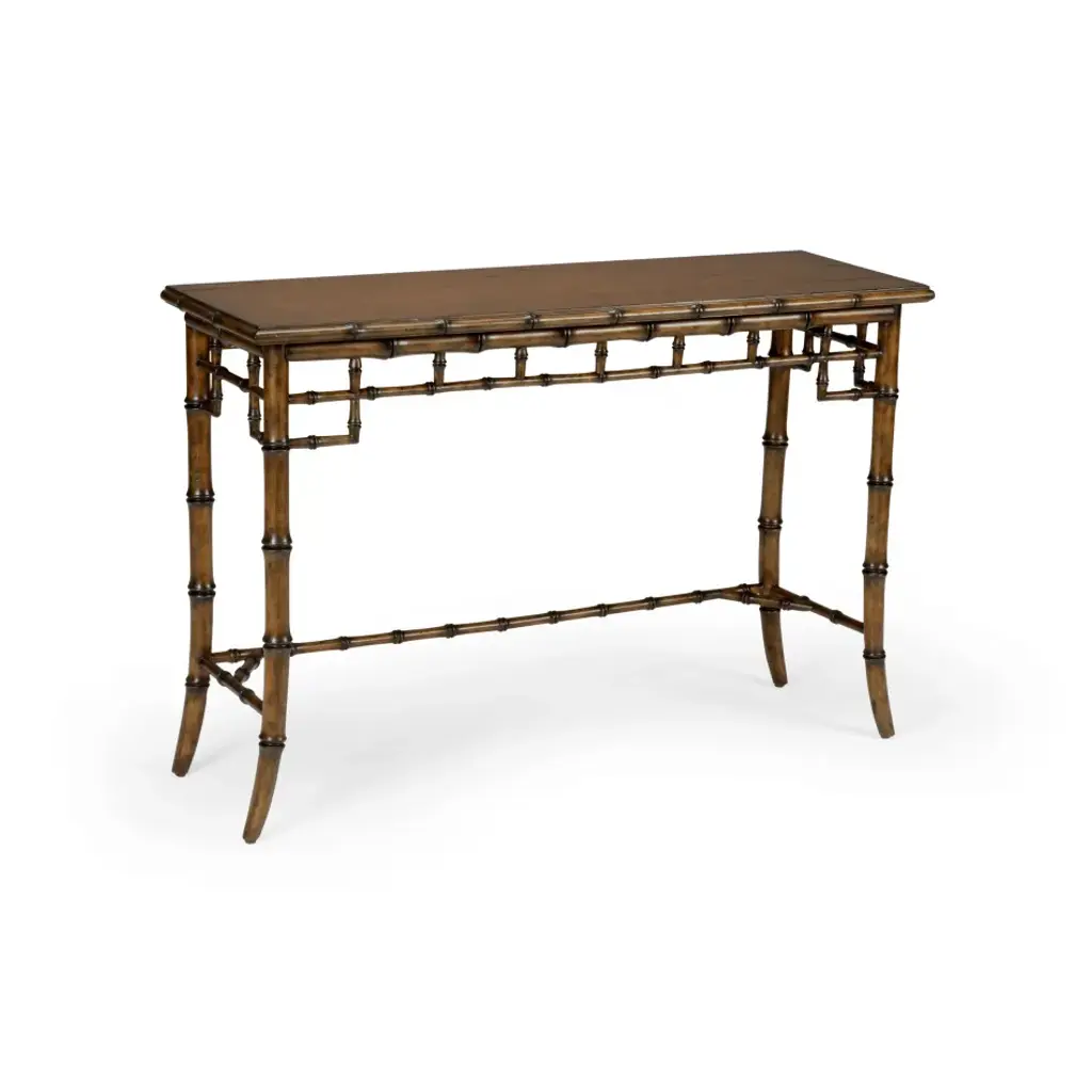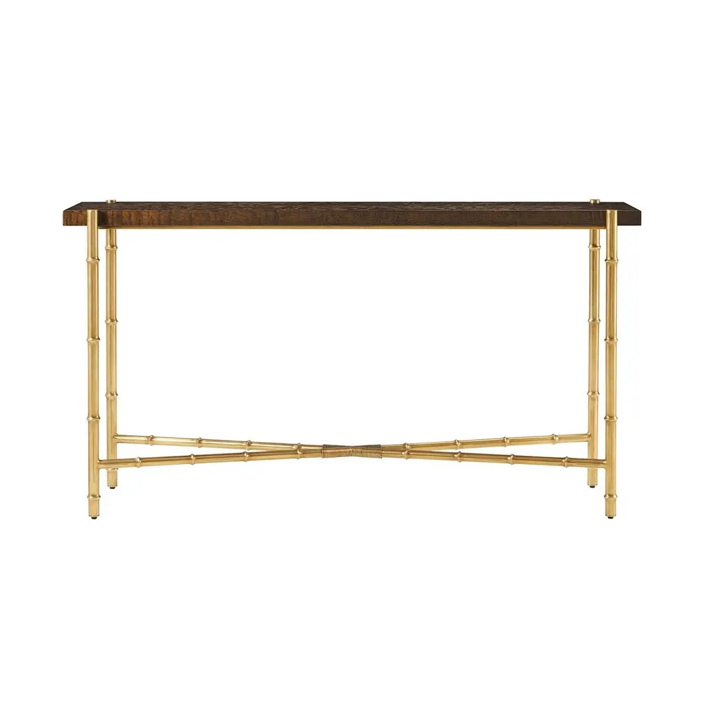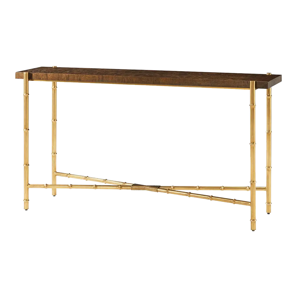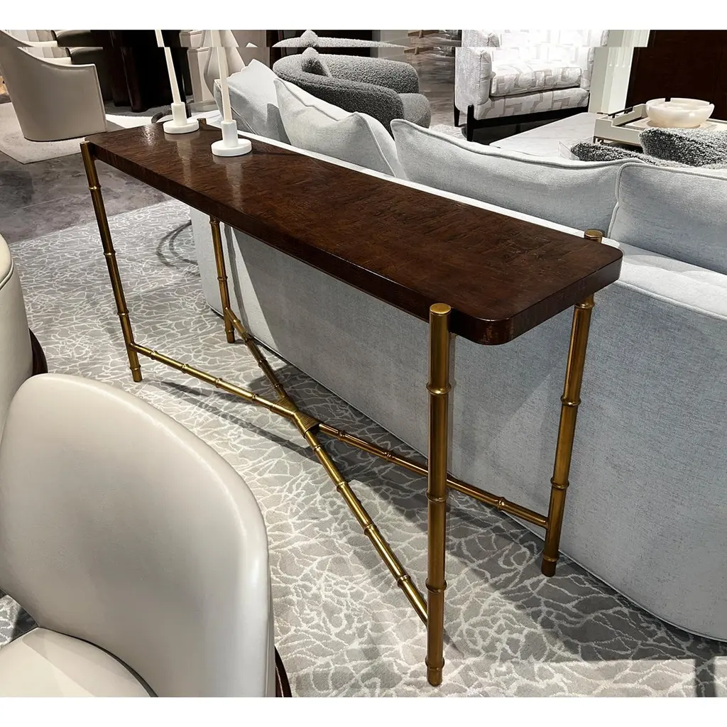 A perfect fusion of timeless elegance and modern sophistication. The exquisite Tamo ash burl wood top, featuring unique grain patterns, brings a touch of natural beauty, while the Satin Brass finish bamboo-inspired base adds a hint of opulence.Crafted with meticulous attention to detail, the console table is an ideal addition to your entryway, living room, or hallway, offering both functionality and style. The high-quality materials and sturdy construction promise longevity, making it a worthwhile investment for those seeking to enhance their home with exclusive and refined furnishings.Dimensions: 60" W x 16" D x 32.5" H