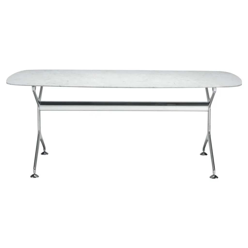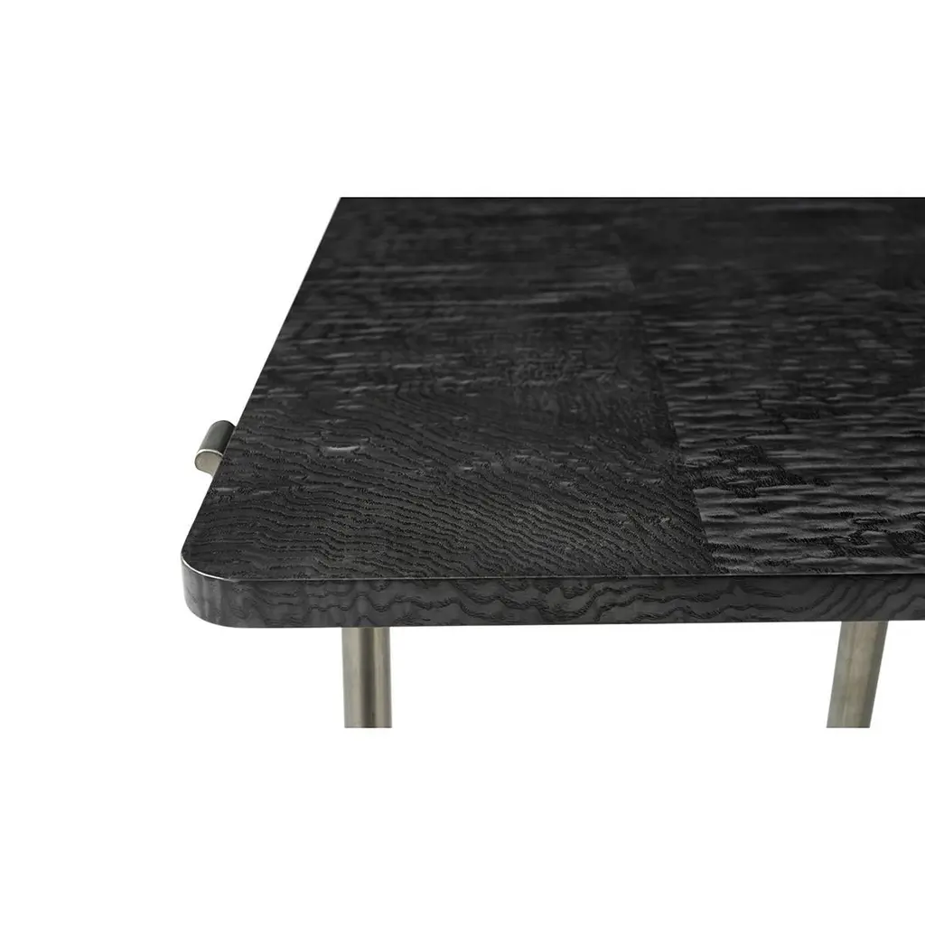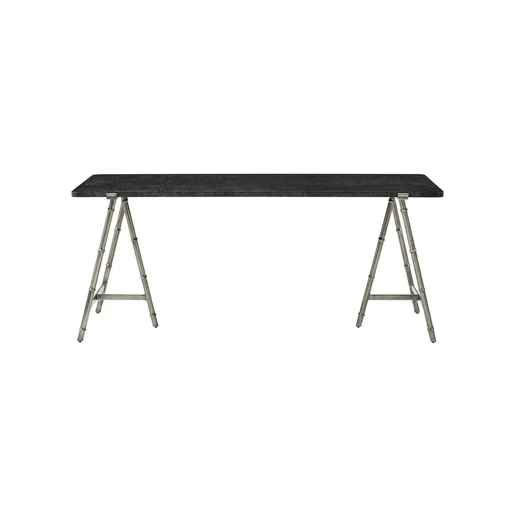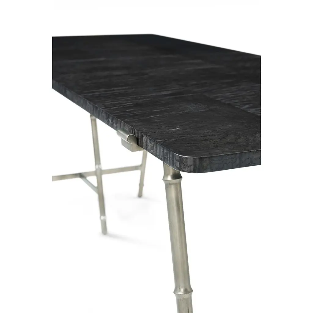 Slender lines form a light and airy design in this modern table. A graceful combination of burl wood in a silent black polished finish atop an organic faux bois base in a silvered bronze finish.Dimensions: 72" W x 31.75" D x 30" H