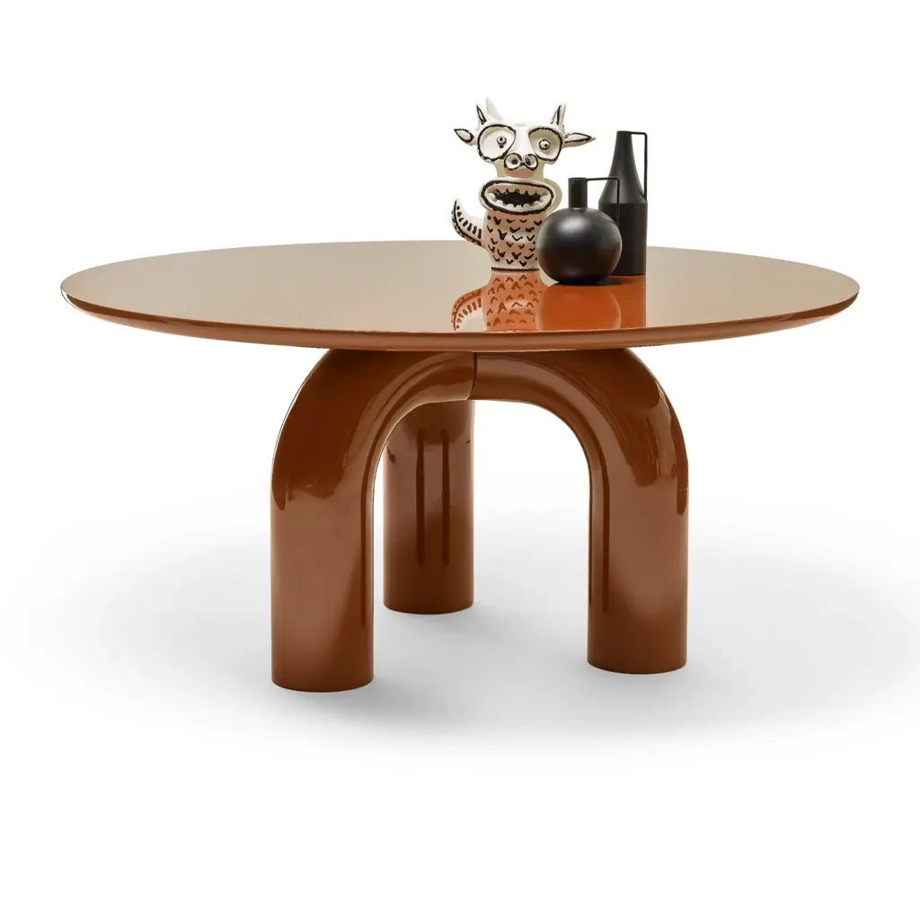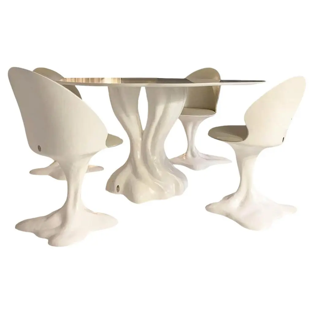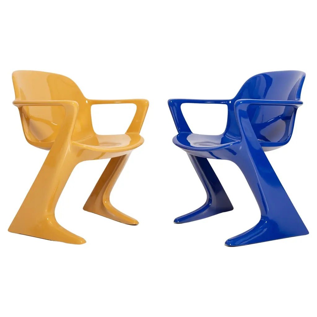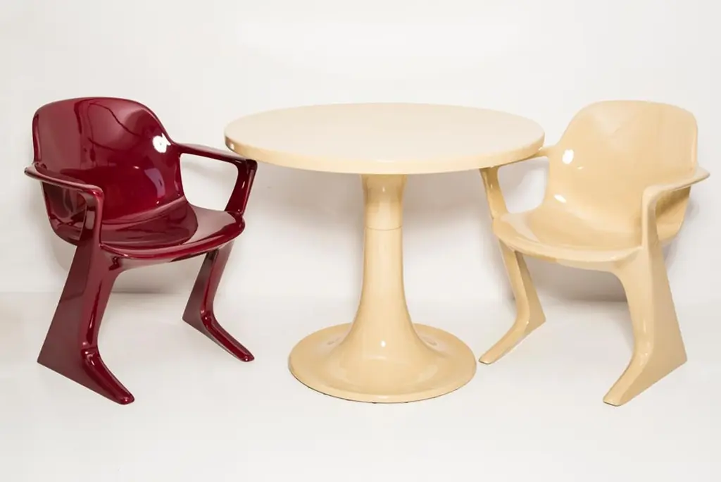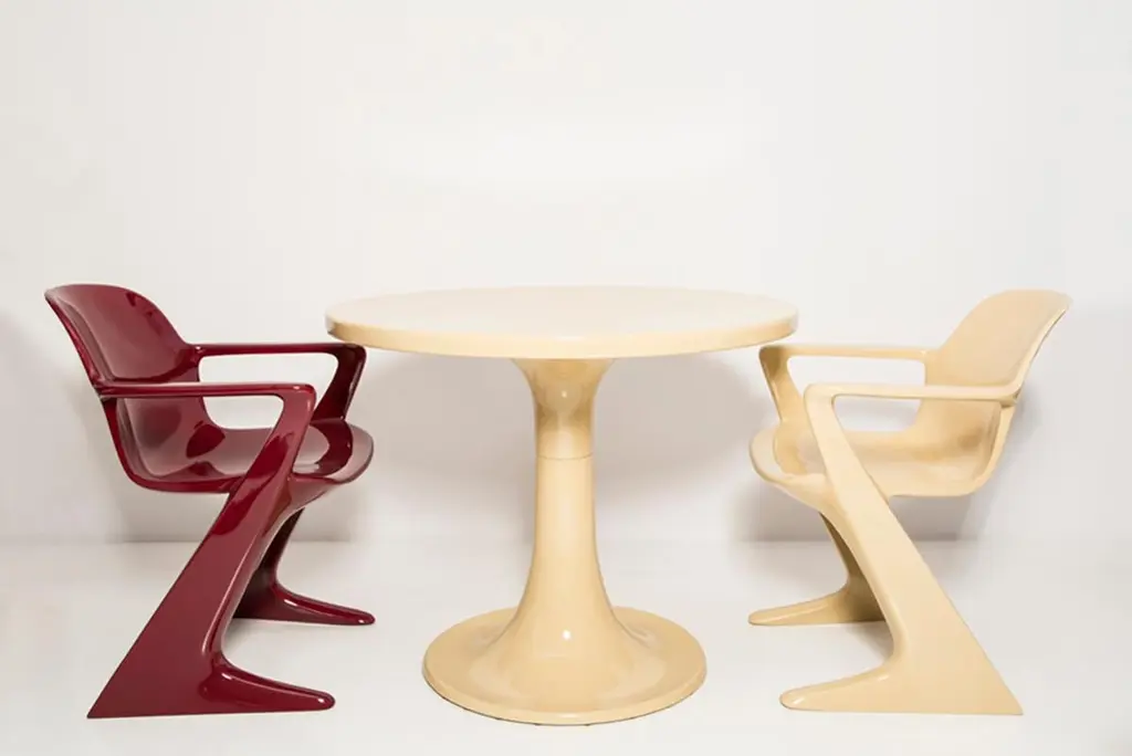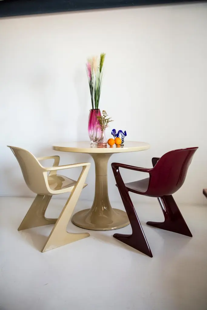 The z.stuhl chair, designed by Ernst Moeckl (1931-2013) in the 1970s, is a cantilever chair made of polyurethane, which is available with and without armrests. In the vernacular, the chair is known by its geometry-related names such as "squatting man", "kangaroo" and "Z-chair". German Version of the Panton chair. Also called kangaroo chair or variopur chair. Produced in eastern Germany.Chair is after full renovation, new glossy lacquer. For this chairs we used wine dark red and sand color. This model is extremely comfortable! Beautiful organic shape make them timeless and fits to every interior. We can prepare also set of 4 or 6 or more, also in another RAL/Pantone color.Waiting time is 2-3 weeks.Here available 2 chairs and table.Table dimentions: 90 cm round 72 cm height.