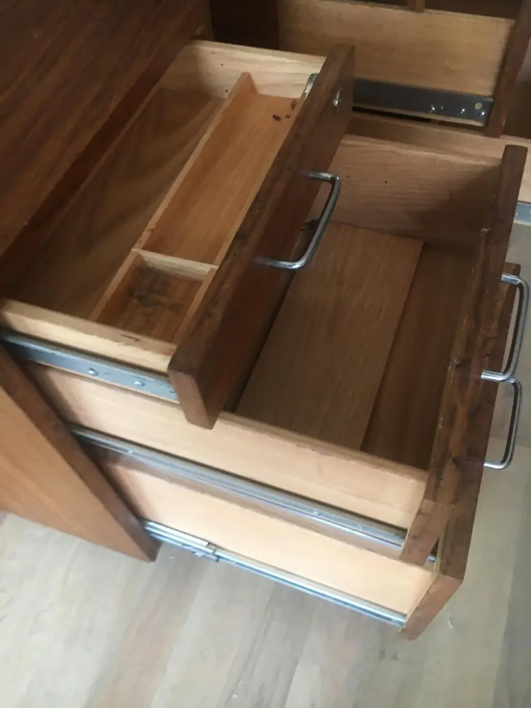 Midcentury teak three-drawer filing cabinets on casters, great bed side tables. We have detailed these so ready for installation. Priced per cabinet.