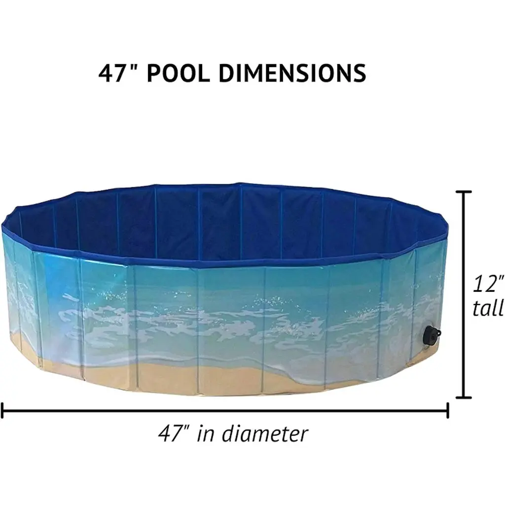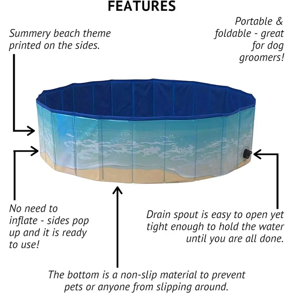 Summery beach theme on sides. If you can't be at the beach, pretend you are! Portable and foldable. Easy to store and travel with. Keep your dog cool this summer with their own pool! Fill up and let them splash and play. Drain when complete and dry before storing. Sets up in seconds for lasting fun! Durable PVC sides make this fun for all dogs (and cats and kids!)