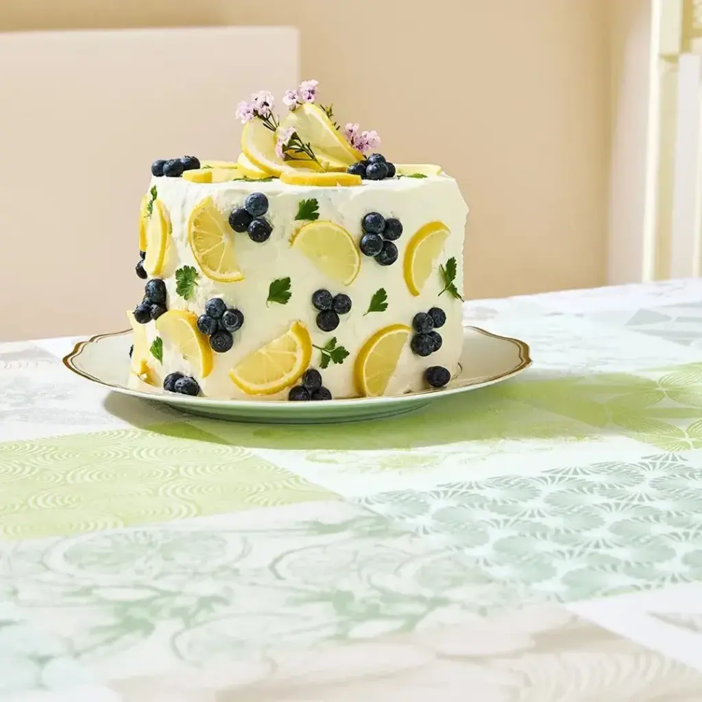 Transform your table with the Mille Parfums Verde Tablecloth by Garnier Thiebaut. Delicious florals and citrus scents flow in the air in shades of green, blue, and Grey, displayed on a jacquard-woven fabric crafted from extra-long staple cotton. Designed in France by our in-house artisans, it blends artistic beauty with long-lasting durability for any occasion. Since 1870, Garnier-Thiebaut has created classic and jacquard linens in the quintessential French style. Their linens have been used by the Four Seasons George V in Paris, the Mandarin Oriental Hotel in Geneva, The Ritz Carlton, Manama (Bahrain), Le Meridien Bora Bora, the Four Seasons Hotel, New York, and The French Laundry in Yountville.