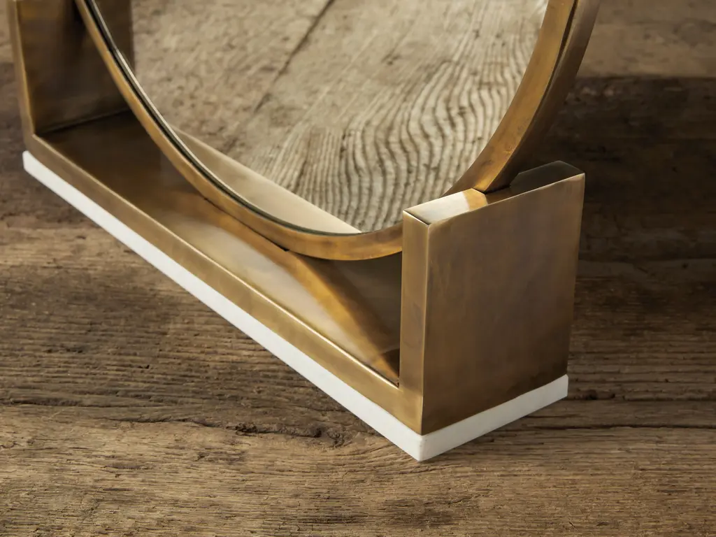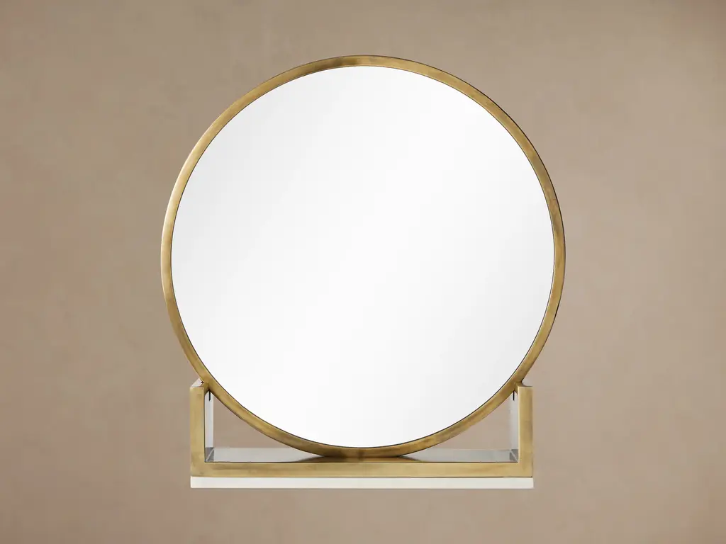 Modern and classically chic, our Minerva vanity mirror is framed in sleek metal. Hand-applied finishes feature an antique tone delicately accented with a thin strip of marble at the base.