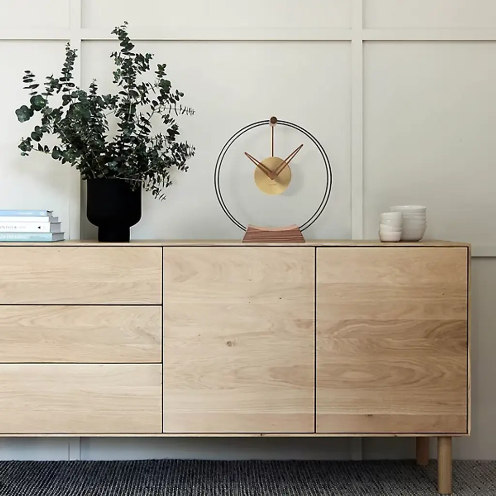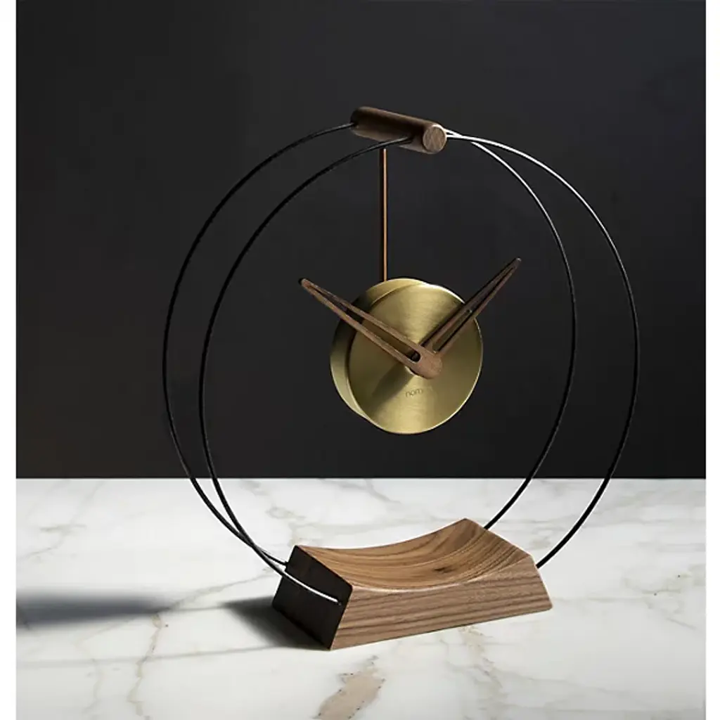 Accentuate your dresser with the Mini Aire Table Clock. Formed out of the Spanish artisanal tradition of clockmaking, this table clock is made of the finest natural materials. A formidable wood base houses dual metallic loops that shape the circumference of the dial. At the middle of the dial, a circular piece balances the two wooden hands of the clock allowing for an accurate time display. The Mini Aire is suitable for any modern bedroom or office.