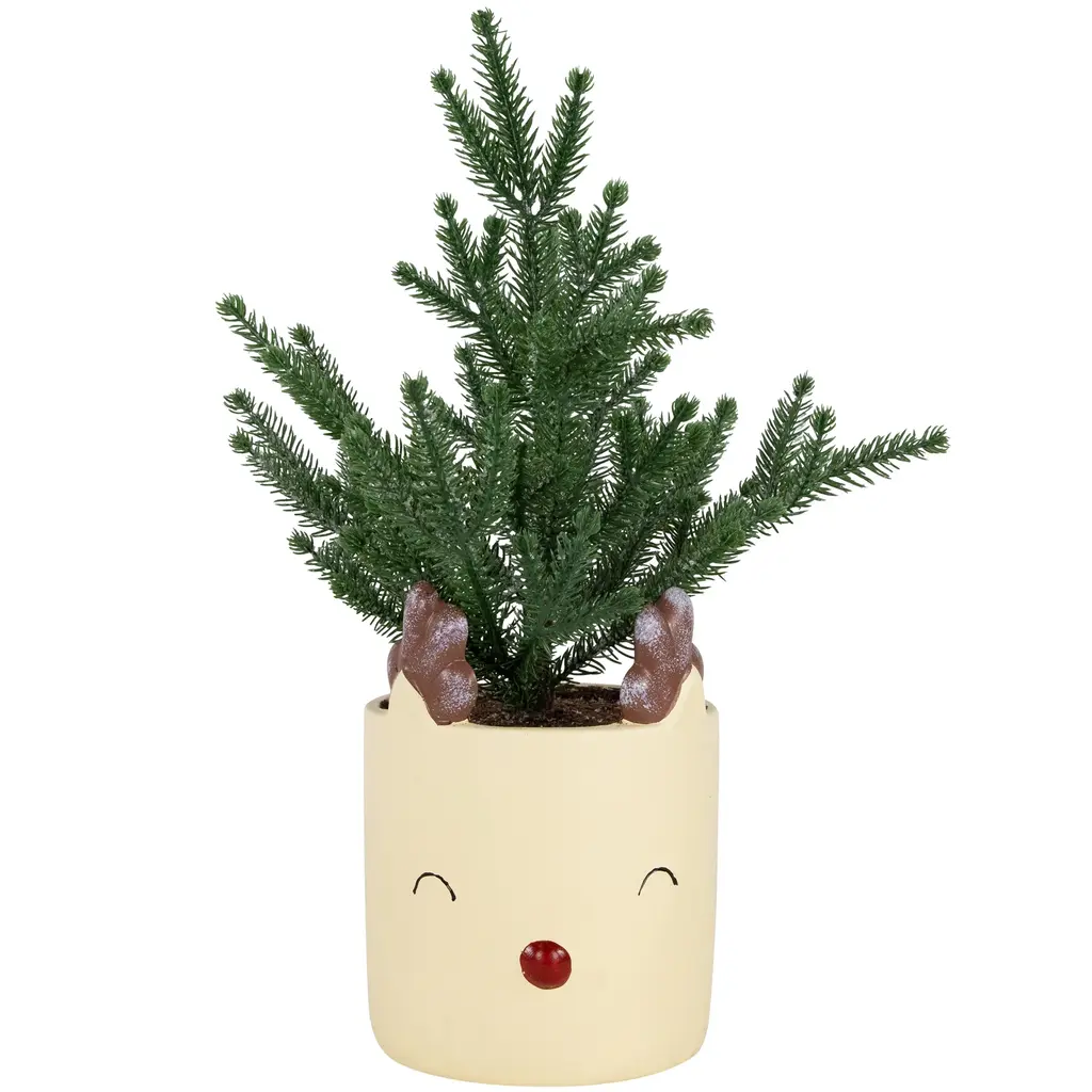 Add this petit Christmas tree to your holiday decor for a whimsical touch. It's nestled in a reindeer pot with a shiny red nose. This compact tree is ideal for smaller spaces, tabletops, or as a delightful addition to your table's centerpiece. Product Features: Unlit 7 tips Lightly frosted PE tapered molded tips Compact for smaller spaces Recommended for indoor use only Dimensions: 14.25" high x 7.75" diameter Pot: 6.75" high x 5" diameter Material(s): PE/ceramic Note:Branches are compressed for shipment, and need to be fluffed out upon arrival to look like the photo.