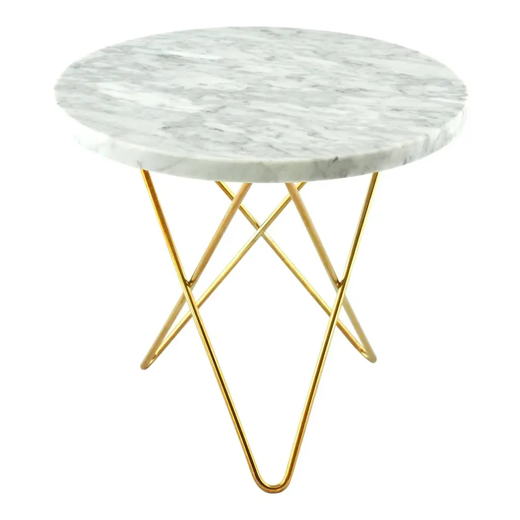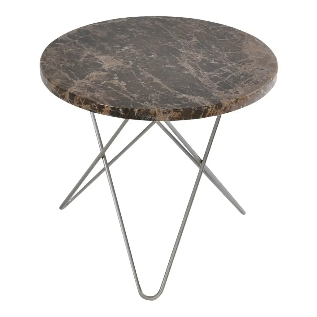 Frame made in stainless steel, powder coated steel or brass (steel with brass surface). Marble tops are to be screwed on to the metal frame. Glass tops can be clicked onto the frame. Leather tables will be delivered assembled. Table top in marble or porcelain will exhibit natural variations in terms of colour, drawings and patterns characteristic for each type of marble. As for Carrara Marble, small cracks can sometimes be found on the polished surface. This phenomenon known as “taroli" is a natural characteristic of the stone, which cannot be eliminated completely. Leather is handmade by skilled craftsmen using high-quality 100 % vegetable tanned aniline leather with a general thickness of 3 mm or more. Natural imperfections on leather surface must be accepted. With time, light and use, the leather will gain depth and lustre as it ages. Due to the highly artisan process used and variation in the natural raw material, leather can wary quite significantly in colour between production batches.