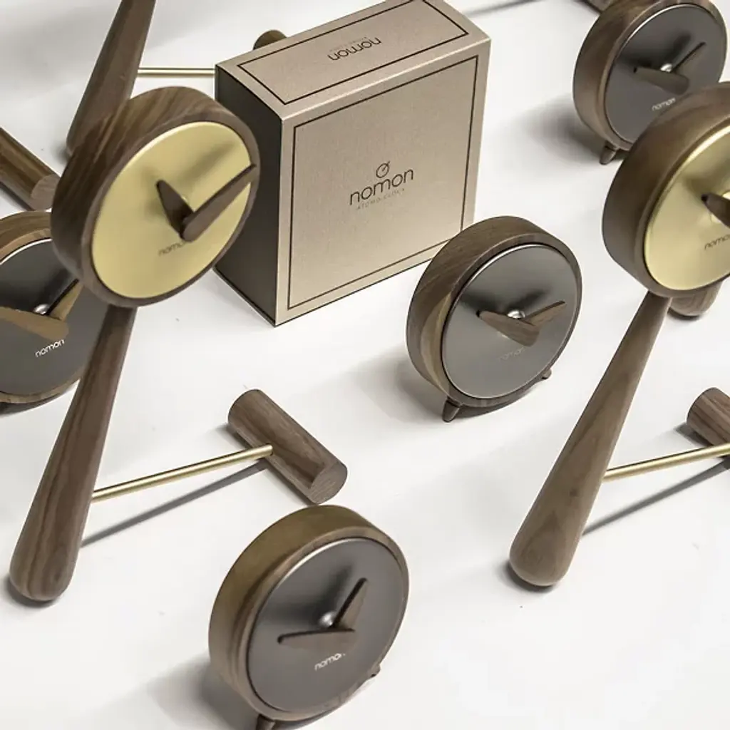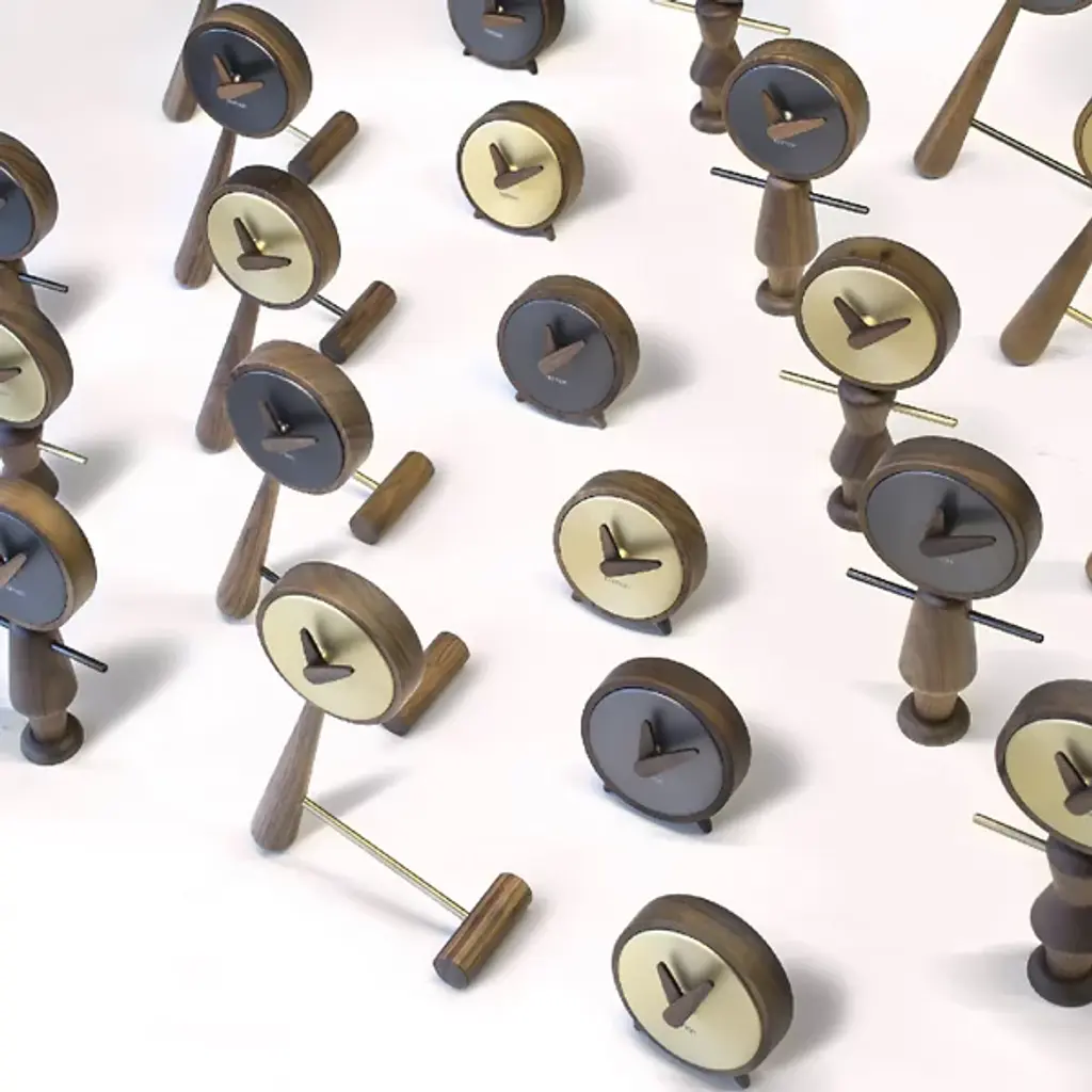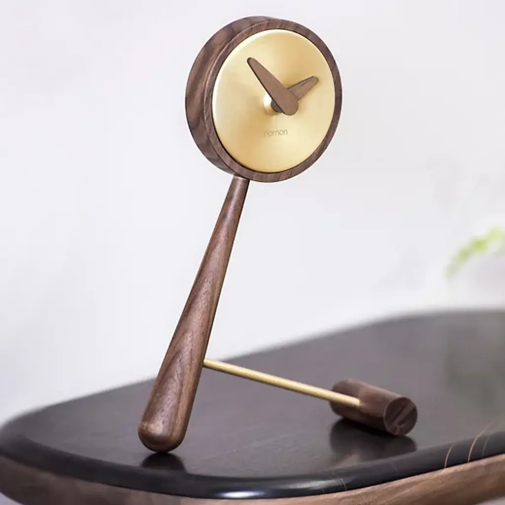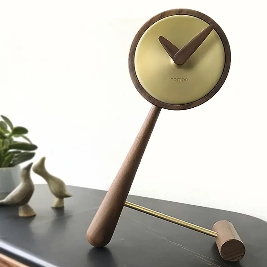 The most adorable functional accessory. The Mini Puntero Table Clock offers a table top a sense of playfulness. Features an intriguing leaning style design with beautiful walnut wooden details. Available is an option between a beautiful polished brass finish or sleek graphite steel for the center of the clock.