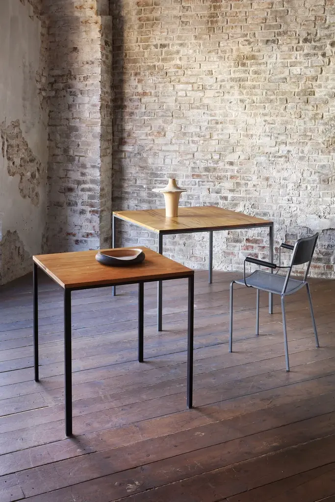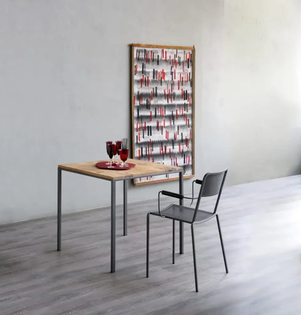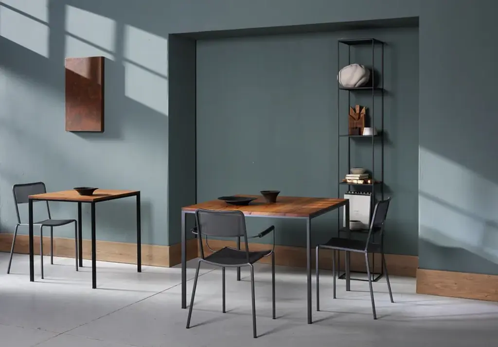 Minitavolo 2018 is a square table.Frame: Embossed black epoxy powder paintTop: HPL rusty finish / Solid aged oak wood