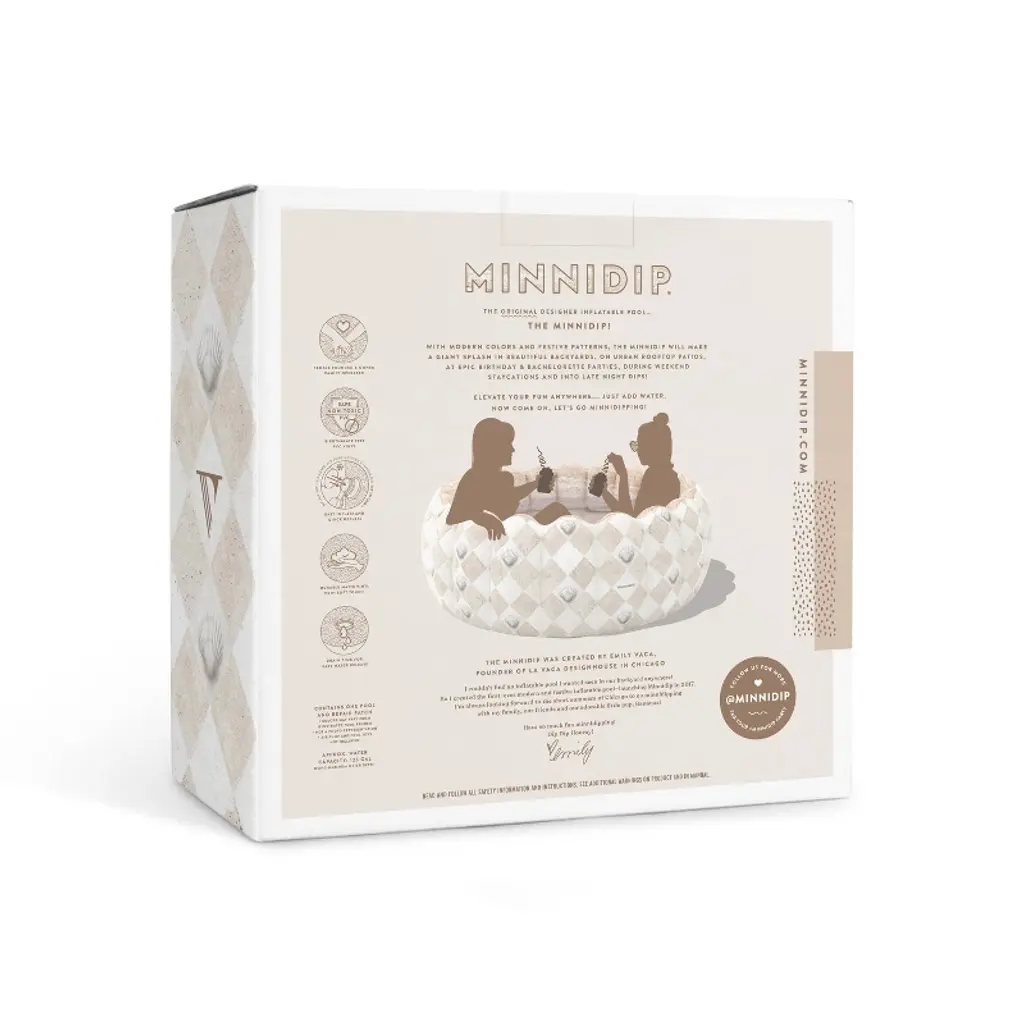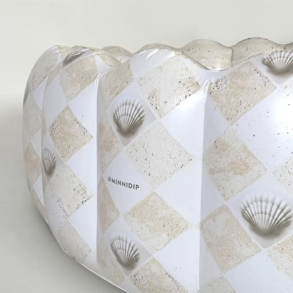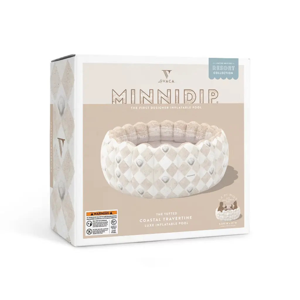 Designed in Chicago by Emily Vaca of La Vaca, the Tufted COASTAL TRAVERTINE Minnidip Luxe Inflatable Pool of the limited-edition, Target-exclusive 2025 Resort Collection turns your backyard into a chic resort destination on the Mediterranean coast. Inspired by the sandy beaches, iridescent shells, and sunwashed pastel-plastered walls that color the French Riviera, the checkered travertine tiles, carved stone, and pearlescent details of the Resort Collection encapsulate the nostalgia of beach clubs and shimmering "la mer" of the French Coast. Say "bon voyage" and dip into your Coastal Jetsetter era... without the jetlag. At 5.5 feet wide and 21" tall, and featuring Minnidip's iconic and patented scallop tufts, the Original “Adult Kiddie Pool” is big enough for a minnidipping pool party with your faves! Perfect for adults and children ages 6 and up. Dip Dip Hooray!The Minnidip COASTAL TRAVERTINE & COASTAL PEARL Resort Collection features the matching Tufted Pool, Tufted Minni-Minni Pool, Minni-Cove Lounge Pool, Fluted Arch Sprinkler with Pearl Garland, Shell Fountain Pool, Swan Fountain Sprinkler, Signature Fountain Sprinkler, Splash Pad, Tufted Cooler, Scalloped Ring Float, Pup Dip Dog Pool—all available and only at Target!