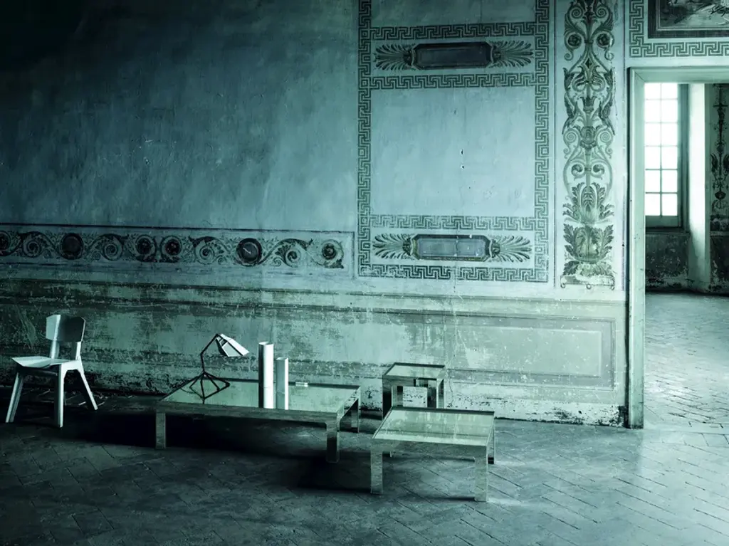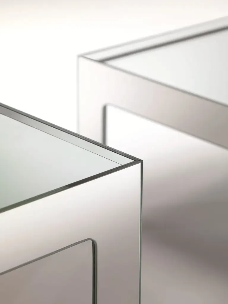 Collection of high tables, low tables and consoles available in different sizes, whose base is obtained by gluing 45° water jet cut laminated double faced mirror slabs. In the low tables the mirror top rests lower down within the base frame, so as to be contained by an upstand profile. In the hight tables and in the consoles the top instead is resting on the base frame.