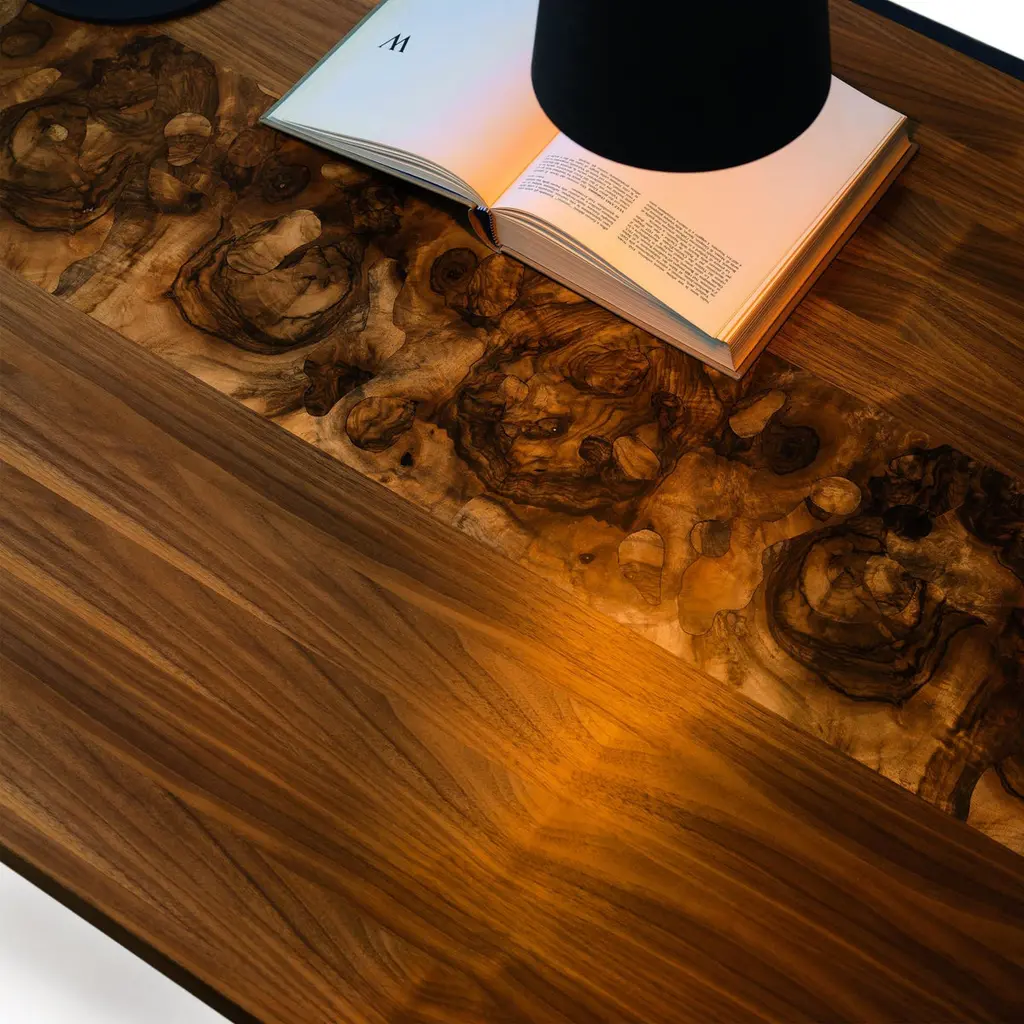A refined piece with a top made in fine solid walnut and premium walnut burl, the tonality and veins drawing vary from item to item, making it a unique piece. Handcrafted in Italy, it’s a stunning example of contemporary Italian quality. Base on rust iron and top 4 cm thick, the custom size is available since it’s a handmade piece. Available in different dimensions:W. 200/300 cm, D. 100 cm, H. 77 cmKg. 177/205.For customers within the European community: prices will have a 20% surcharge (VAT) to be verified during the negotiation phase.