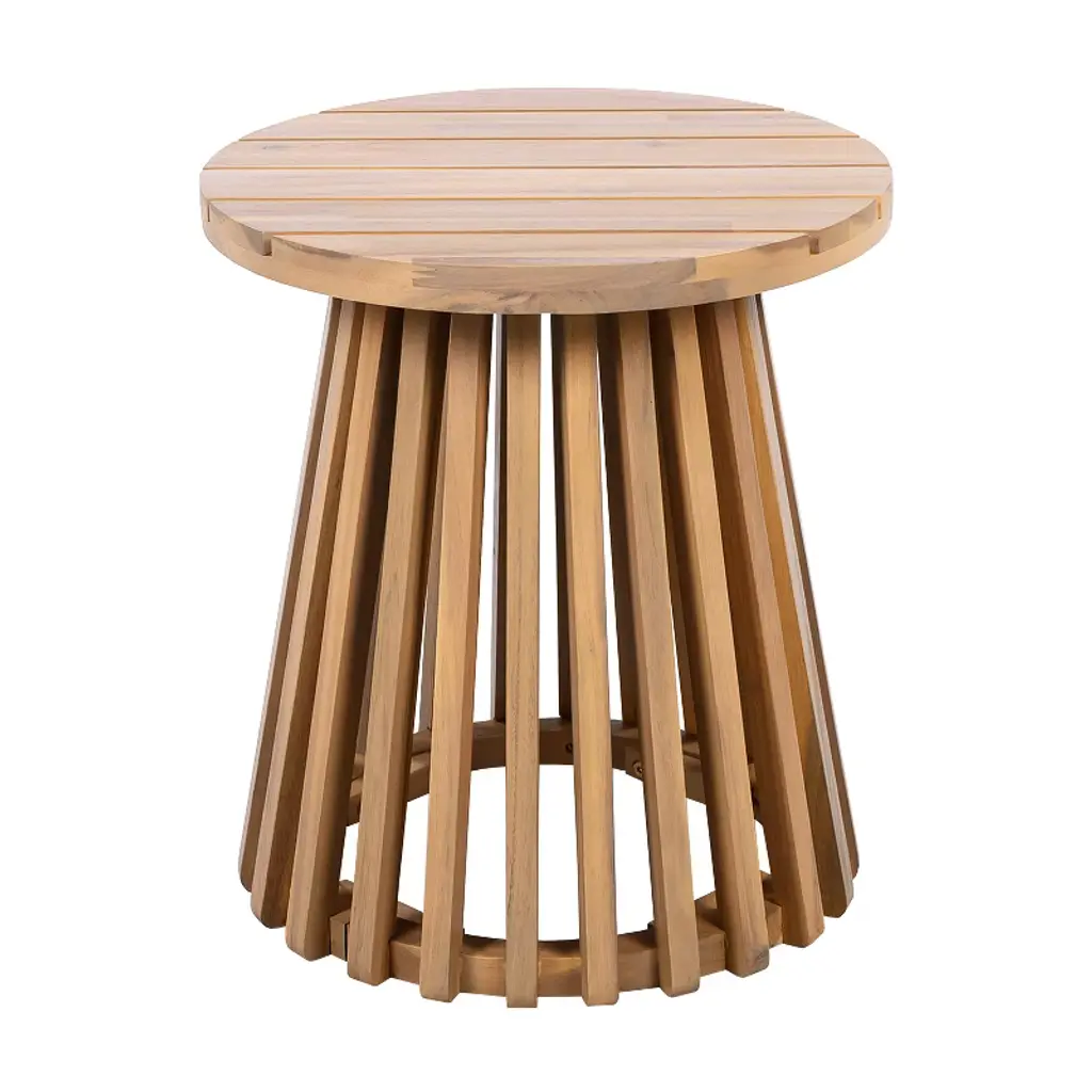 Add modern rustic charm to your outdoor living area with this round Acacia wood patio side table. Finished in a stylish light teak tone, this durable piece features a slatted top and an open-slat conical base that offers both stability and visual appeal. Ideal for placing drinks, snacks, or décor, it's the perfect companion for your lounge chairs or outdoor sofa. Crafted from solid Acacia hardwood, this side table is naturally resistant to weather and wear, making it a reliable accent piece for your patio, deck, balcony, or backyard.