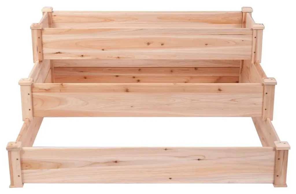 This wooden 3 tires elevated vegetable bed. This 4'' x 4'' garden bed is perfect for growing your plants and vegetables. With its step stair design, you can place various sized plants inside each level. Each section is approximately 7 inches higher than the next, giving plants ample space between each other to grow efficiently. It can not only be a beautiful decoration of your garden, but also can be used as a display stand, storage rack and so on. Solid wood construction makes this vegetable can serve you for a long time. - Brand new and high quality- Perfect for planting vegetables, herbs and flowers- Solid wood construction, serve you for a long time- 3 sections for planting different plants- Enough space giving plants ample space between each other to grow Simple assemble need Material: Cedar woodThickness of wood panel: 0.5"Overall dimension: 48.5" x 48.5" x 21.7"(L x W x H)Min box dimension: 47.0" x 16.7" x 7.0"(L x W)Middle box dimension: 47.0" x 32.5" x 7.0"(L x W)Max box dimension: 47.0" x 47.0" x 7.0"( L x W)Product weight: 31 lbsPackage include: 1 x 3 Tires vegetable planter