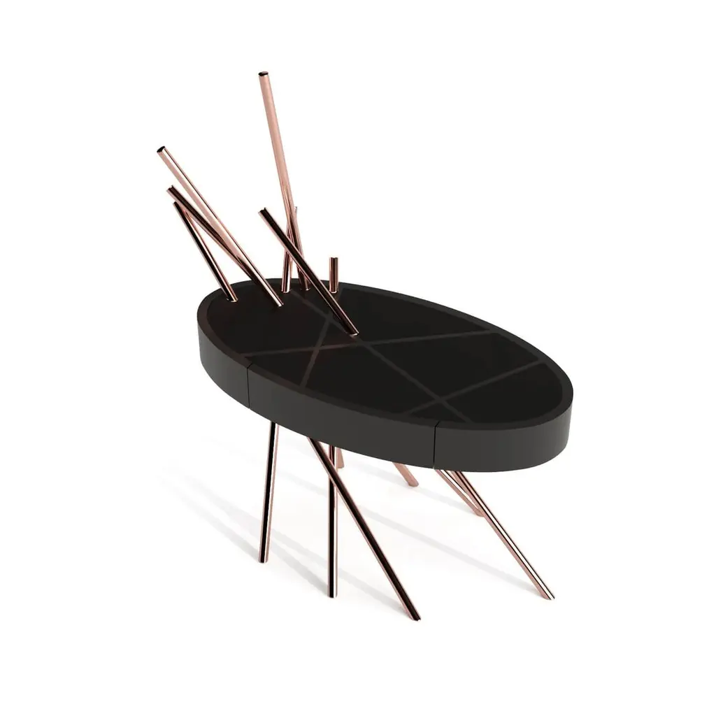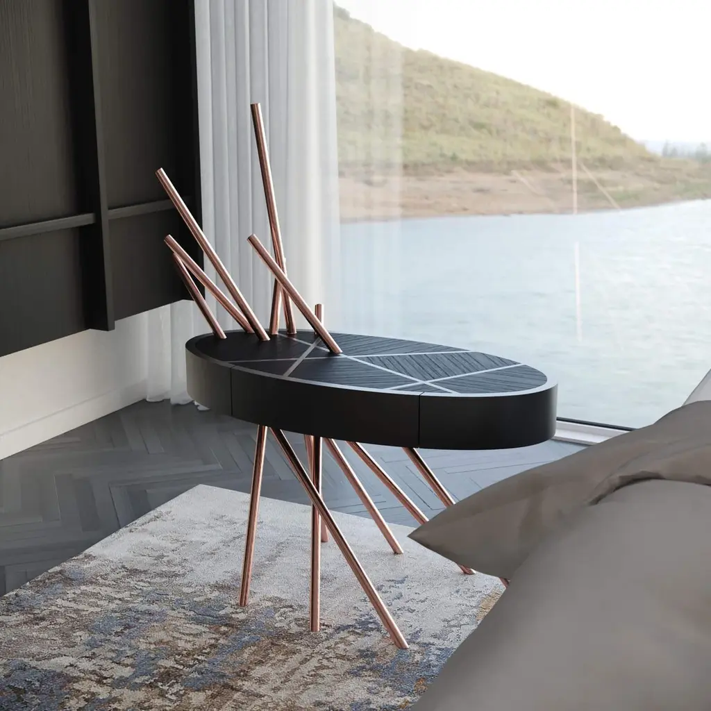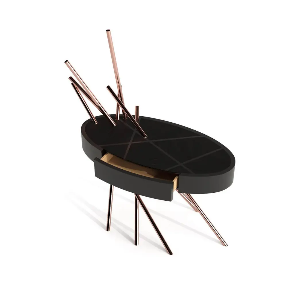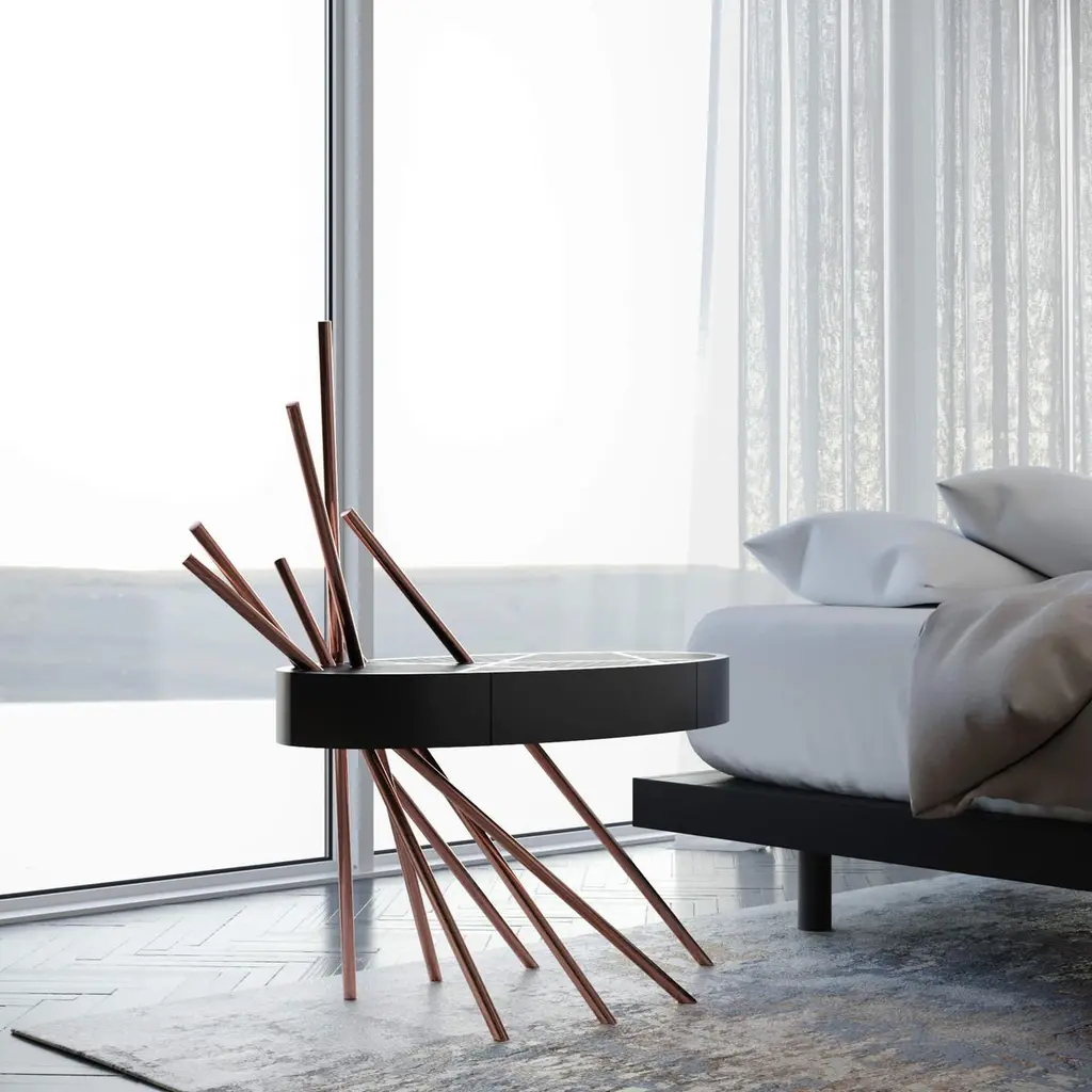 The Mikado Collection is inspired by the game "Pick a Stick" we used to play in childhood. Tubes of thick copper, which remind us of the Mikado sticks game, are cut at precise angles and fitted with great accuracy in the furniture, providing much-needed support. Each tube can hold a flower, making this table even more surprising and unique.Although designed as a bedside table, this piece can also be used as a side table in your living room. Its form is light and fluid, with the tabletop appearing to float over the finely crafted legs. Many consider this piece a work of art, like a sculpture. The listed piece is mastercrafted of carefully selected black oak wood, black lacquered wood, and handmade brushed copper. However, we can also manufacture this table in customised options. Structure: Stainless steel (polished or brushed); brass (polished or brushed); or copper (polished or brushed). The polished or brushed finish is handmade by the author.Tabletop: Another kind of wood (walnut, tineo, ebony macassar, ironwood) or lacquer colour.Custom dimensions are only available after analysis.In all its versions, the bedside table houses a discrete drawer in a different wood veneer, which adds a surprising touch. Assembled piece.You can try this piece in your space using Augmented Reality on your mobile phone (available on our Mikado Collection website).In 2018, it won a "Silver A' Design Award" in the "Furniture, Decorative Items, and Homeware Design" category.This piece is entirely made in Portugal and manufactured artisanally. The author carefully executed or supervised every process step in a small workshop context.Labour of love from Portugal.Designer/Author - Joao Faria/Emotional Objects.Manufacturer - Joao Faria/Emotional Objects.At Emotional Objects, we don't follow trends or fashion. Instead, we create distinct and timeless objects with solid ideas and concepts. Every Emotional Object has a meaningful story behind it. Made to last for generations, we proudly see our objects as future furniture classics that will stand the test of time.Working in Portugal with the best artisans, the distinction between functional and fine art is difficult to find in Joao Faria's work. He uses the finest materials and techniques, but, most importantly, he only makes pieces he would want for himself.Art Furniture, Unique, Tailored, Emotional, Truly Yours.