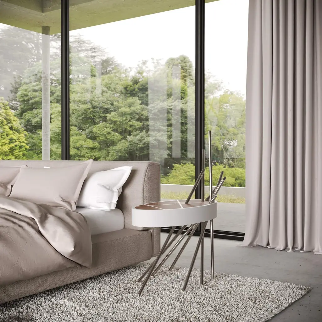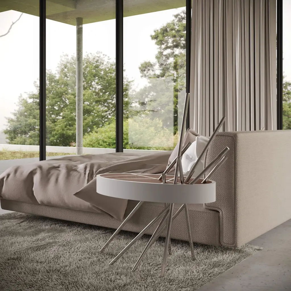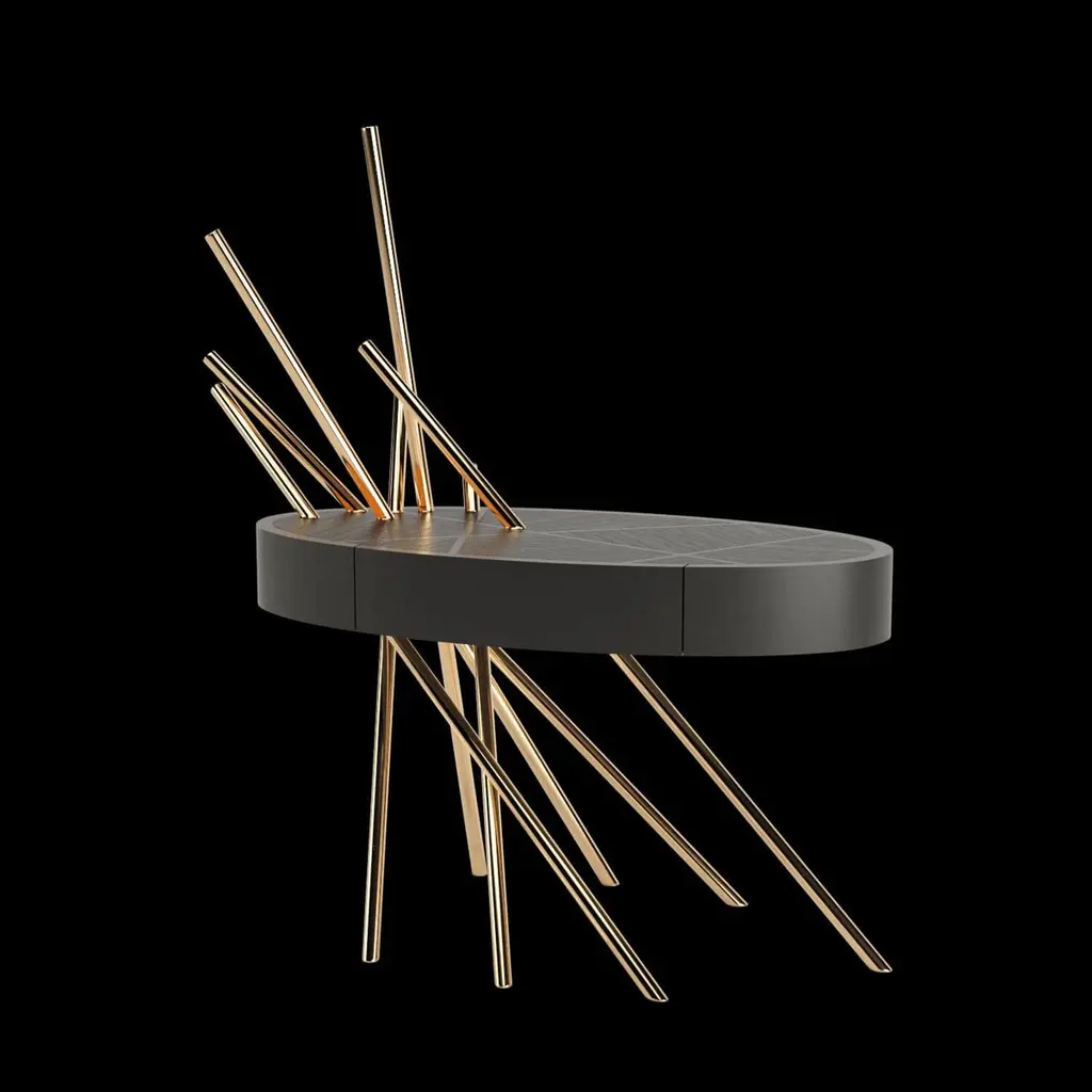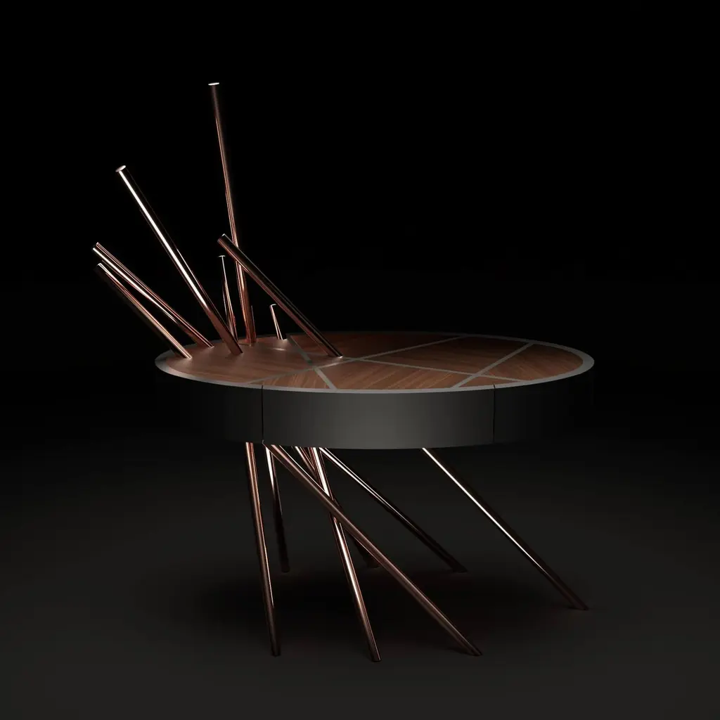The Mikado Collection is inspired by the game "Pick a Stick" we used to play in childhood. Tubes of thick copper, which remind us of the Mikado sticks game, are cut at precise angles and fitted with great accuracy in the furniture, providing much-needed support. Each tube can hold a flower, making this table even more surprising and unique.Although designed as a bedside table, this piece can also be used as a side table in your living room. Its form is light and fluid, with the tabletop appearing to float over the finely crafted legs. Many consider this piece a work of art, like a sculpture. The listed piece is mastercrafted of carefully selected black oak wood, black lacquered wood, and handmade brushed copper. However, we can also manufacture this table in customised options. Structure: Stainless steel (polished or brushed); brass (polished or brushed); or copper (polished or brushed). The polished or brushed finish is handmade by the author.Tabletop: Another kind of wood (walnut, tineo, ebony macassar, ironwood) or lacquer colour.Custom dimensions are only available after analysis.In all its versions, the bedside table houses a discrete drawer in a different wood veneer, which adds a surprising touch. Assembled piece.You can try this piece in your space using Augmented Reality on your mobile phone (available on our Mikado Collection website).In 2018, it won a "Silver A' Design Award" in the "Furniture, Decorative Items, and Homeware Design" category.This piece is entirely made in Portugal and manufactured artisanally. The author carefully executed or supervised every process step in a small workshop context.Labour of love from Portugal.Designer/Author - Joao Faria/Emotional Objects.Manufacturer - Joao Faria/Emotional Objects.At Emotional Objects, we don't follow trends or fashion. Instead, we create distinct and timeless objects with solid ideas and concepts. Every Emotional Object has a meaningful story behind it. Made to last for generations, we proudly see our objects as future furniture classics that will stand the test of time.Working in Portugal with the best artisans, the distinction between functional and fine art is difficult to find in Joao Faria's work. He uses the finest materials and techniques, but, most importantly, he only makes pieces he would want for himself.Art Furniture, Unique, Tailored, Emotional, Truly Yours.