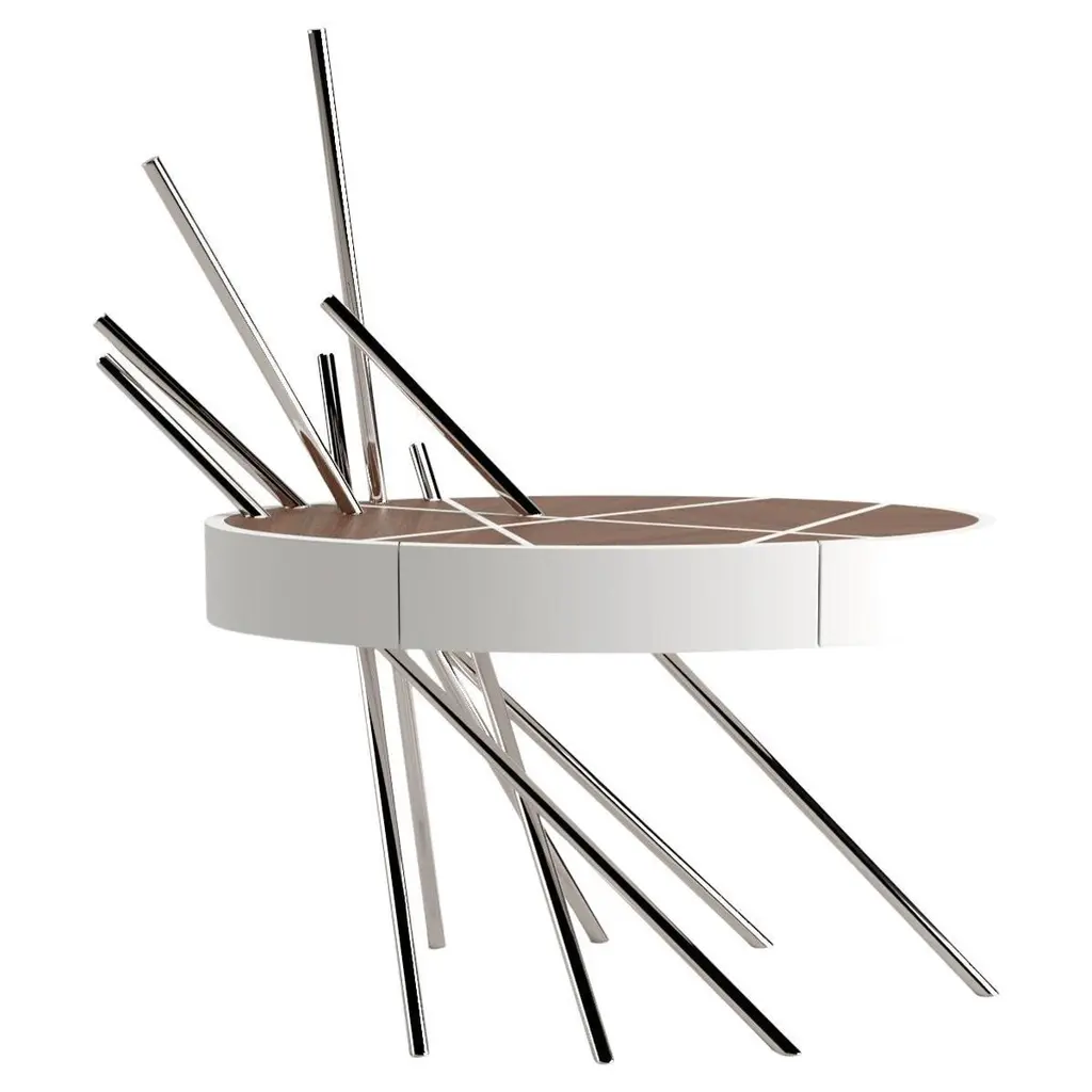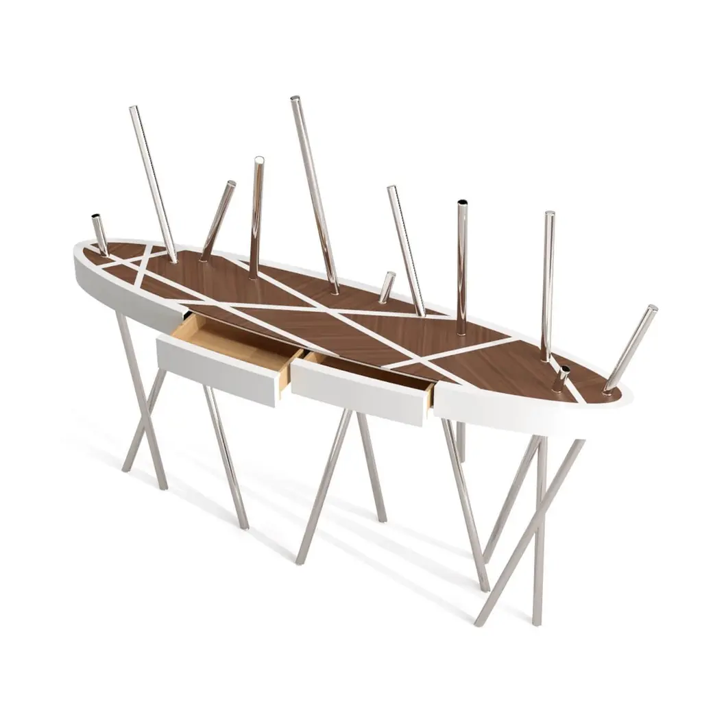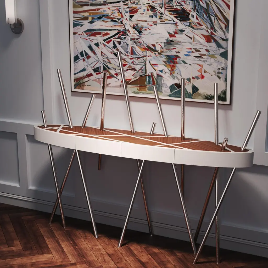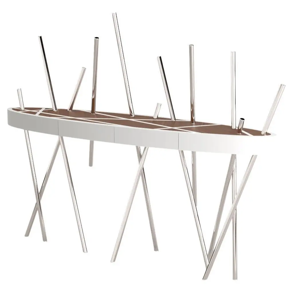 The Mikado Collection is inspired by the game "Pick a Stick" we used to play in childhood. Tubes of thick stainless steel, which remind us of the Mikado sticks game, are cut at precise angles and fitted with great accuracy in the furniture, providing much-needed support. Each tube can hold a flower, making this console table even more surprising and unique.The Console Table is designed as an entryway table. Its form is light and fluid, with the tabletop appearing to float over the finely crafted legs. Many consider this piece a work of art, like a sculpture. The listed piece is mastercrafted of carefully selected walnut wood, white lacquered wood, and handmade brushed stainless steel. However, we can also manufacture this table in customised options. Structure: Stainless steel (polished or brushed); brass (polished or brushed); or copper (polished or brushed). The polished or brushed finish is handmade by the author.Tabletop: Another kind of wood (black oak, tineo, ebony macassar, ironwood) or lacquer colour.Custom dimensions are only available after analysis.In all its versions, the console houses two discrete drawers in a different wood veneer, which adds a surprising touch. Needs simple assembly.You can try this piece in your space using Augmented Reality on your mobile phone (available on our website, Mikado Collection).In 2018, it won a "Silver A' Design Award" in the "Furniture, Decorative Items, and Homeware Design" category.This piece is entirely made in Portugal and manufactured artisanally. The author carefully executed or supervised every process step in a small workshop context.Labour of love from Portugal.Designer/Author - João Faria/Emotional Objects.Manufacturer - João Faria/Emotional Objects.At Emotional Objects, we don't follow trends or fashion. Instead, we create distinct and timeless objects with solid ideas and concepts. Every Emotional Object has a meaningful story behind it. Made to last for generations, we proudly see our objects as future furniture classics that will stand the test of time.Working in Portugal with the best artisans, the distinction between functional and fine art is difficult to find in Joao Faria's work. He uses the finest materials and techniques, but, most importantly, he only makes pieces he would want for himself.Art Furniture, Unique, Tailored, Emotional, Truly Yours.