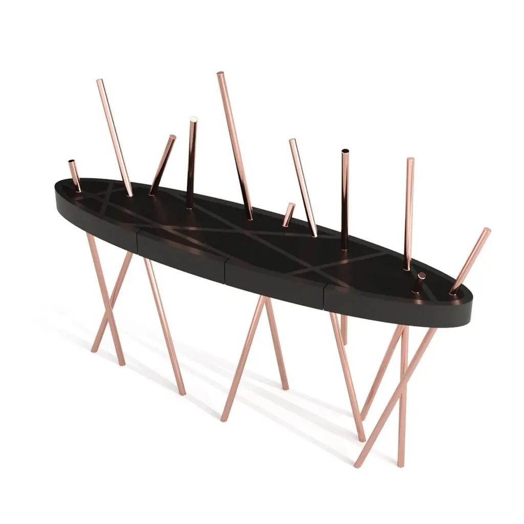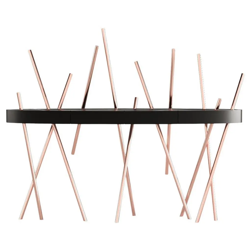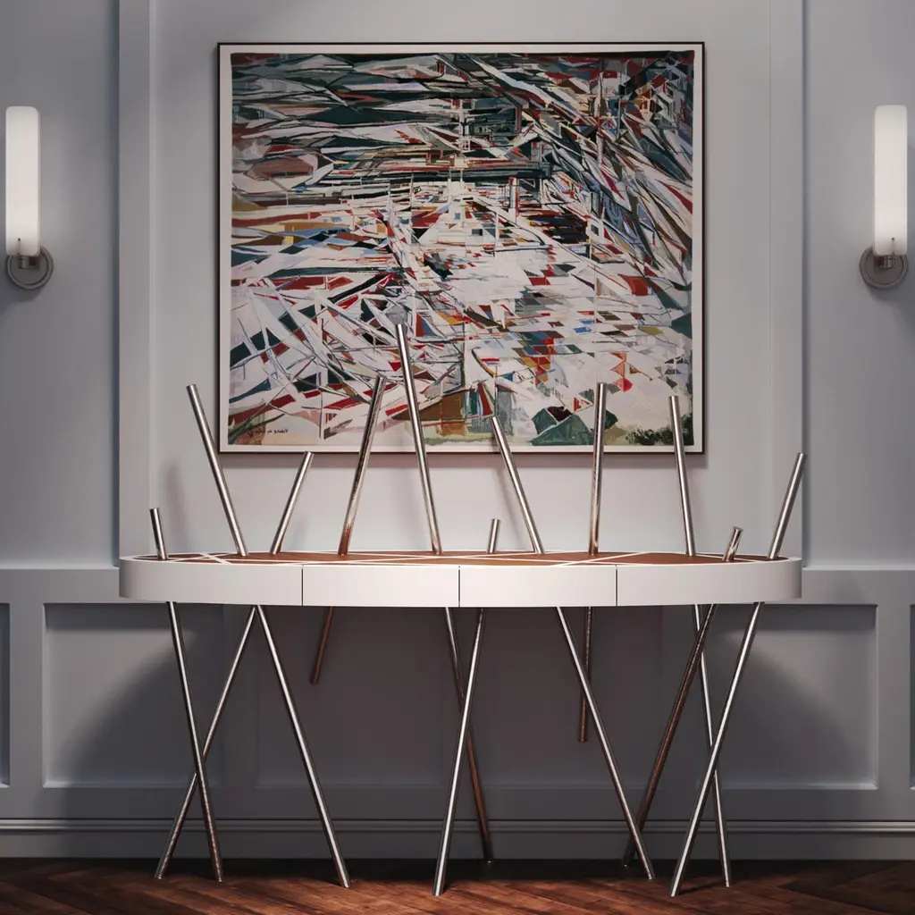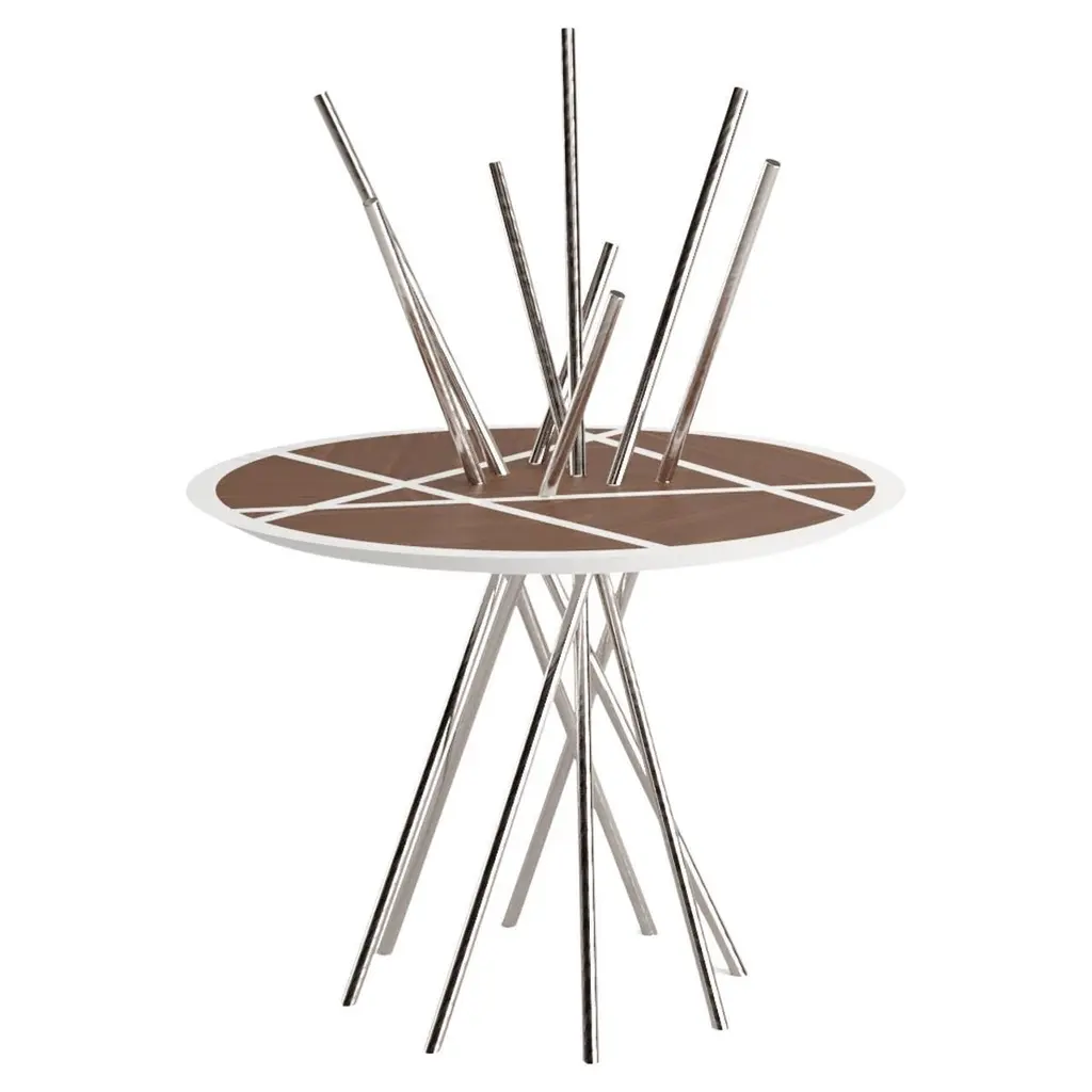 The Mikado Collection is inspired by the game "Pick a Stick" we used to play in childhood. Tubes of thick stainless steel, which remind us of the Mikado sticks game, are cut at precise angles and fitted with great accuracy in the furniture, providing much-needed support. Each tube can hold a flower, making this console table even more surprising and unique.The Console Table is designed as an entryway table. Its form is light and fluid, with the tabletop appearing to float over the finely crafted legs. Many consider this piece a work of art, like a sculpture. The listed piece is mastercrafted of carefully selected walnut wood, white lacquered wood, and handmade brushed stainless steel. However, we can also manufacture this table in customised options. Structure: Stainless steel (polished or brushed); brass (polished or brushed); or copper (polished or brushed). The polished or brushed finish is handmade by the author.Tabletop: Another kind of wood (black oak, tineo, ebony macassar, ironwood) or lacquer colour.Custom dimensions are only available after analysis.In all its versions, the console houses two discrete drawers in a different wood veneer, which adds a surprising touch. Needs simple assembly.You can try this piece in your space using Augmented Reality on your mobile phone (available on our website, Mikado Collection).In 2018, it won a "Silver A' Design Award" in the "Furniture, Decorative Items, and Homeware Design" category.This piece is entirely made in Portugal and manufactured artisanally. The author carefully executed or supervised every process step in a small workshop context.Labour of love from Portugal.Designer/Author - João Faria/Emotional Objects.Manufacturer - João Faria/Emotional Objects.At Emotional Objects, we don't follow trends or fashion. Instead, we create distinct and timeless objects with solid ideas and concepts. Every Emotional Object has a meaningful story behind it. Made to last for generations, we proudly see our objects as future furniture classics that will stand the test of time.Working in Portugal with the best artisans, the distinction between functional and fine art is difficult to find in Joao Faria's work. He uses the finest materials and techniques, but, most importantly, he only makes pieces he would want for himself.Art Furniture, Unique, Tailored, Emotional, Truly Yours.