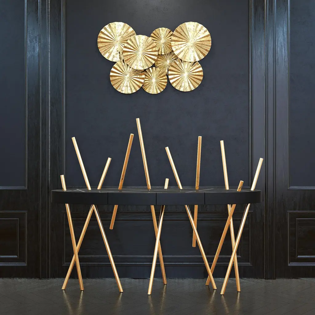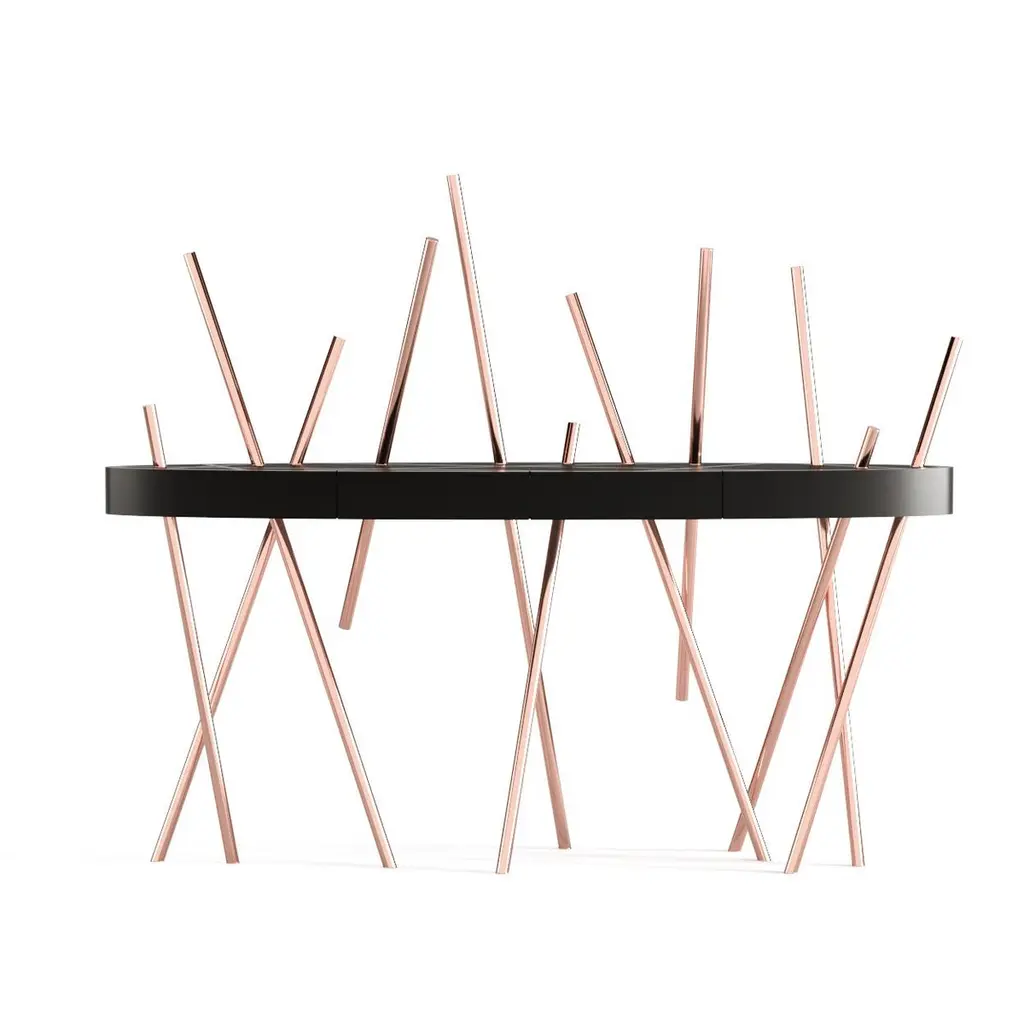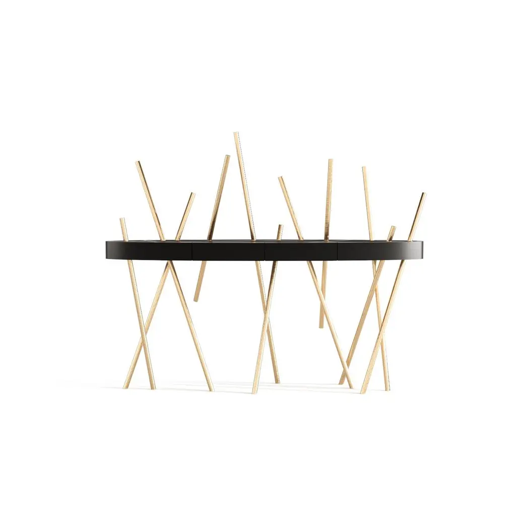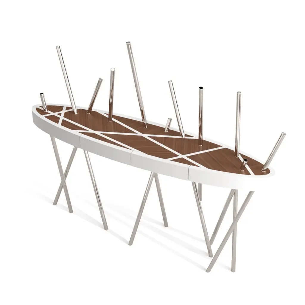 The Mikado Collection is inspired by the game "Pick a Stick" we used to play in childhood. Tubes of thick stainless steel, which remind us of the Mikado sticks game, are cut at precise angles and fitted with great accuracy in the furniture, providing much-needed support. Each tube can hold a flower, making this console table even more surprising and unique.The Console Table is designed as an entryway table. Its form is light and fluid, with the tabletop appearing to float over the finely crafted legs. Many consider this piece a work of art, like a sculpture. The listed piece is mastercrafted of carefully selected walnut wood, white lacquered wood, and handmade brushed stainless steel. However, we can also manufacture this table in customised options. Structure: Stainless steel (polished or brushed); brass (polished or brushed); or copper (polished or brushed). The polished or brushed finish is handmade by the author.Tabletop: Another kind of wood (black oak, tineo, ebony macassar, ironwood) or lacquer colour.Custom dimensions are only available after analysis.In all its versions, the console houses two discrete drawers in a different wood veneer, which adds a surprising touch. Needs simple assembly.You can try this piece in your space using Augmented Reality on your mobile phone (available on our website, Mikado Collection).In 2018, it won a "Silver A' Design Award" in the "Furniture, Decorative Items, and Homeware Design" category.This piece is entirely made in Portugal and manufactured artisanally. The author carefully executed or supervised every process step in a small workshop context.Labour of love from Portugal.Designer/Author - João Faria/Emotional Objects.Manufacturer - João Faria/Emotional Objects.At Emotional Objects, we don't follow trends or fashion. Instead, we create distinct and timeless objects with solid ideas and concepts. Every Emotional Object has a meaningful story behind it. Made to last for generations, we proudly see our objects as future furniture classics that will stand the test of time.Working in Portugal with the best artisans, the distinction between functional and fine art is difficult to find in Joao Faria's work. He uses the finest materials and techniques, but, most importantly, he only makes pieces he would want for himself.Art Furniture, Unique, Tailored, Emotional, Truly Yours.