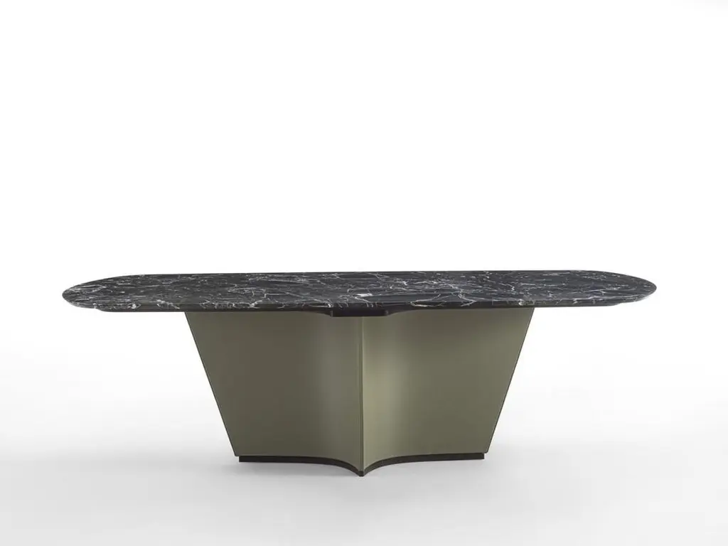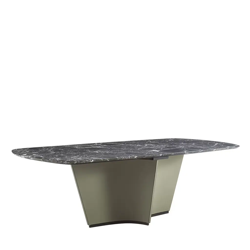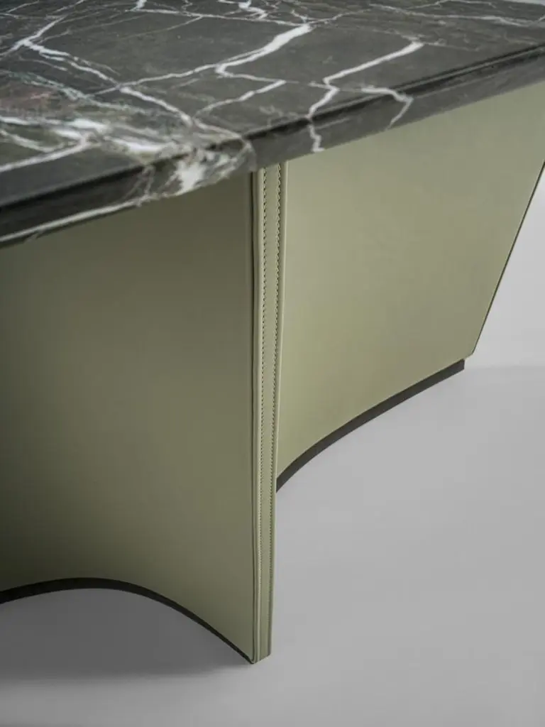 Table with sculptural cruciform base fully upholstered in leather. The FM08B green Lepanto marble top is chamfered at the bottom, and the base profile is in dark Tay (TA73B), also available in Tay Chiaro (TA73C) and Canaletto Walnut (TA73).