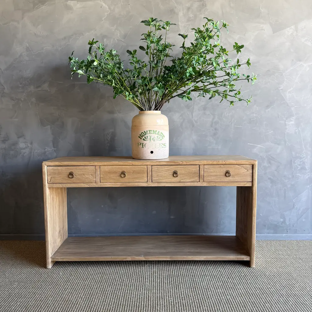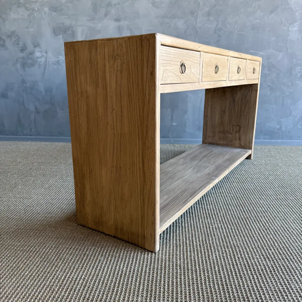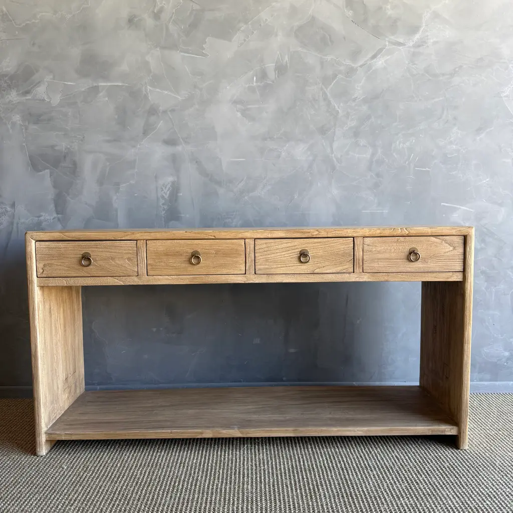 IVAN NATURAL CONSOLE TABLE Natural reclaimed elm wood that is beautifully crafted and serves as the perfect storage solution for any space. Since this is made from vintage reclaimed materials, there may be some imperfections in the piece or grain of the wood. We like to call that character. Please note this item is hand-crafted and slight variations can be expected from piece to piece. Console 58”w x 16”d x 30”h Clearance from shelf to drawer 19.5”h