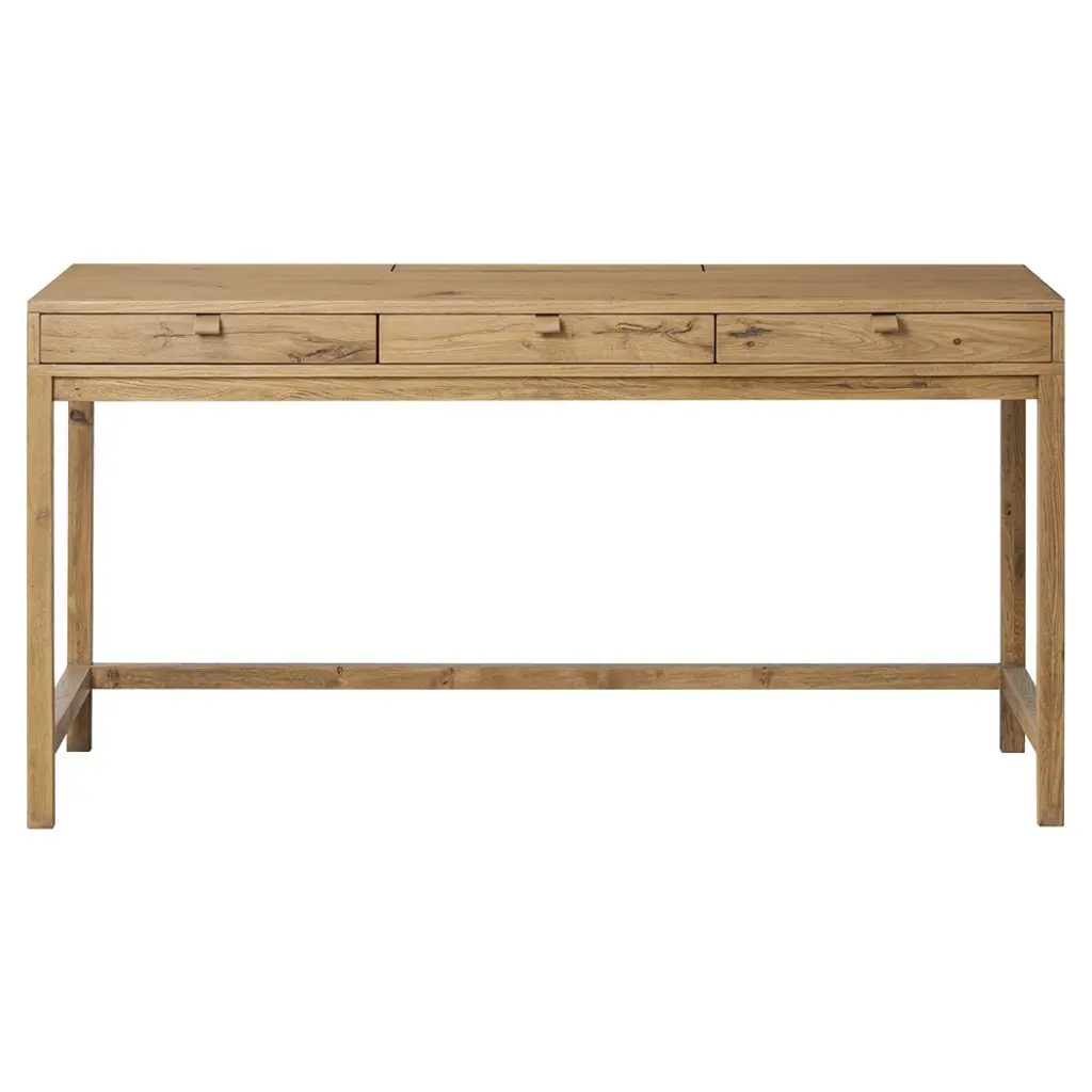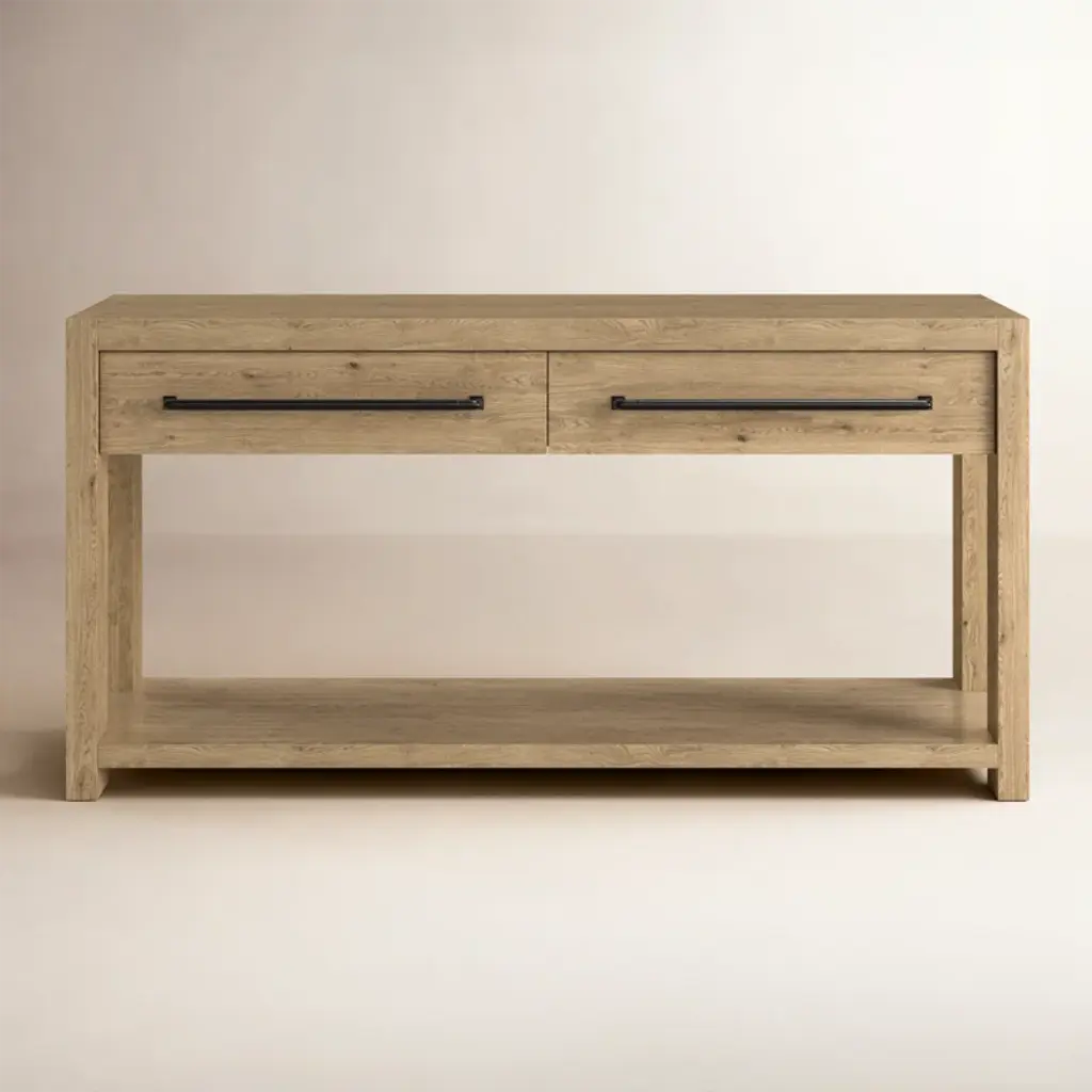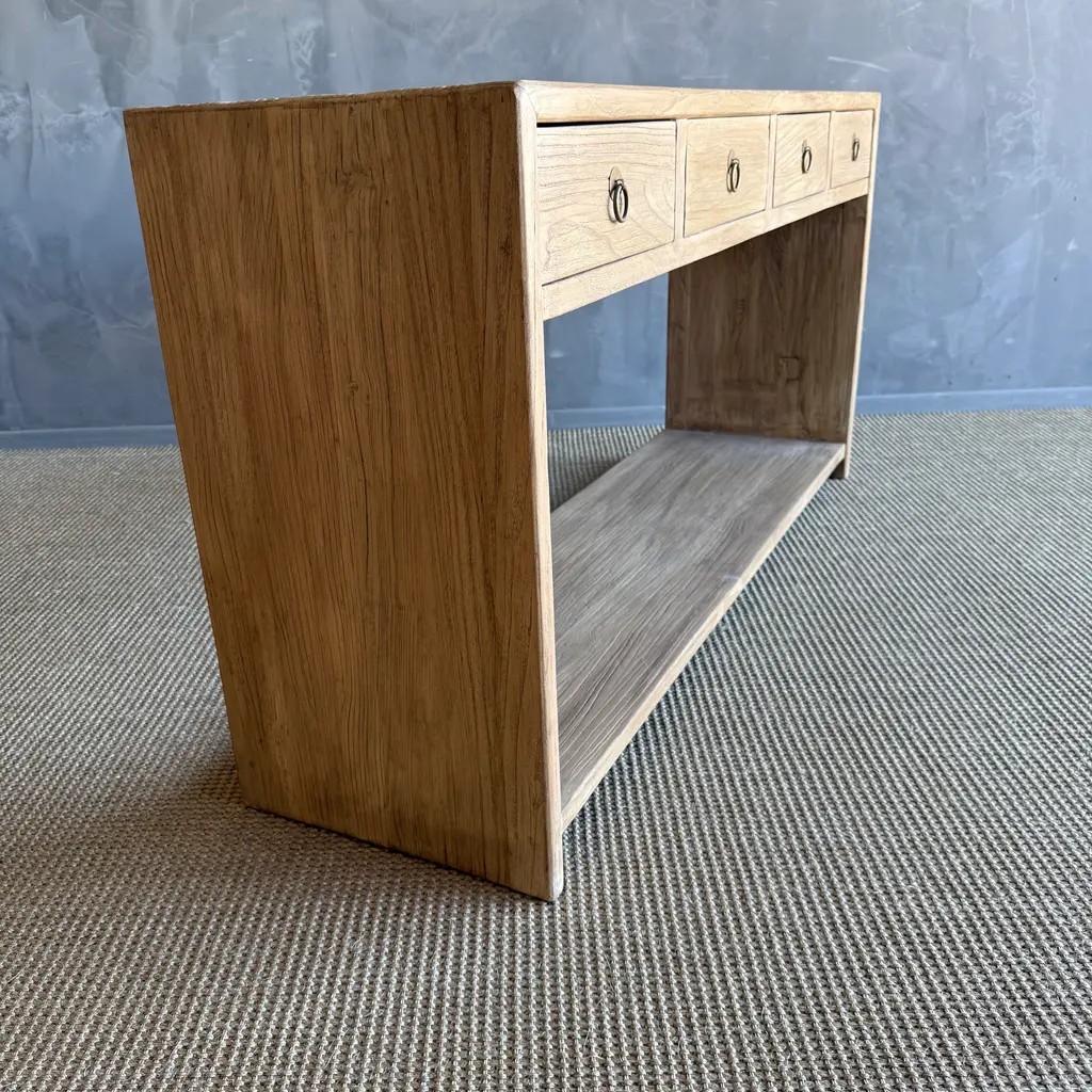 IVAN NATURAL CONSOLE TABLE Natural reclaimed elm wood that is beautifully crafted and serves as the perfect storage solution for any space. Since this is made from vintage reclaimed materials, there may be some imperfections in the piece or grain of the wood. We like to call that character. Please note this item is hand-crafted and slight variations can be expected from piece to piece. Console 58”w x 16”d x 30”h Clearance from shelf to drawer 19.5”h