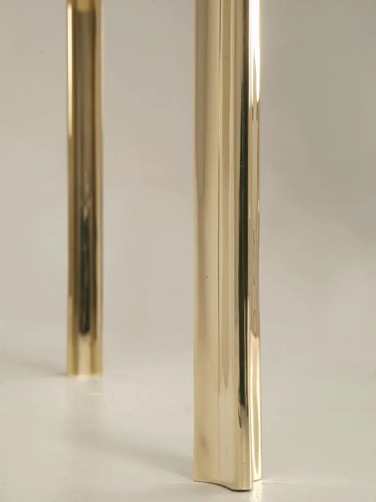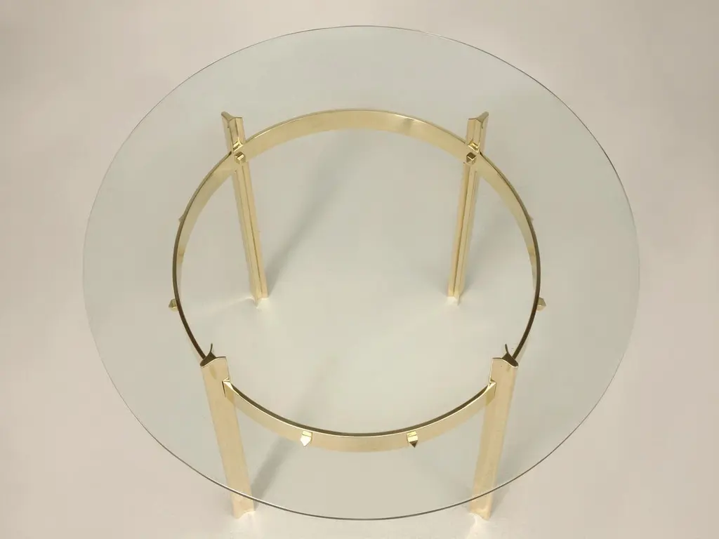 Mid-Century Modern French inspired design, that we hand-make in several dimensions. The table base is constructed from solid bronze, although brass is available for an additional charge. Four cast grooved solid bronze legs are connected with a polished bronze band offering not only stability, but adding a bit more style to this already engaging table.