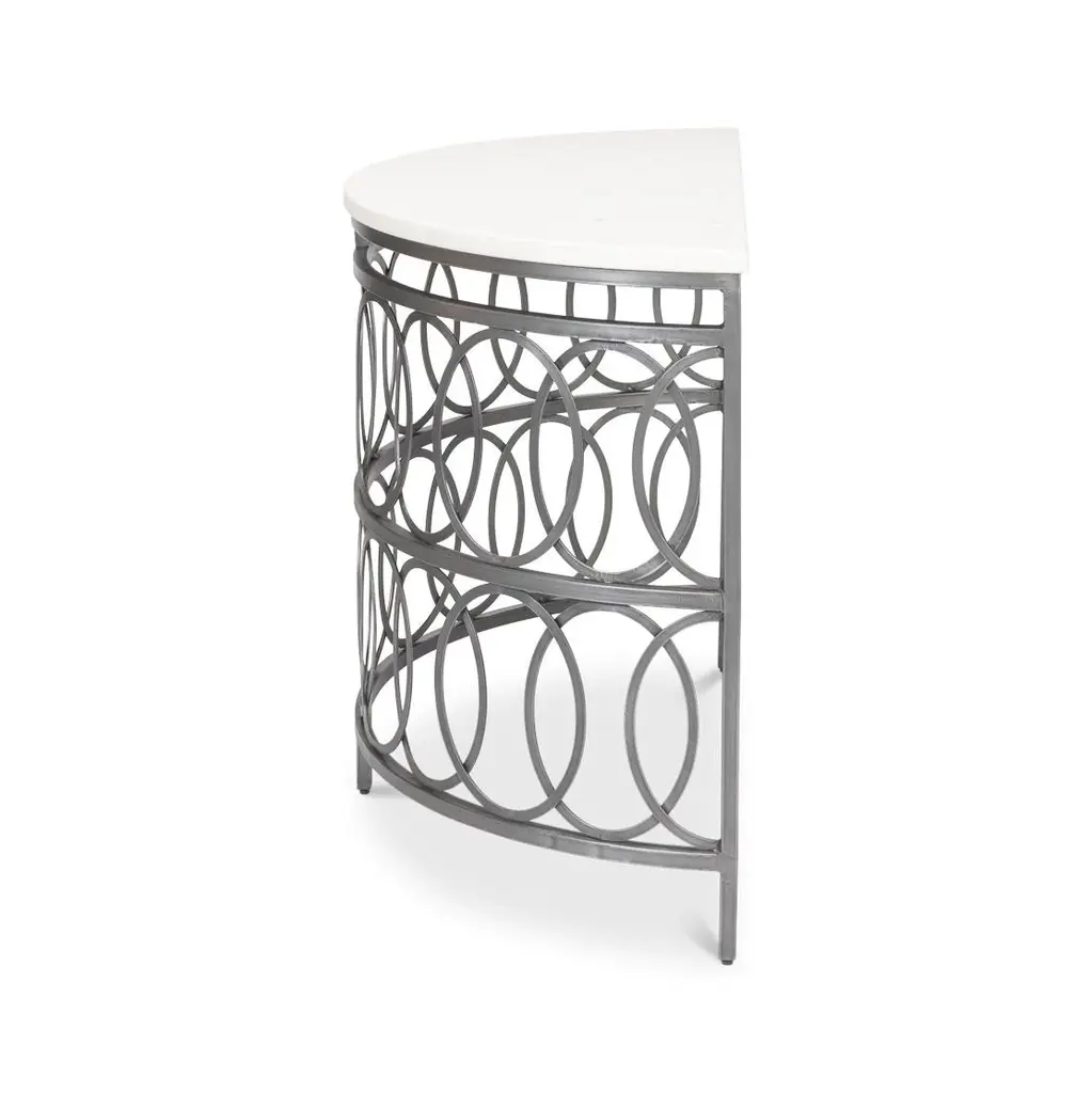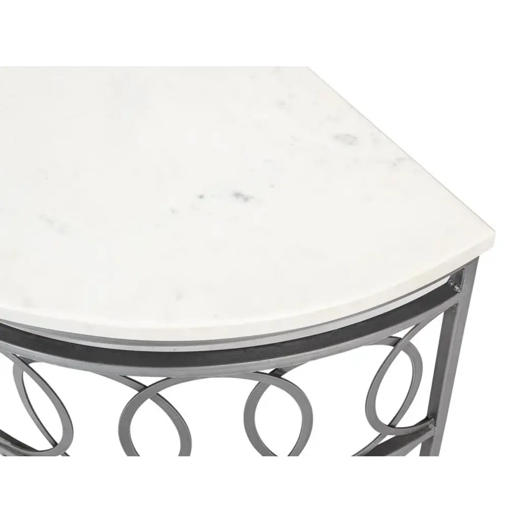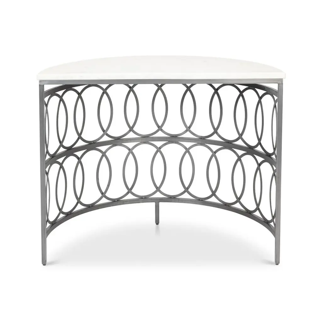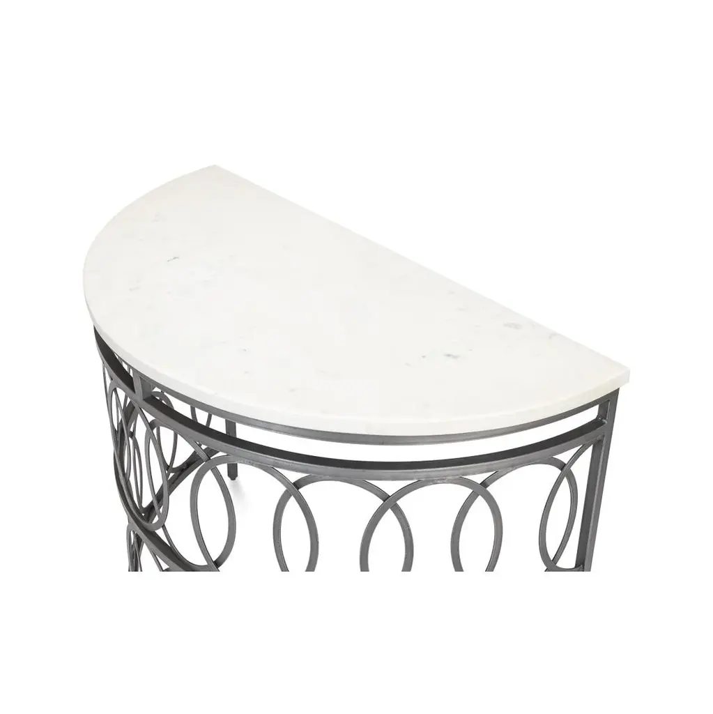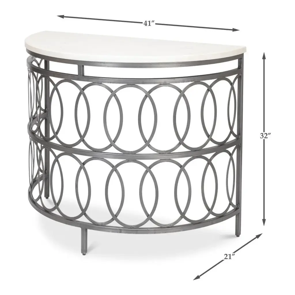 A stunning fusion of Art Deco-inspired elegance and industrial charm. The striking demi-lune shape is framed by a meticulously crafted iron base, featuring an interlocking ring motif that adds geometric sophistication. The sleek, white Banswara marble top offers a luxurious contrast to the sturdy metal frame, making this console a timeless addition to any entryway, hallway, or living space. Dimensions: 41" W x 21" D x 32" H