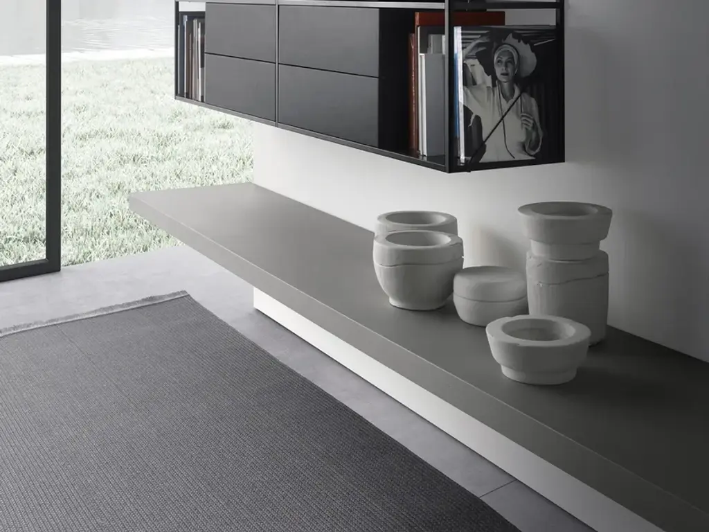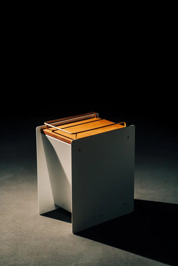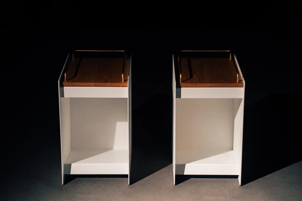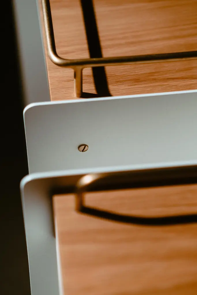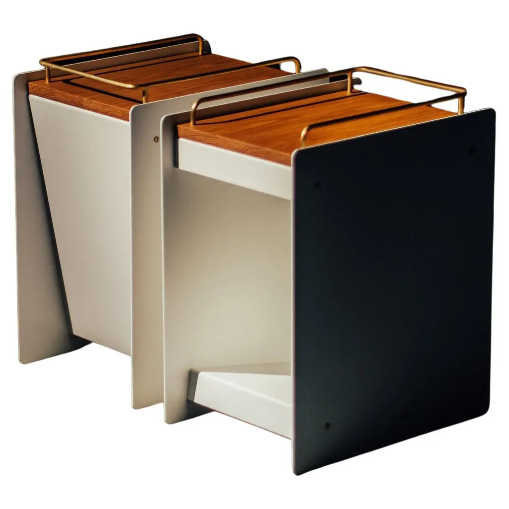 J CONSOLESpray-finished aluminum shown in oyster white with optional oak top and brass railsDimensions: 12” W x 17” D x 20” H Made-to-order