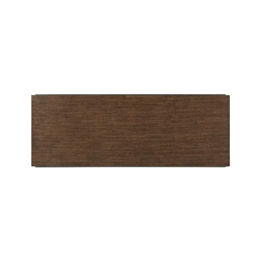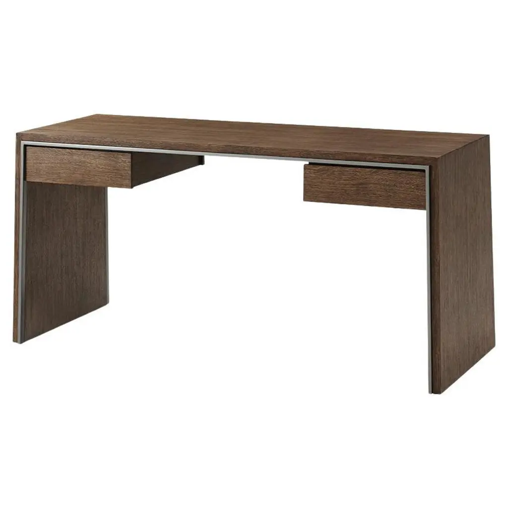 A modern dark brushed oak writing table with our Charteris finish. This desk has gently splayed solid end supports and a matte tungsten silhouette and it has two suspended frieze drawers. Dimensions: 66" W x 26" D x 31" H Soft Closing Drawer Runners